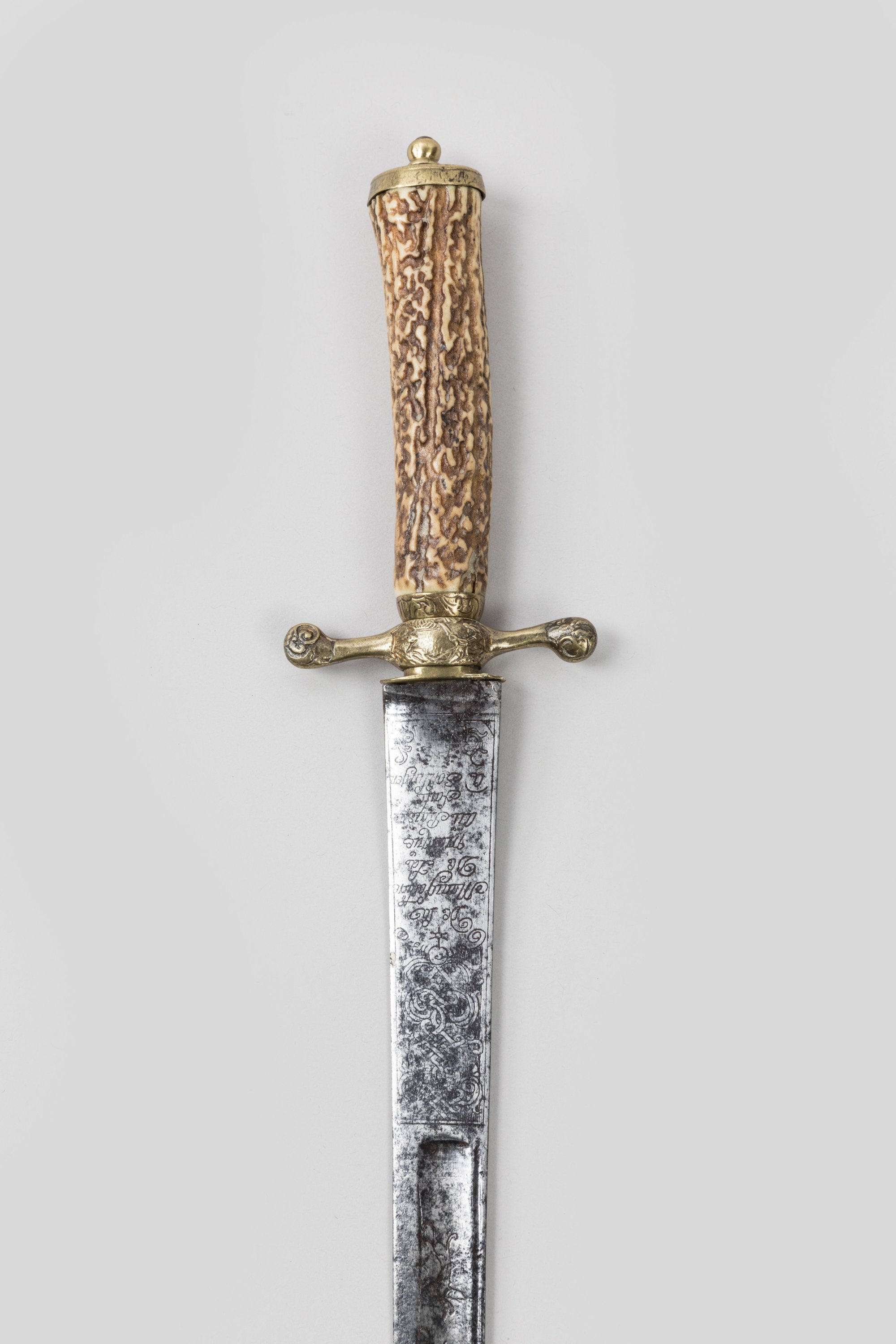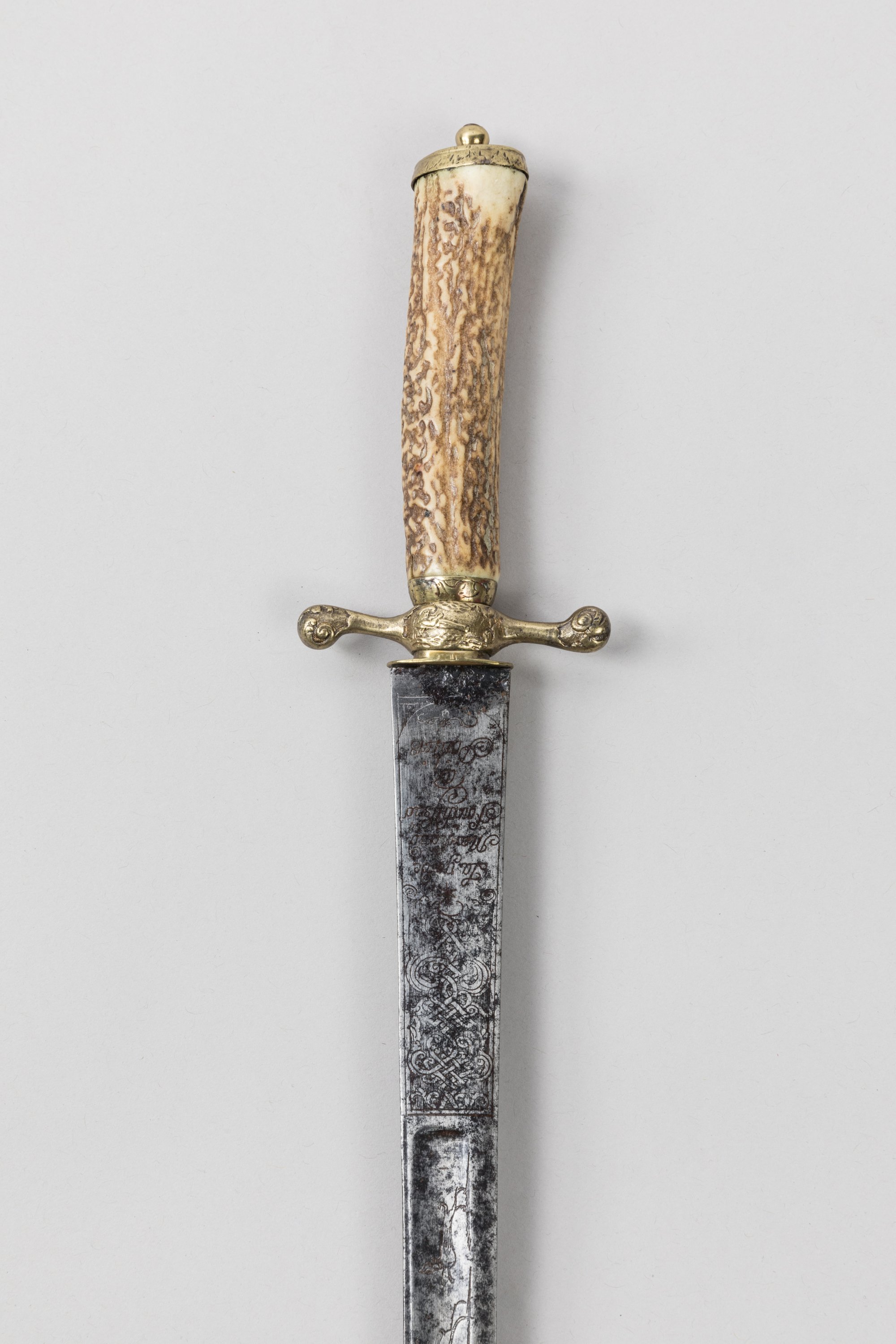 Poignée en bois de cerf. Monture en bronze doré, garde à deux quillons boulés. Lame droite à dos et pans creux gravée d'animaux et signée de "Lagarde marchand fourbisseur à Poitiers".