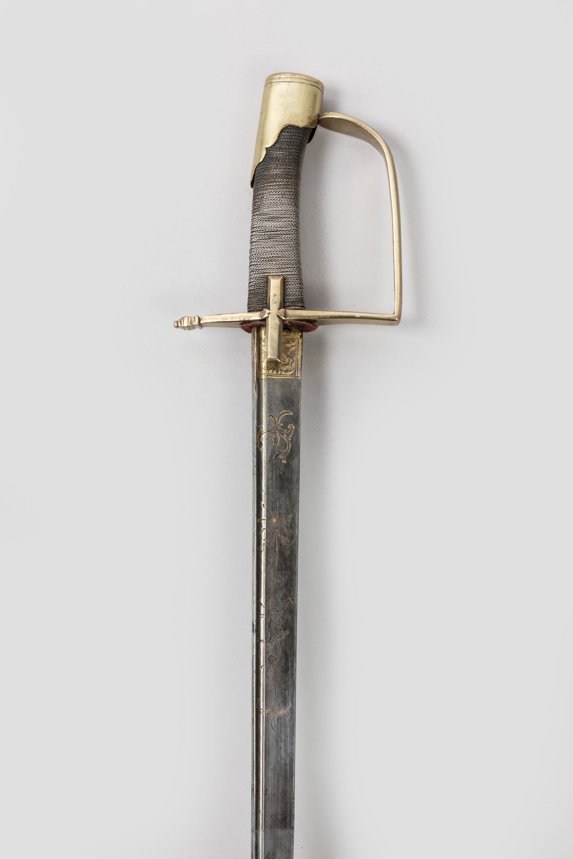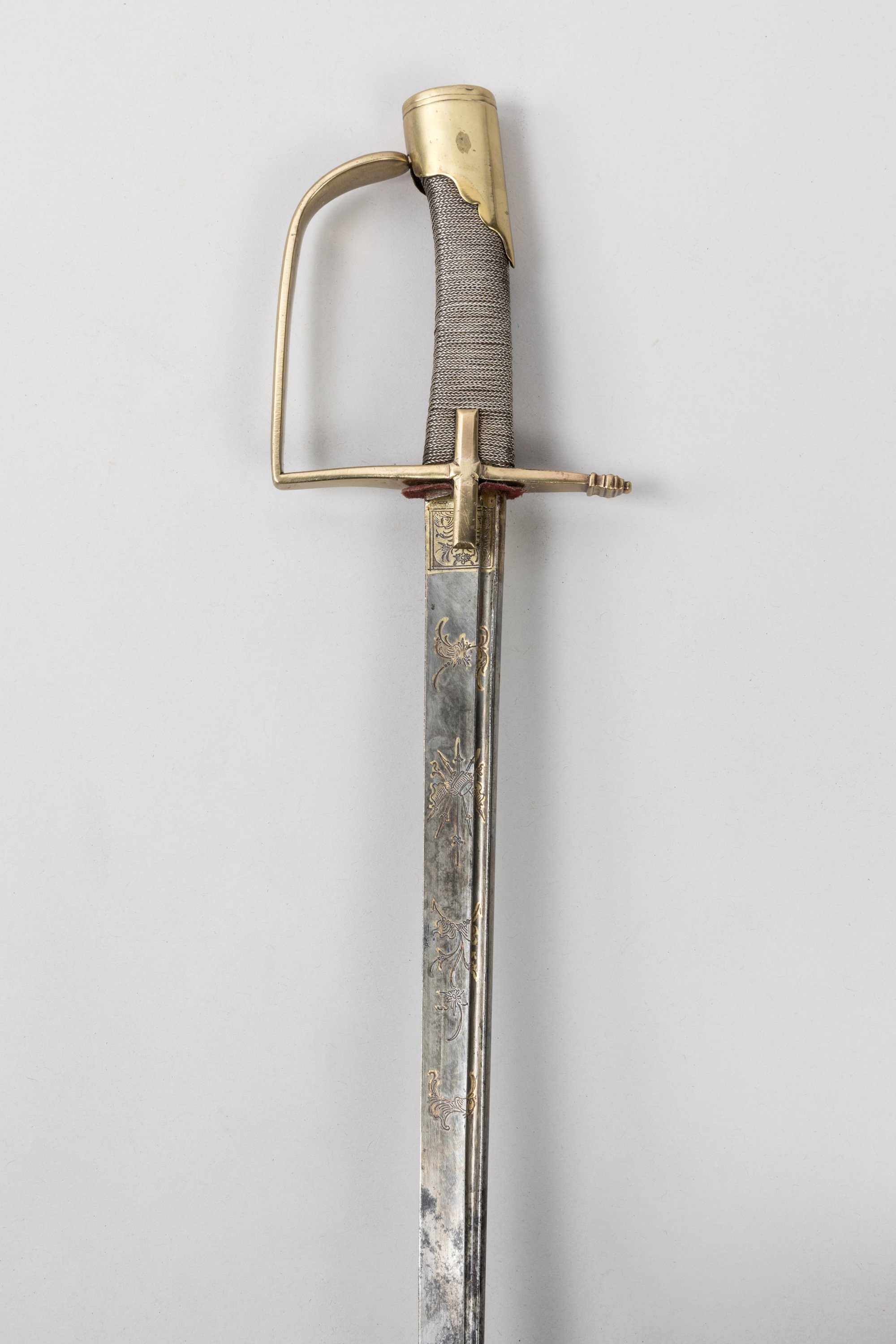 Fine lame droite à dos arrondi, gouttière et pans creux, gravée au tiers de trophées d’armes et rinceaux, sur restes de fond d’or. Fourreau en cuir à deux garnitures en laiton découpé, décoré au trait.