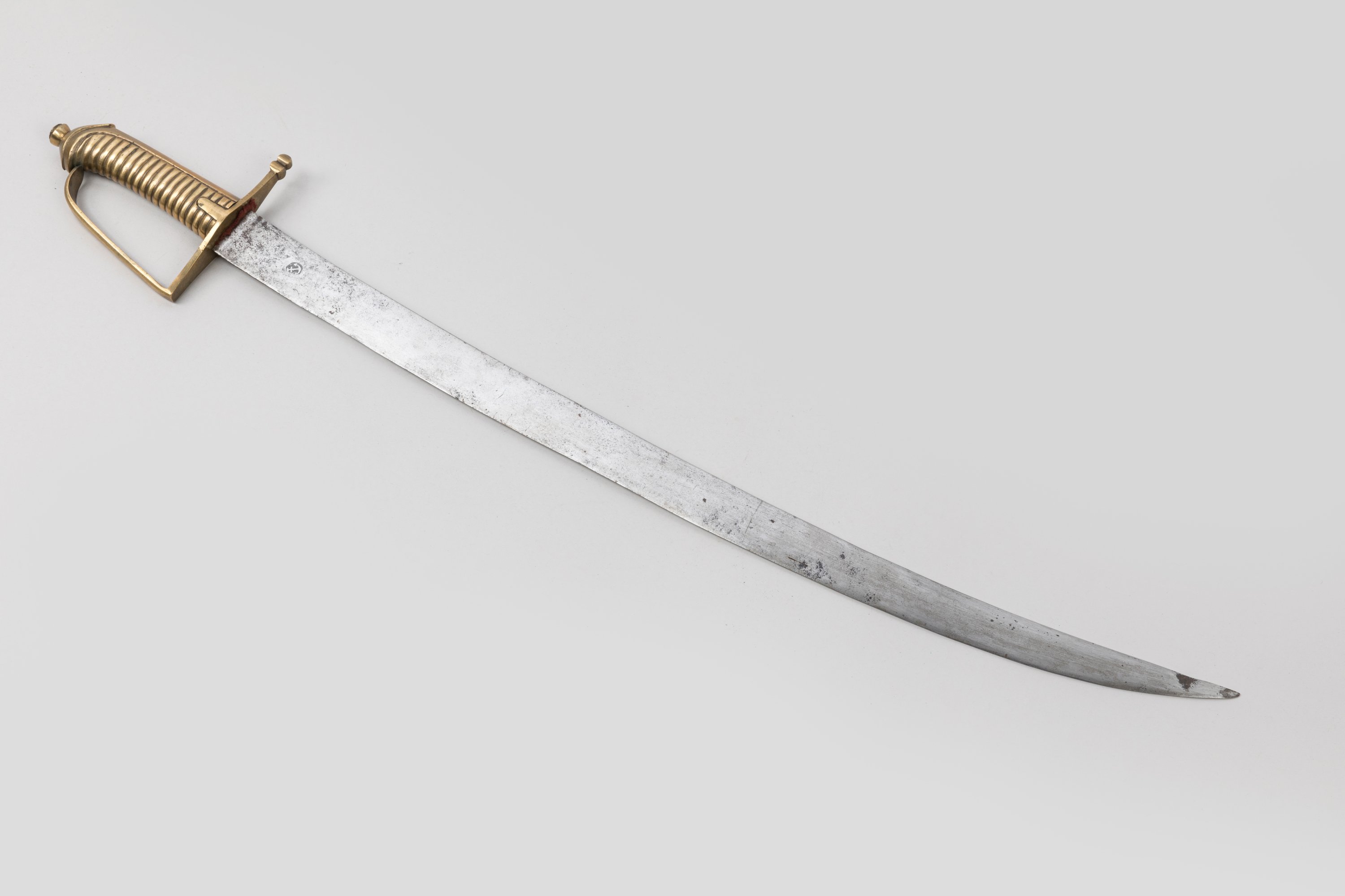 Monture en bronze, garde à une branche. Lame courbe frappée d’une ancre de marine.
