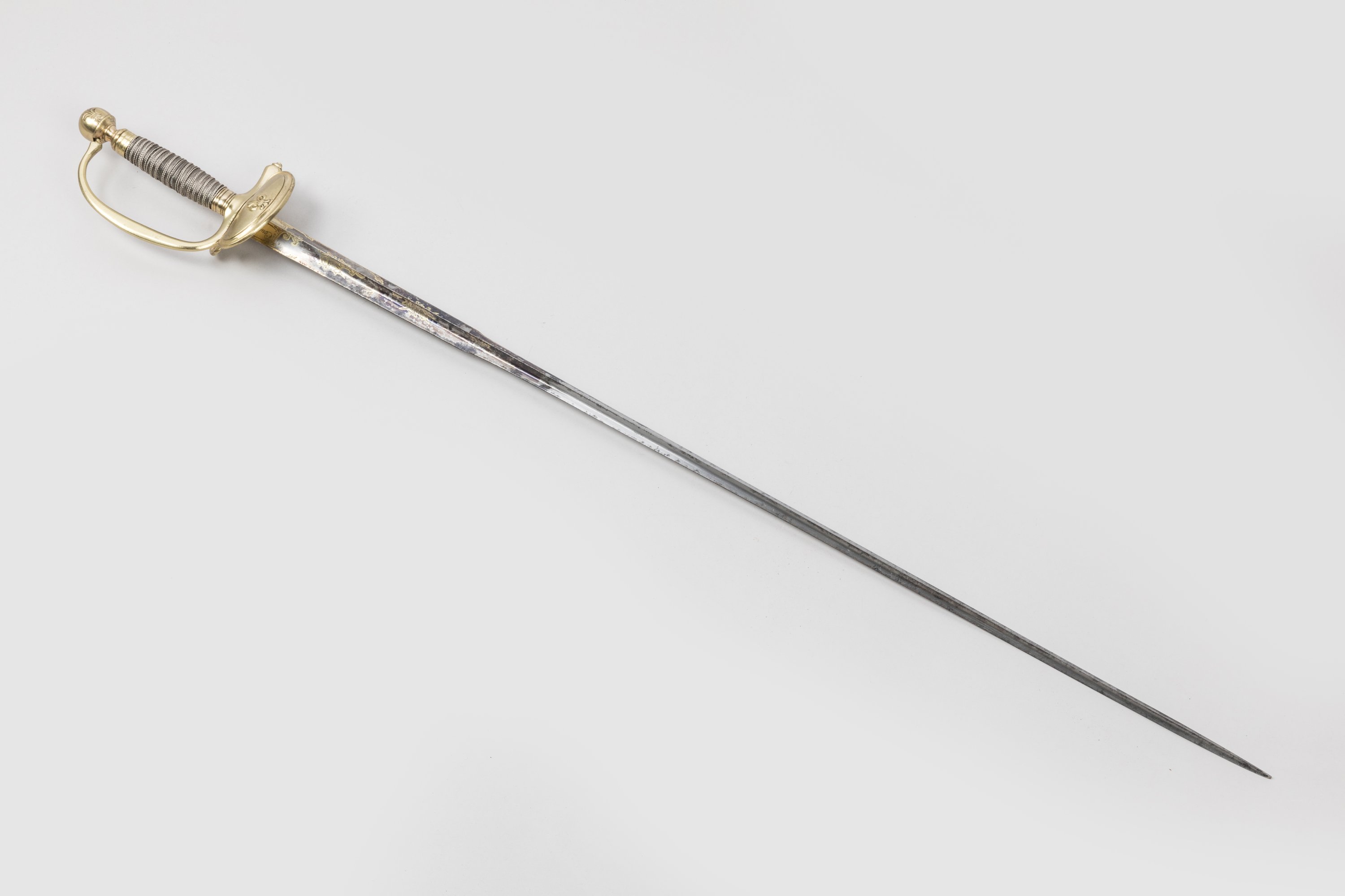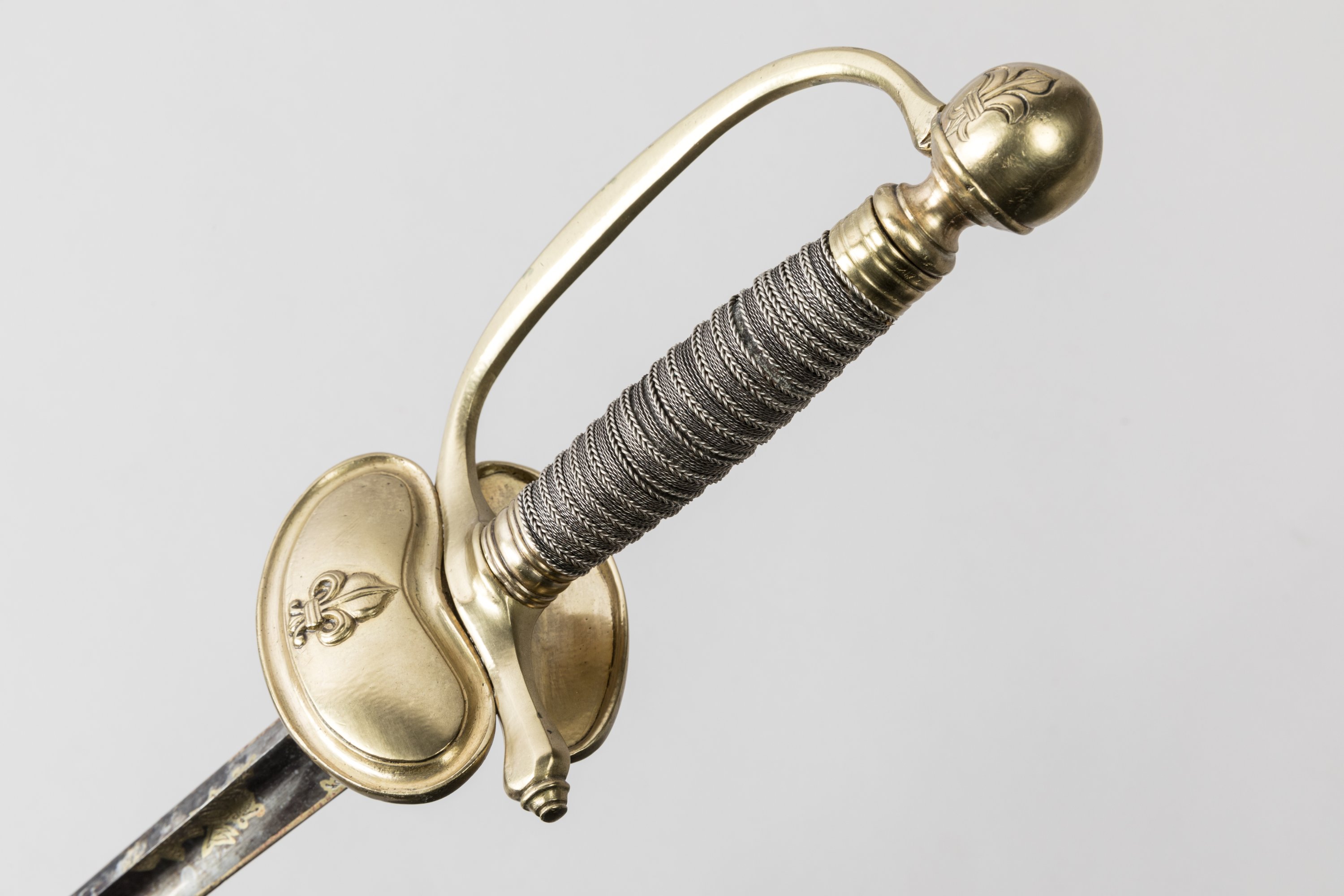 Fusée filigranée d’argent. Pommeau rond à la fleur de lys, branche de garde, clavier à la fleur de lys, en laiton. Lame triangulaire à la Colichemarde de la Manufacture royale de Klingenthal, gravée, dorée et bleuie au tiers.