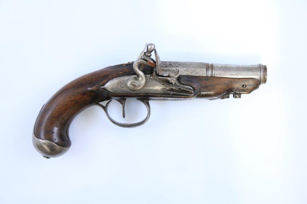 Canon rond à bourrelet à la bouche, à pans au tonnerre. Platine et chien col de cygne à corps rond. Garnitures en acier. Crosse en noyer.