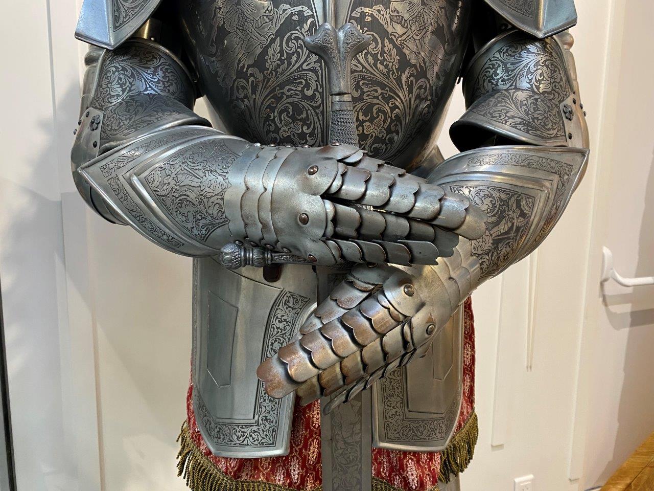 Blindage en acier poli, incisions de motifs floraux sur une grande partie de la surface.
