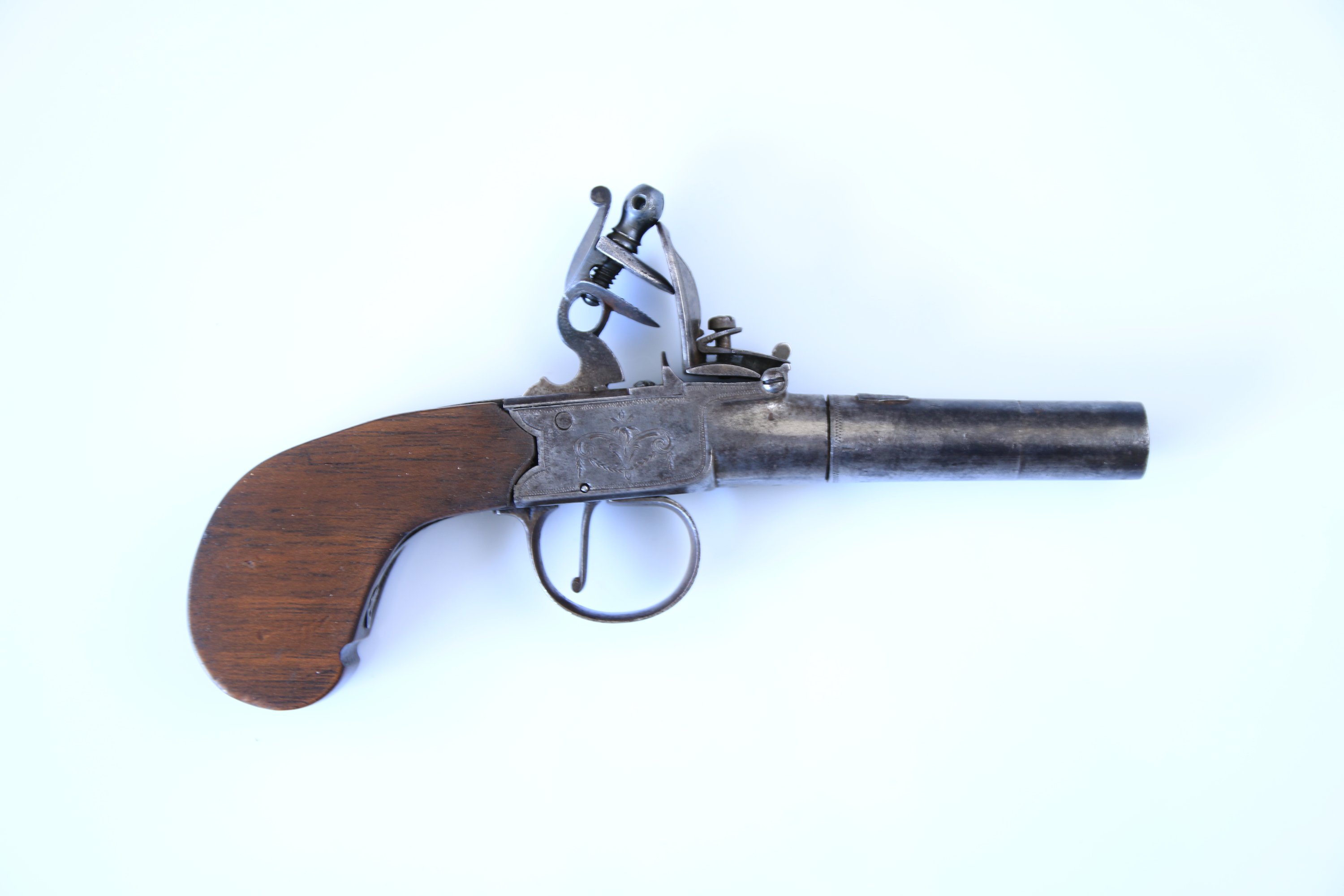 Canon rond à balle forcée et coffre signé « Probin », en fer. Poinçons d’épreuve anglais. Détente sous pontet. Crosse en noyer.
