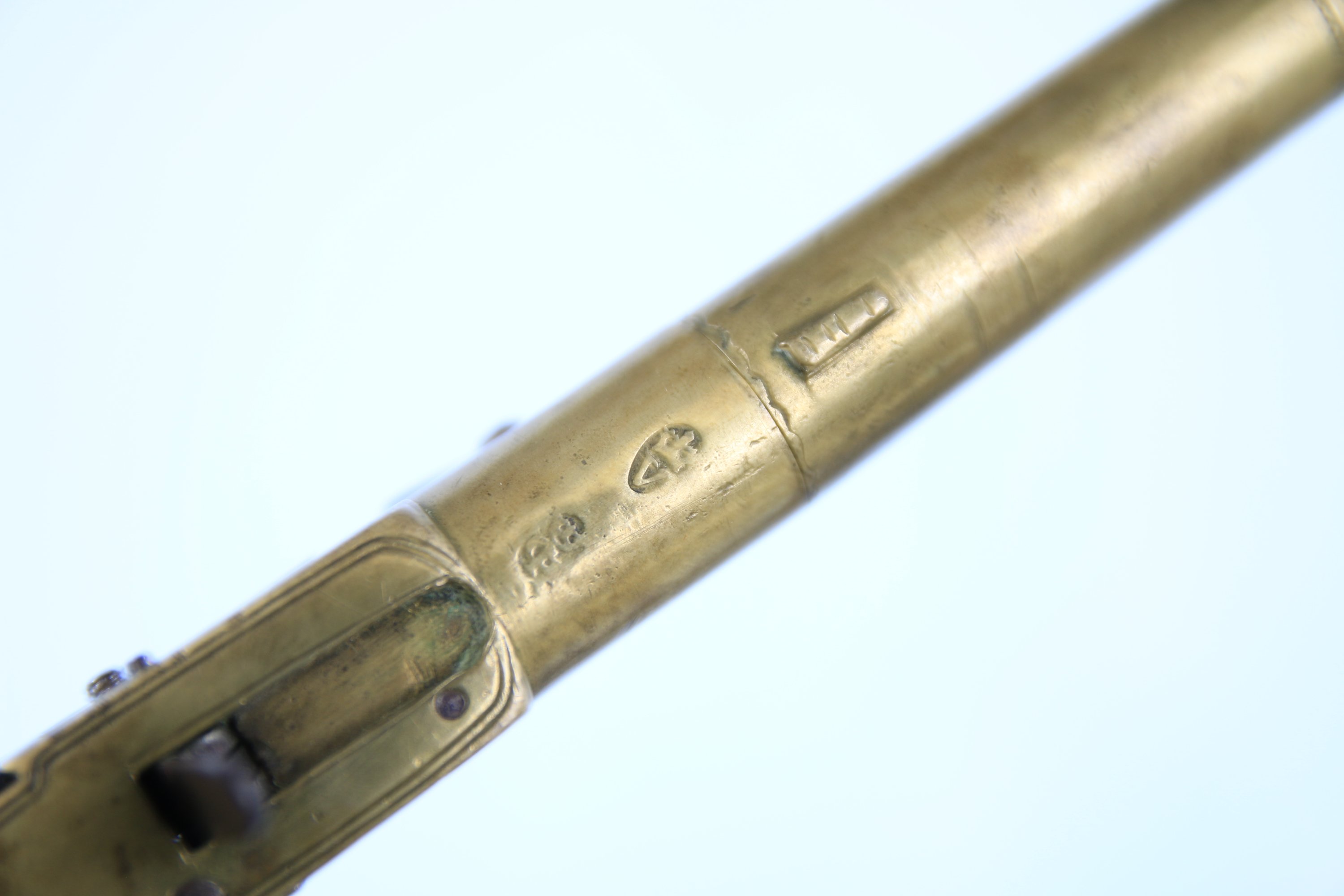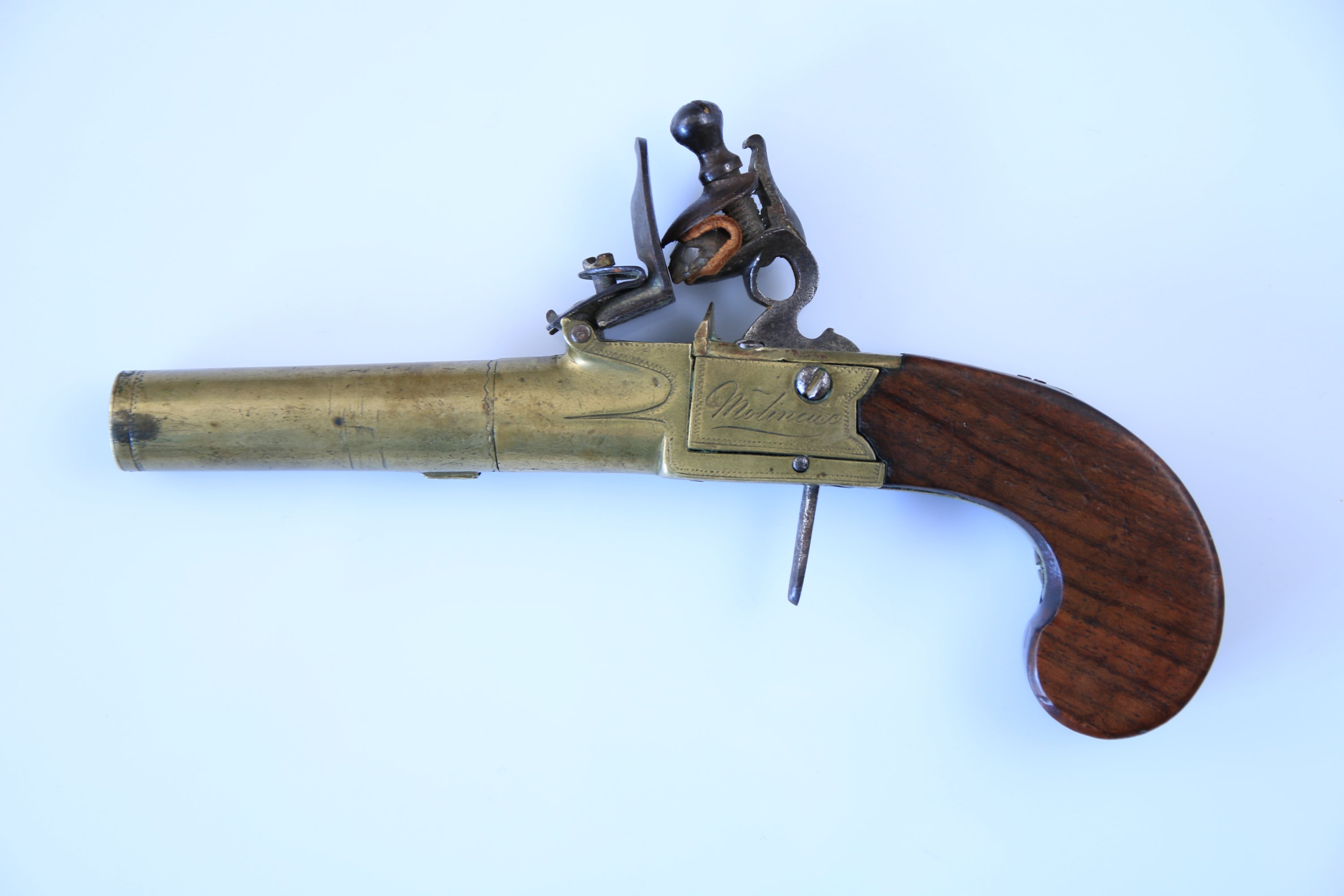 Canon rond à balle forcée et coffre signé « Molineux », en bronze. Poinçons d’épreuve anglais. Détente rentrante. Crosse en noyer.