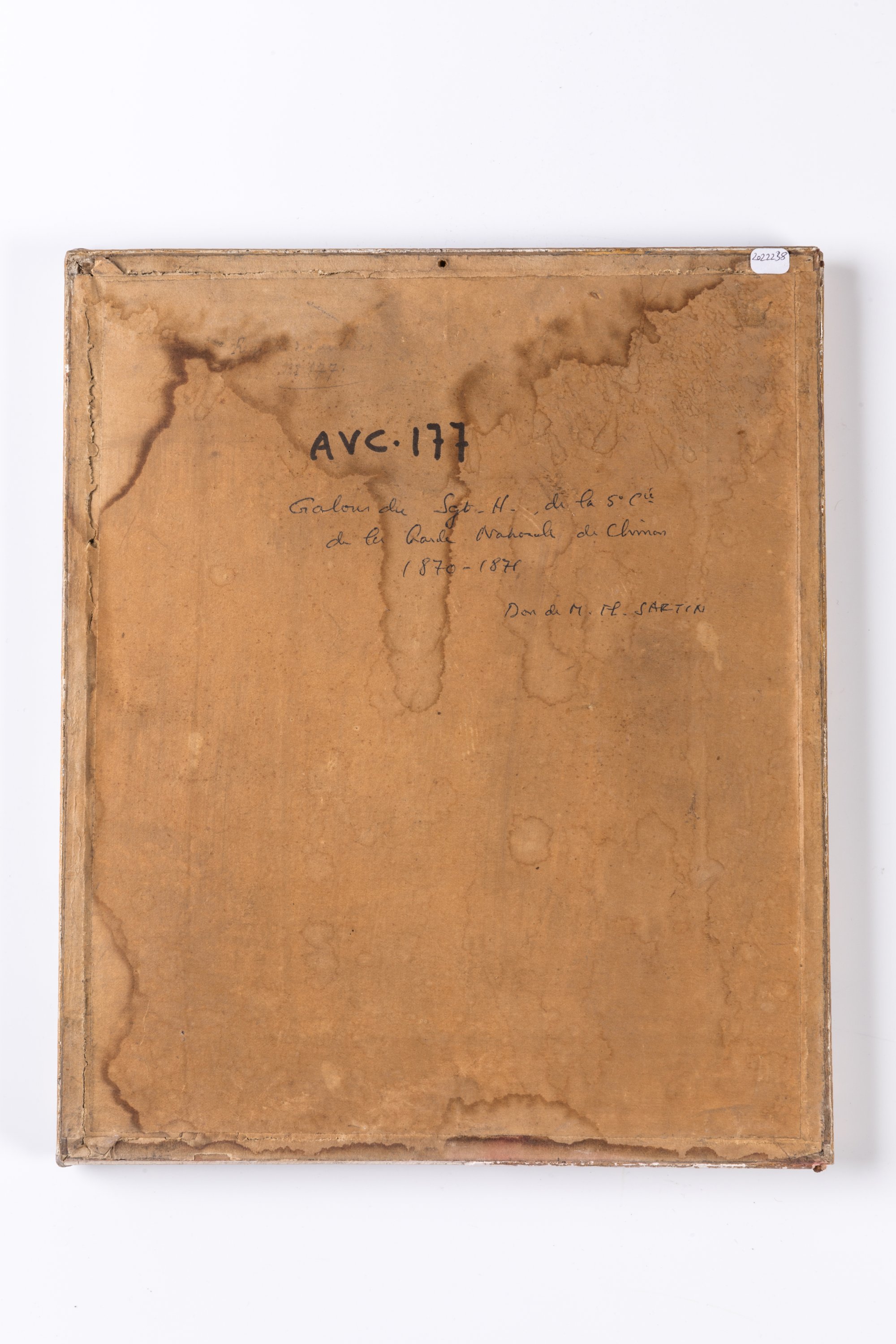 Présentés encadrés sous verre, avec étiquettes marquées à la plume « SOUVENIR DE LA GARDE NATIONALE 1870-1871 ». Annotation au dos « Galon du sergent H de la 5e cie de la Garde Nationale de Chinon 1870-1871 ».