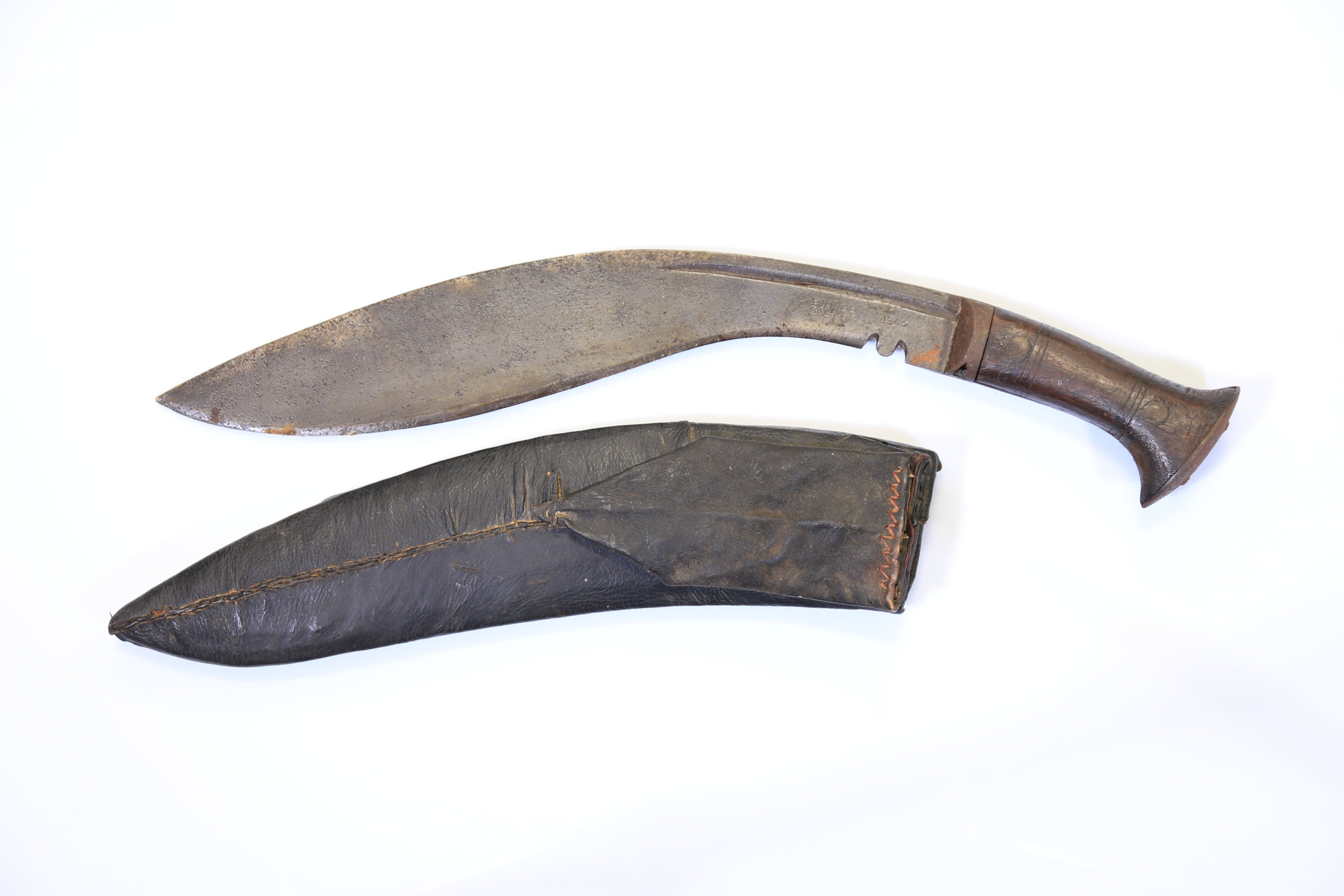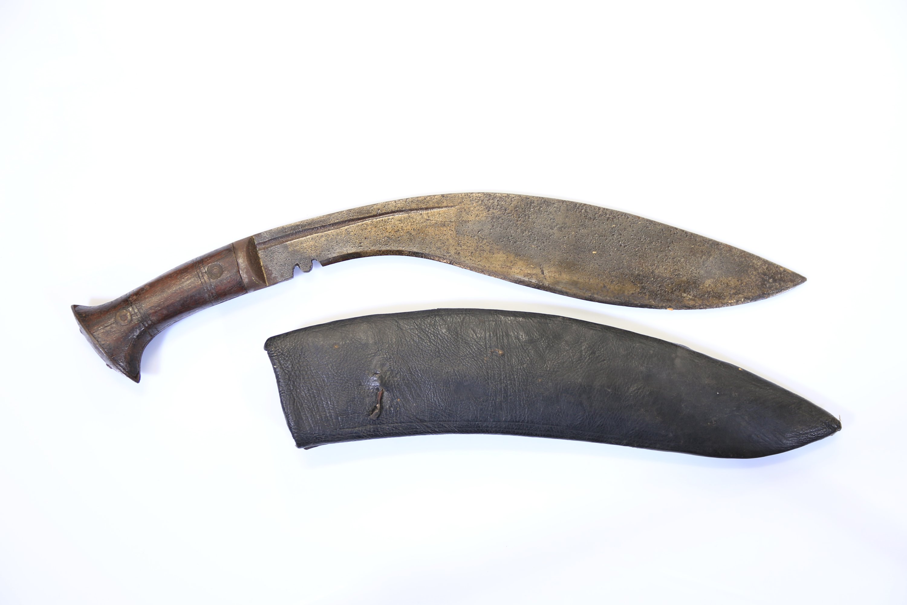 poignée en bois, forte lame marquée au talon " PIONEER CALCUTTA " et " 1943 ", fourreau gainé de cuir noir.
