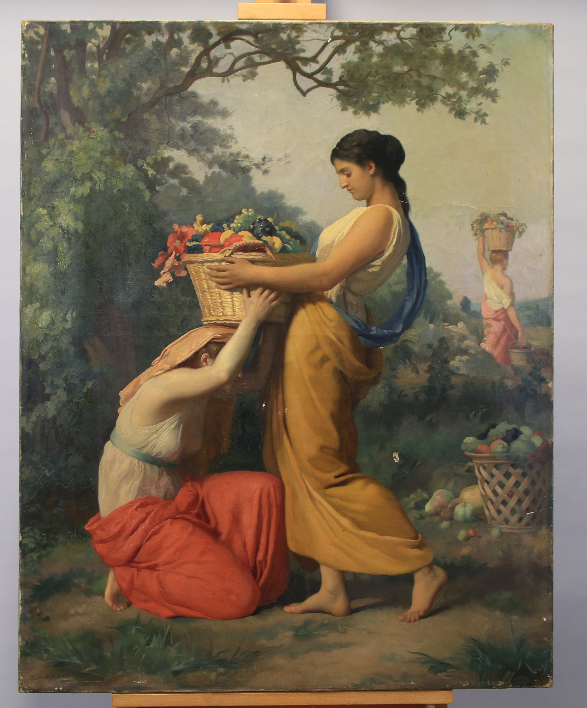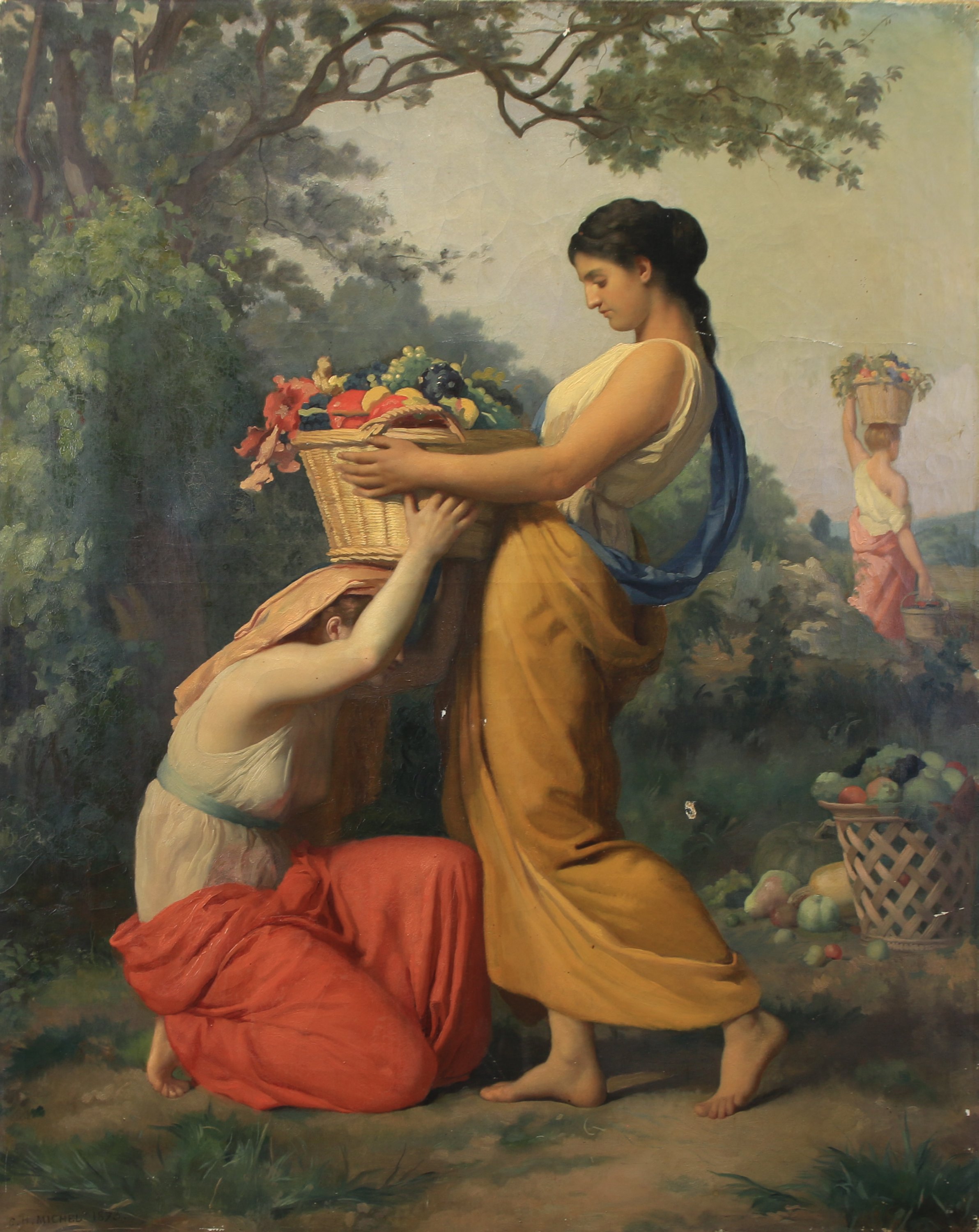Eleve à l'école des Beaux Arts de Paris, Michel est originaire de la Somme où il a été formé par Auguste Dehaussy. De nombreuses de ses oeuvres y sont conservées, nottament au musée de Péronne. Il expose au Salon d'Amiens, puis à Paris de 1861 à 1870 et enfin au Salon des artistes Français peu avant sa mort. Cette toile rend hommage à l'antiquité telle qu'il l'a découverte lors de son voyage en Italie en 1854, suite auquel il se tourna vers la peinture religieuse, gagnant sa vie comme portraiiste recherché d'une clientèle cultivée.