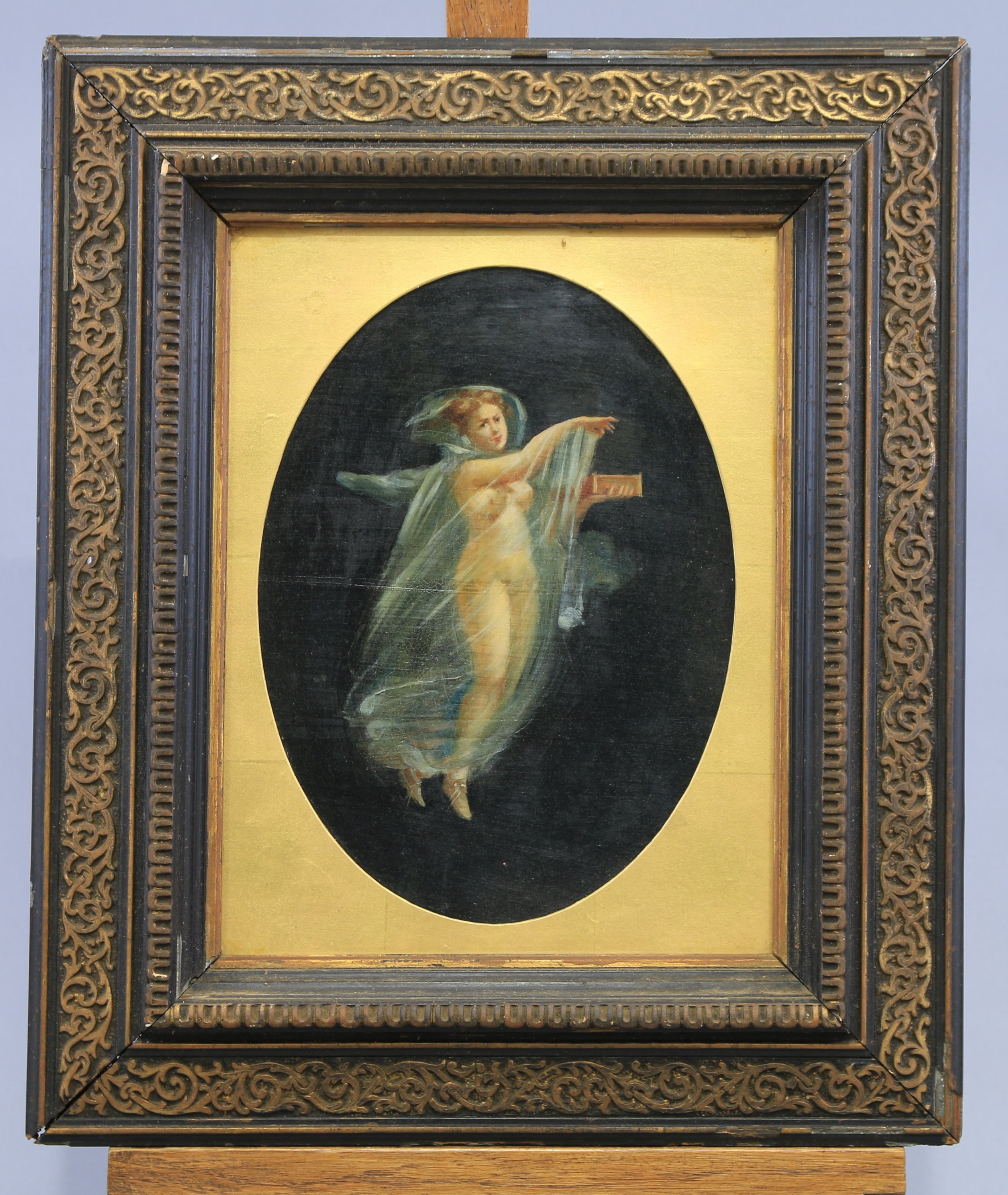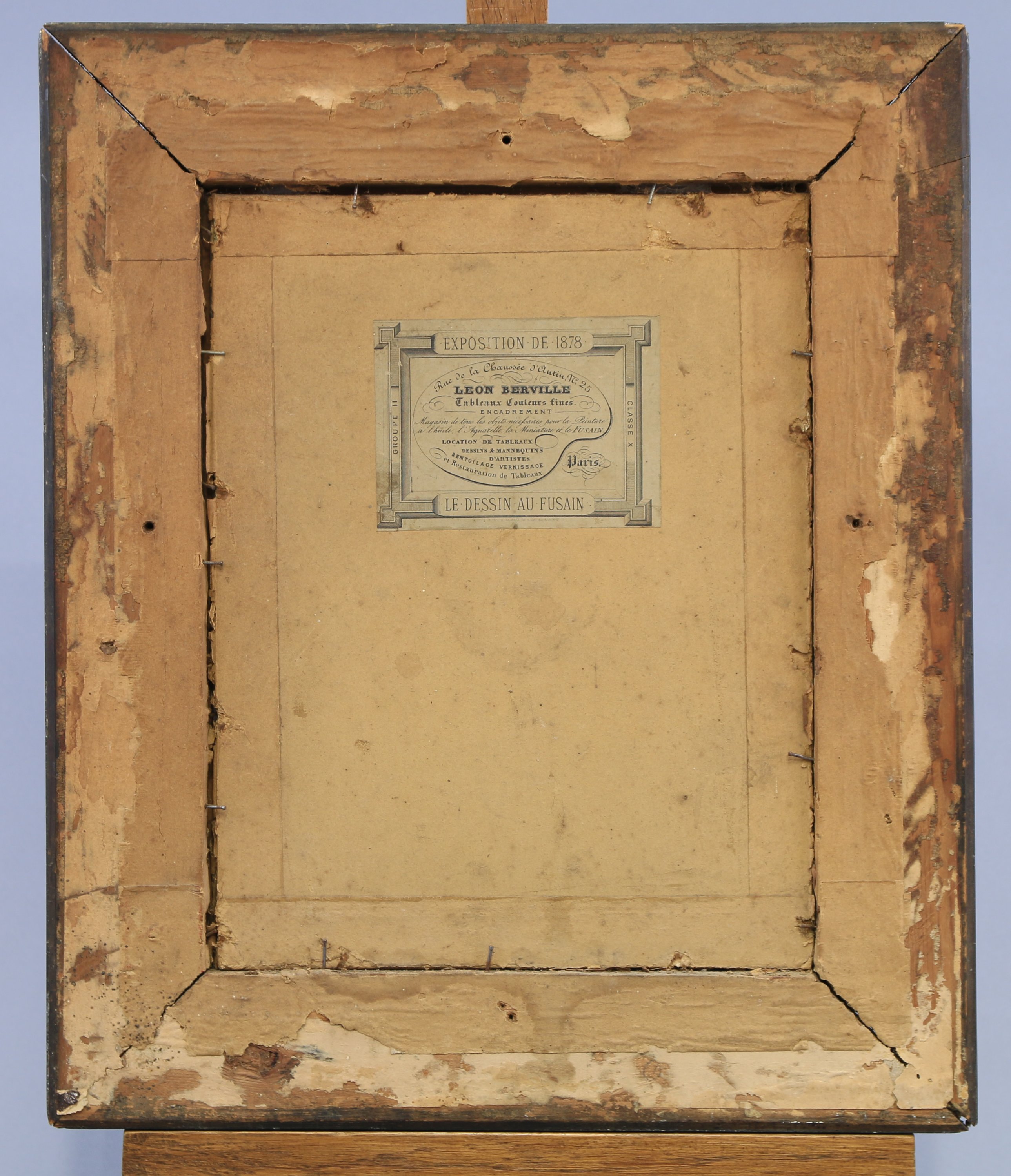 Cadre d'époque en bois et stuc noirci et doré. Avec étiquette de Léon Berville. (Haut. 44,5 Larg. 37,5 cm).