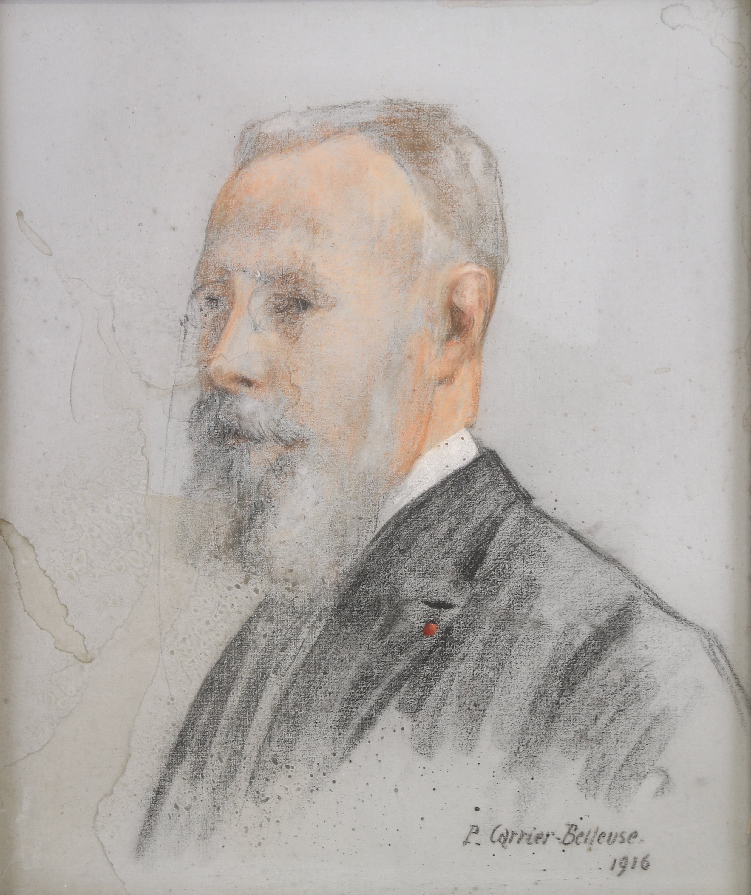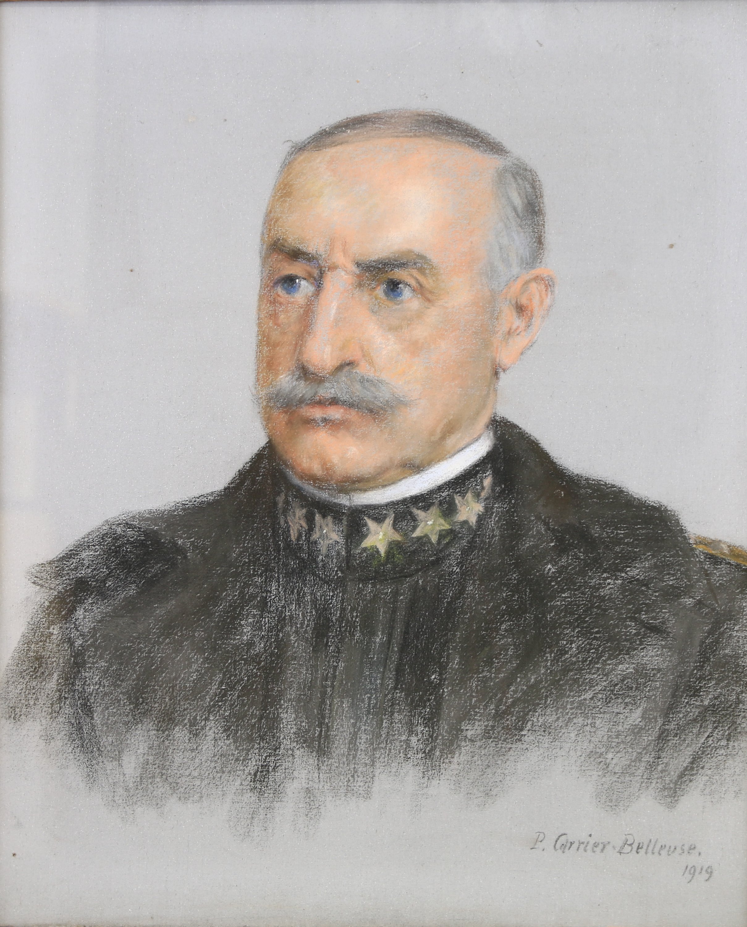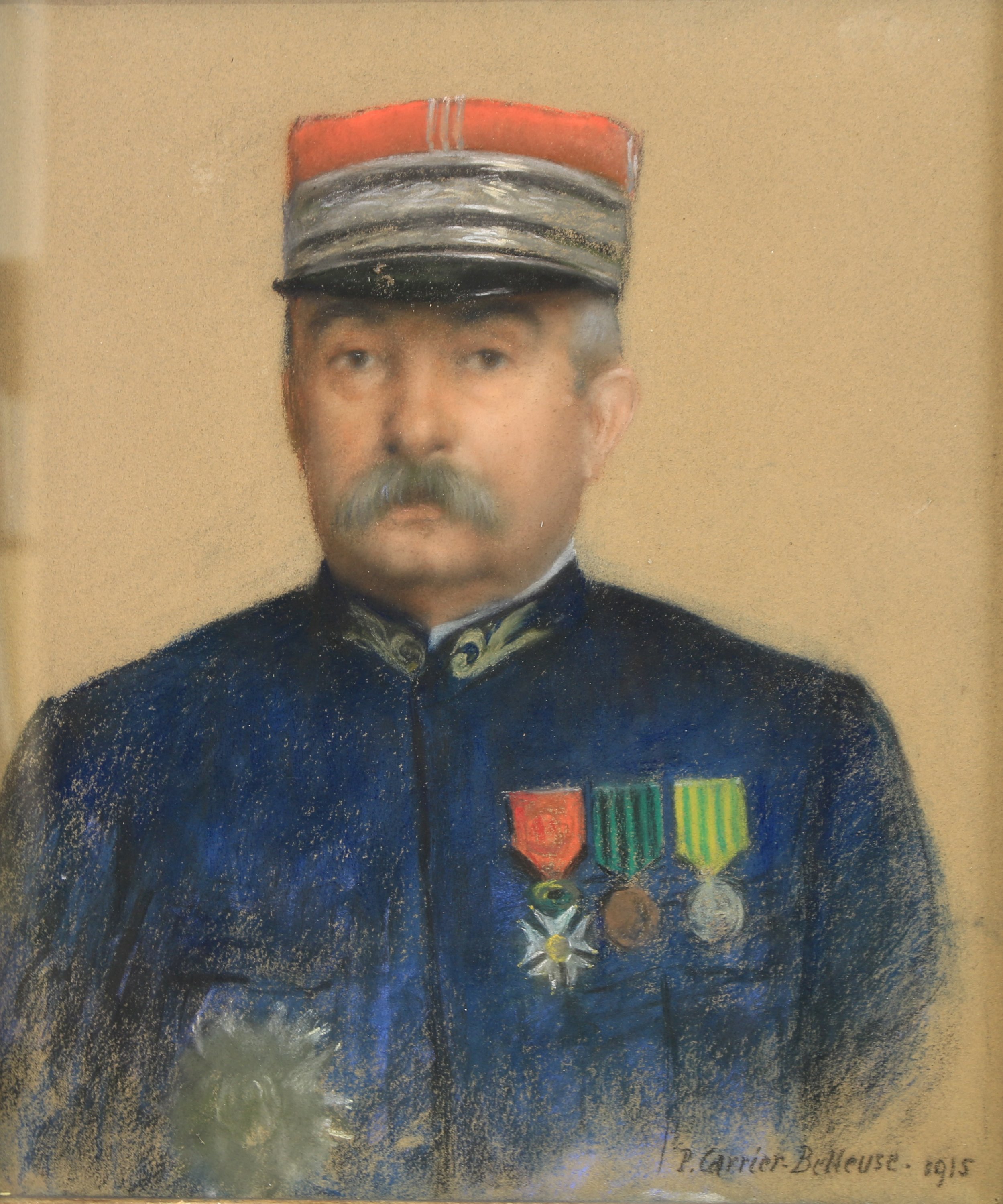 Nos six portraits par Pierre Carrier-Belleuse sont tirés du "Panthéon de la guerre", recensant les traits d'environ 6.000 personnages. "D'innombrables portraits, beaucoup d'après nature, d'autres d'après photographies et les documents envoyés par les familles, sont là sur une toile d'un développement de 120 mètres, d'une hauteur de 15". Ce projet pharaonique débute en octobre 1914 et se termine en novembre 1918. L'oeuvre finale se présente comme le plus grand tableau du XXe siècle, réalisé en collaboration avec Auguste François-Marie Gorguet, avec la participation d'environ 130 artistes. Exposé près des Invalides dans un bâtiment détruit depuis les années 1960, le tableau est admiré par 3 millions de visiteurs entre 1918 et 1927. Il est ensuite acquis par des Américains qui l'exposent au Madison Square Garden avant de l'envoyer en tournée dans tous les Etats-Unis. Le "Panthéon de la Guerre" est aujourd'hui exposé au Mémorial de la Liberté à Kansas City mais a vu ses dimensions considérablement réduites pour mettre en valeur la participation américaine au premier conflit international mondial.
