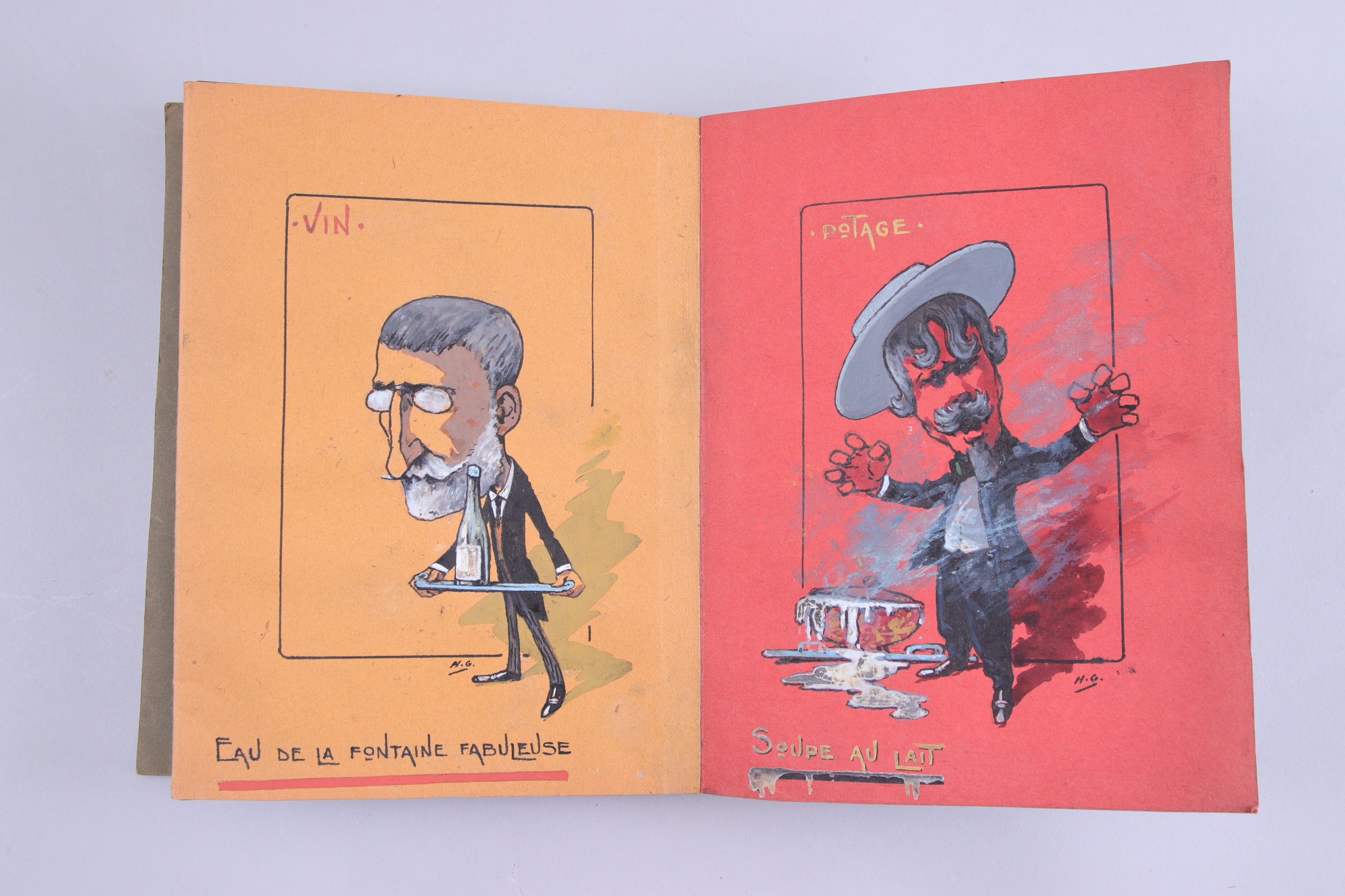 Huit portraits-charges à la gouache figurant Maurice Davanne, Auguste Erhard, Paul Bonhomme, Elie Poirée, Antoine Banès, Henri Boutet, Henry Gray et Georges Lamouroux. Réunis en accordéon avec légende, dédicace et signatures des convives.