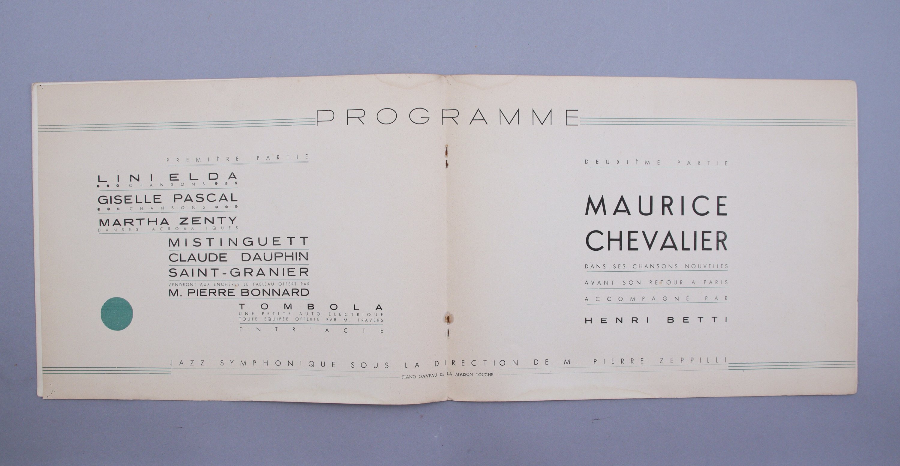 Lithographie en couleurs signée dans la planche, en couverture du programme de la grande soirée Maurice Chevalier le vendredi 14 août 1942 à Cannes.