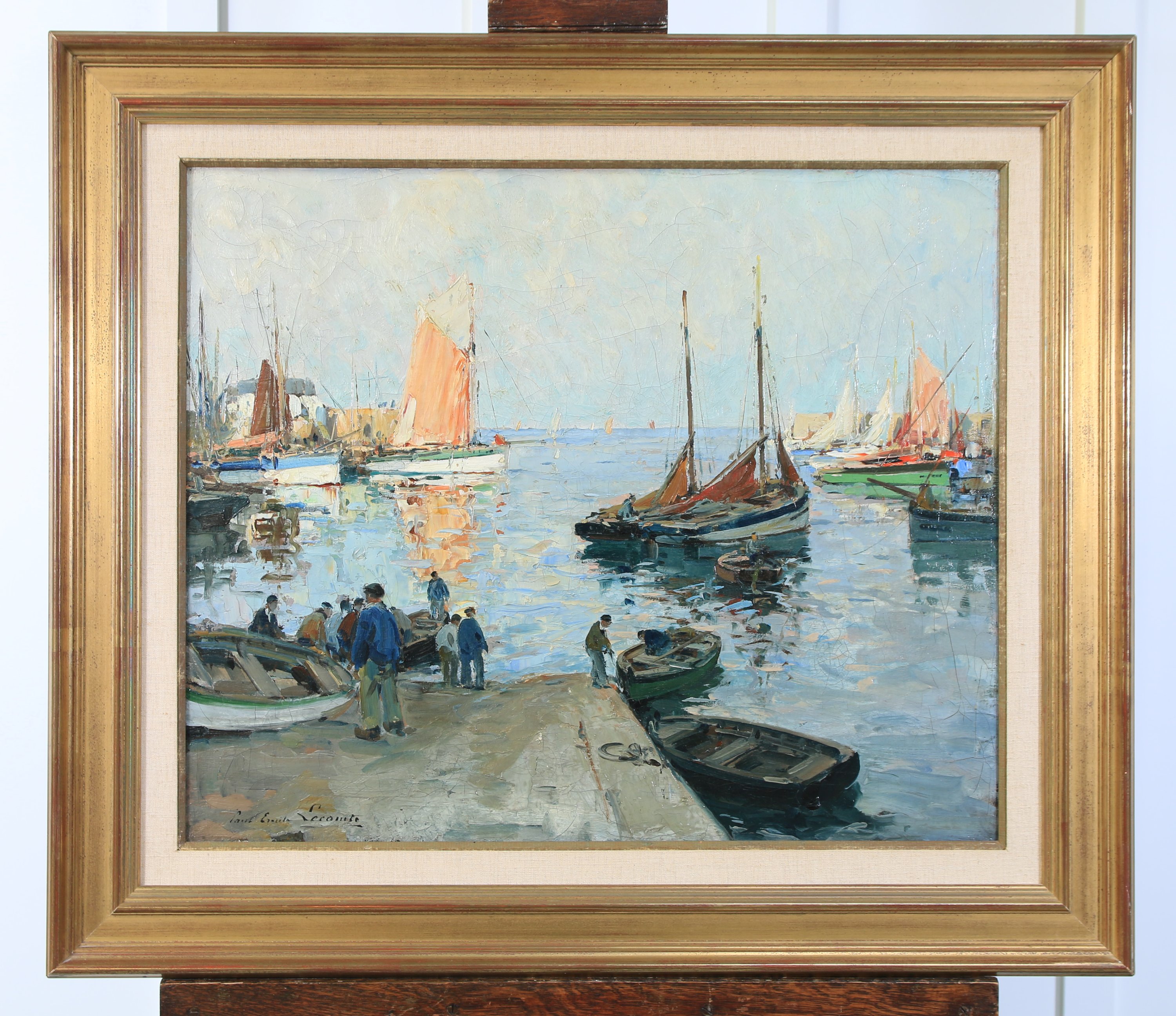 Peintre de la marine à partir de 1921, Paul Emile Lecomte se distingue pas son style impressionniste dont les vues de port saisissent la vérité et la beauté la vie des marins. Ce « Coin de port » titré au dos et numéroté 7 à l'occasion d'une exposition par l’artiste montre des pêcheurs se diriger à marée montante vers leurs embarcations pour prendre la mer. Des voiles flottent déjà au loin dans la lumière du petit jour. De belles dimensions et une maîtrise accomplies caractérisent cette toile qui représente, ainsi que nous l’a aimablement précisé notre confère de Nantes Henri Couton, Port Joinville sur l’Ile d’Yeu. L’ancien Port Breton -à mi-chemin sur la façade atlantique entre la Guyenne et Bretagne- a été renommé en l’honneur du Prince de Joinville, fils de Louis Philippe, en 1846, après qu’il ait contribué à son développement. Longtemps l’un des ports les plus dangereux de France, avec de nombreux naufrages, il est aujourd’hui fréquenté par plusieurs centaines de milliers de visiteurs chaque année.