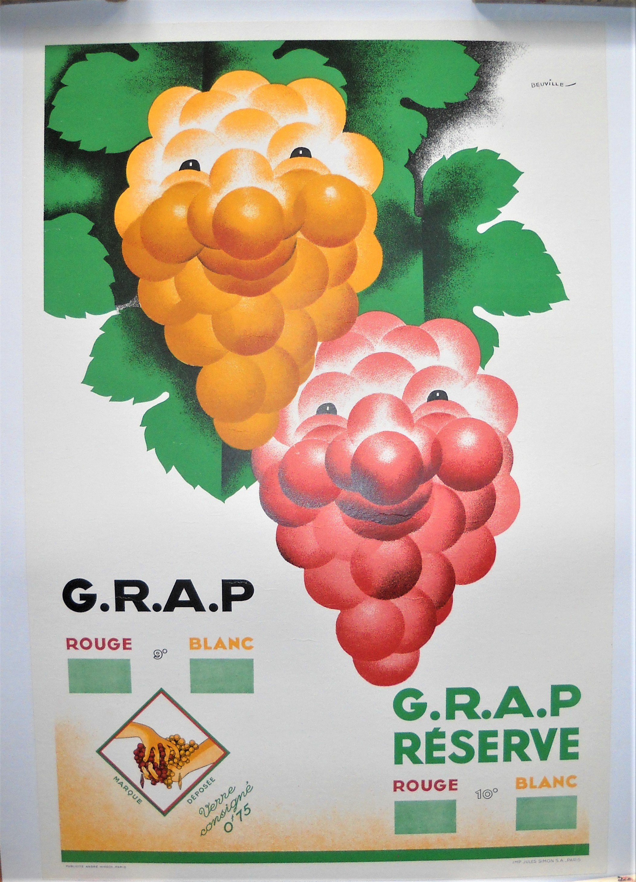 - Georges Beuville (1902-1982), « G.R.A.P. Réserve / Rouge / Blanc ». Signée. Vers 1960. Epreuve originale imprimée en couleurs. Entoilée, Haut. 60 Larg. 40 cm. (bel état).