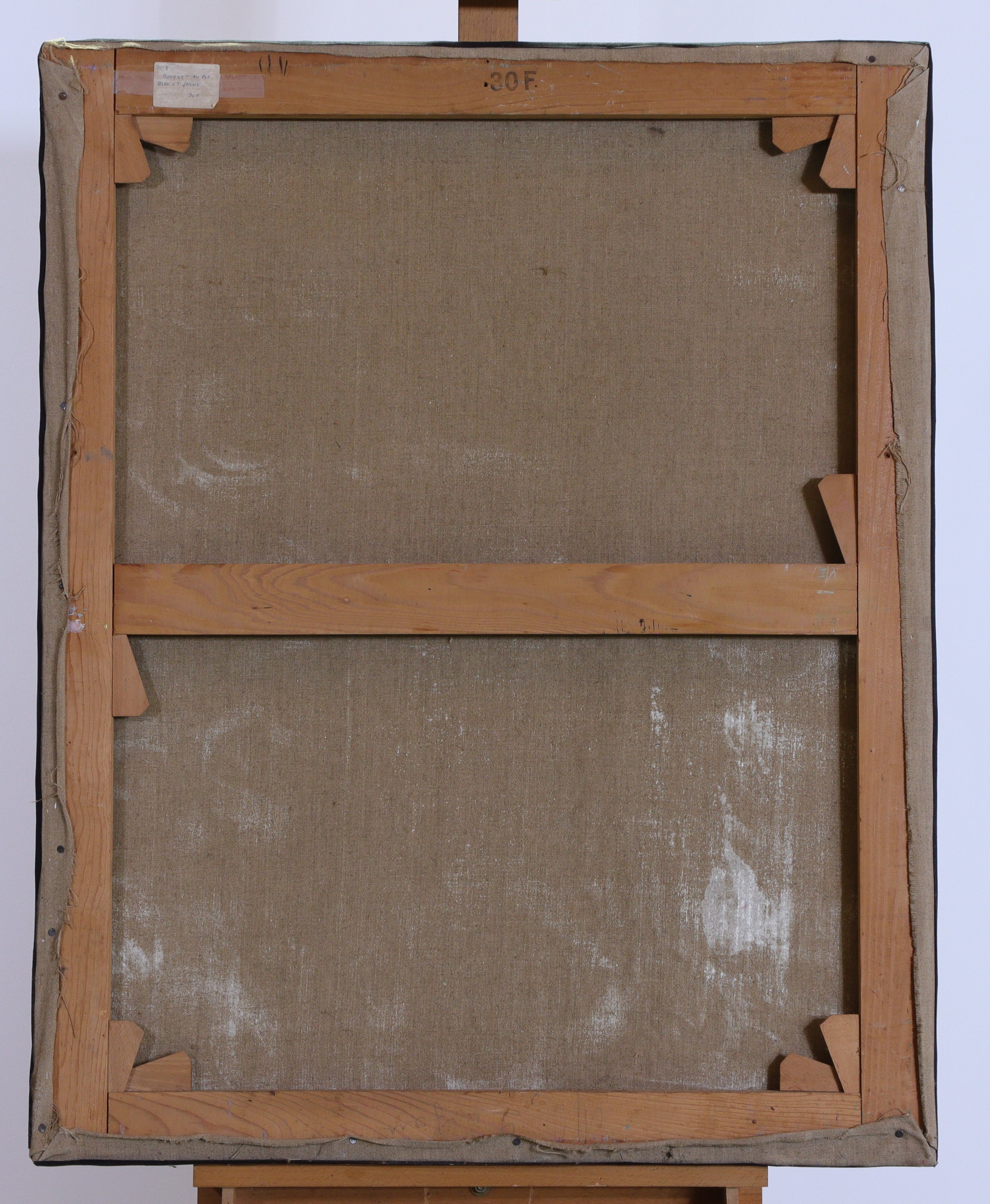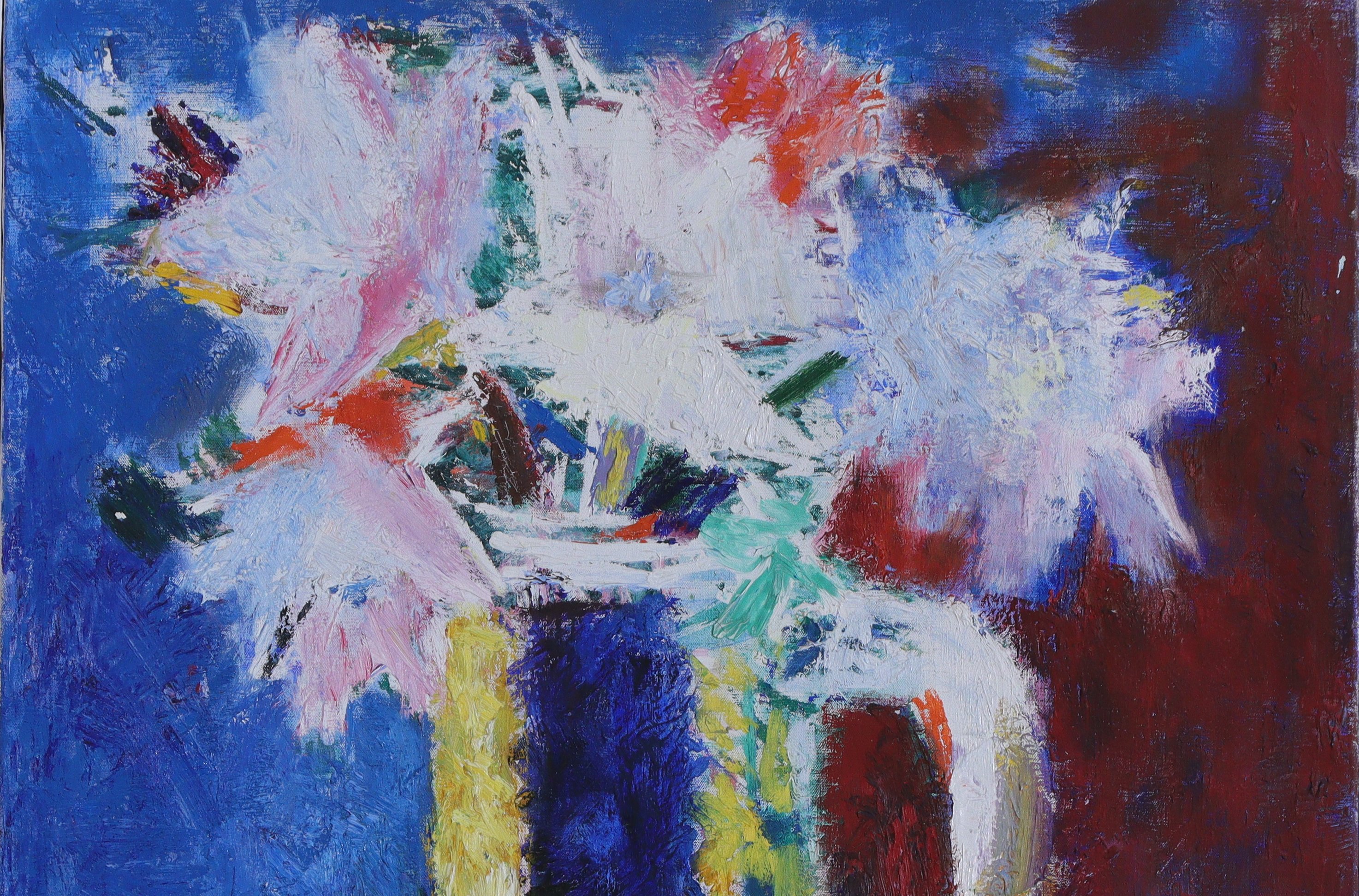 Signée en bas à droite. Etiquette manuscrite collée au dos « n°8 / Bouquet au pot bleu et jaune / 30 F. ».