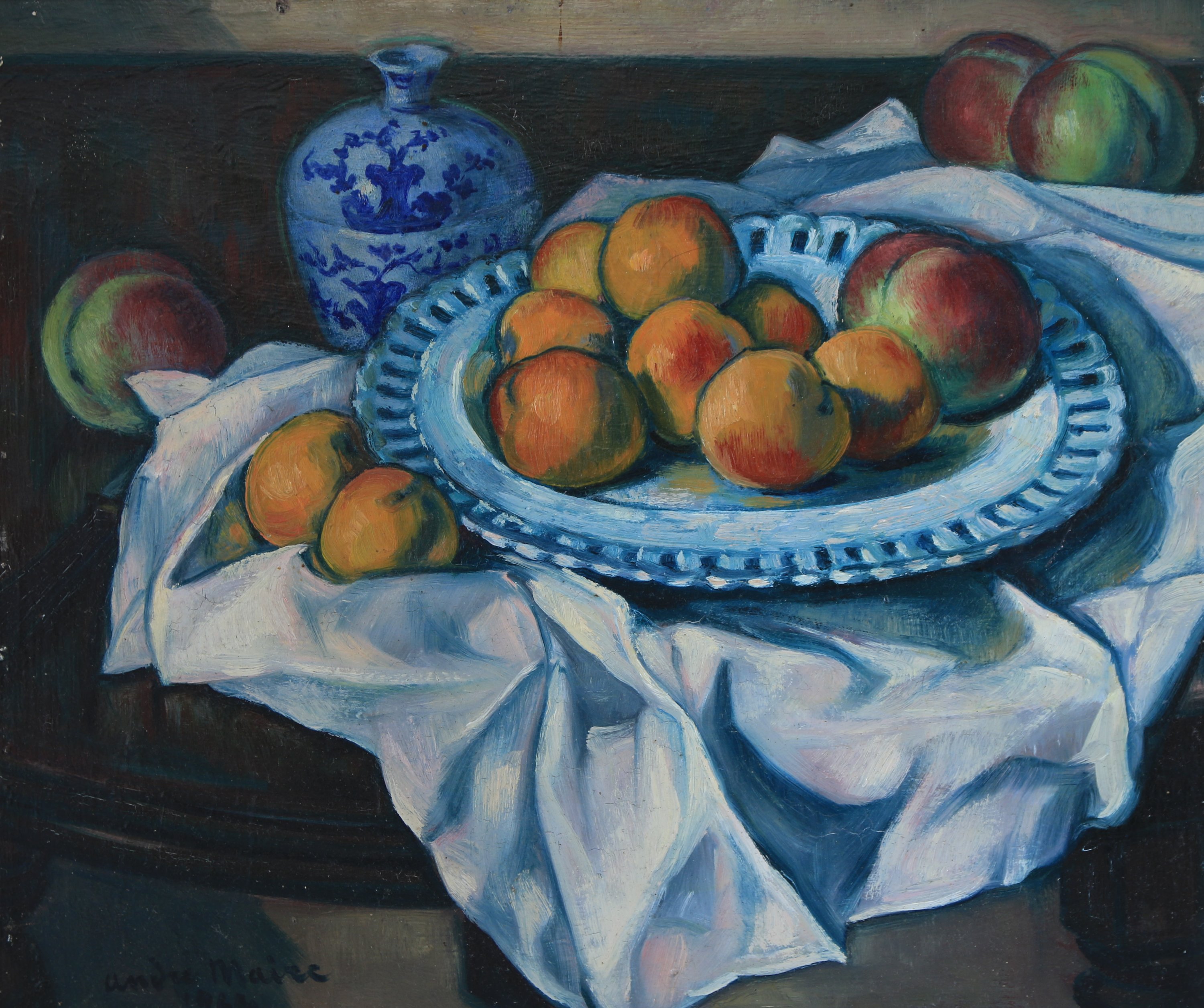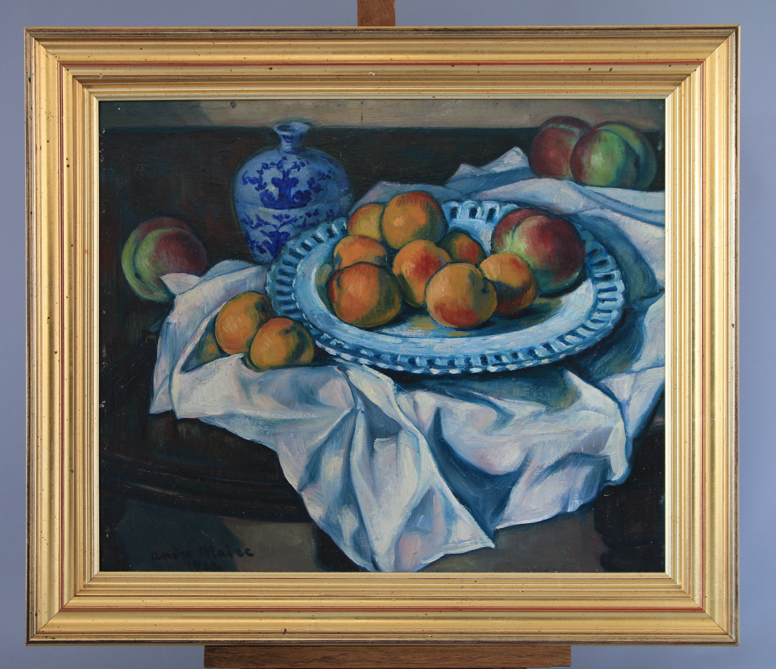 Nature morte aux pêches, pommes et plat sur une nappe, 1964