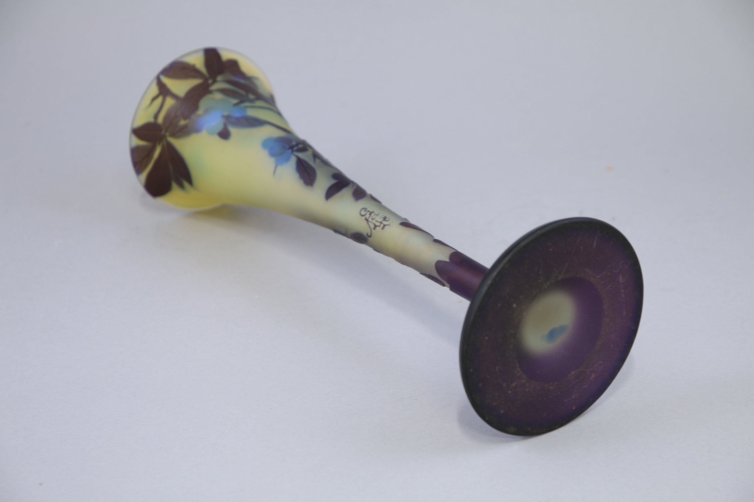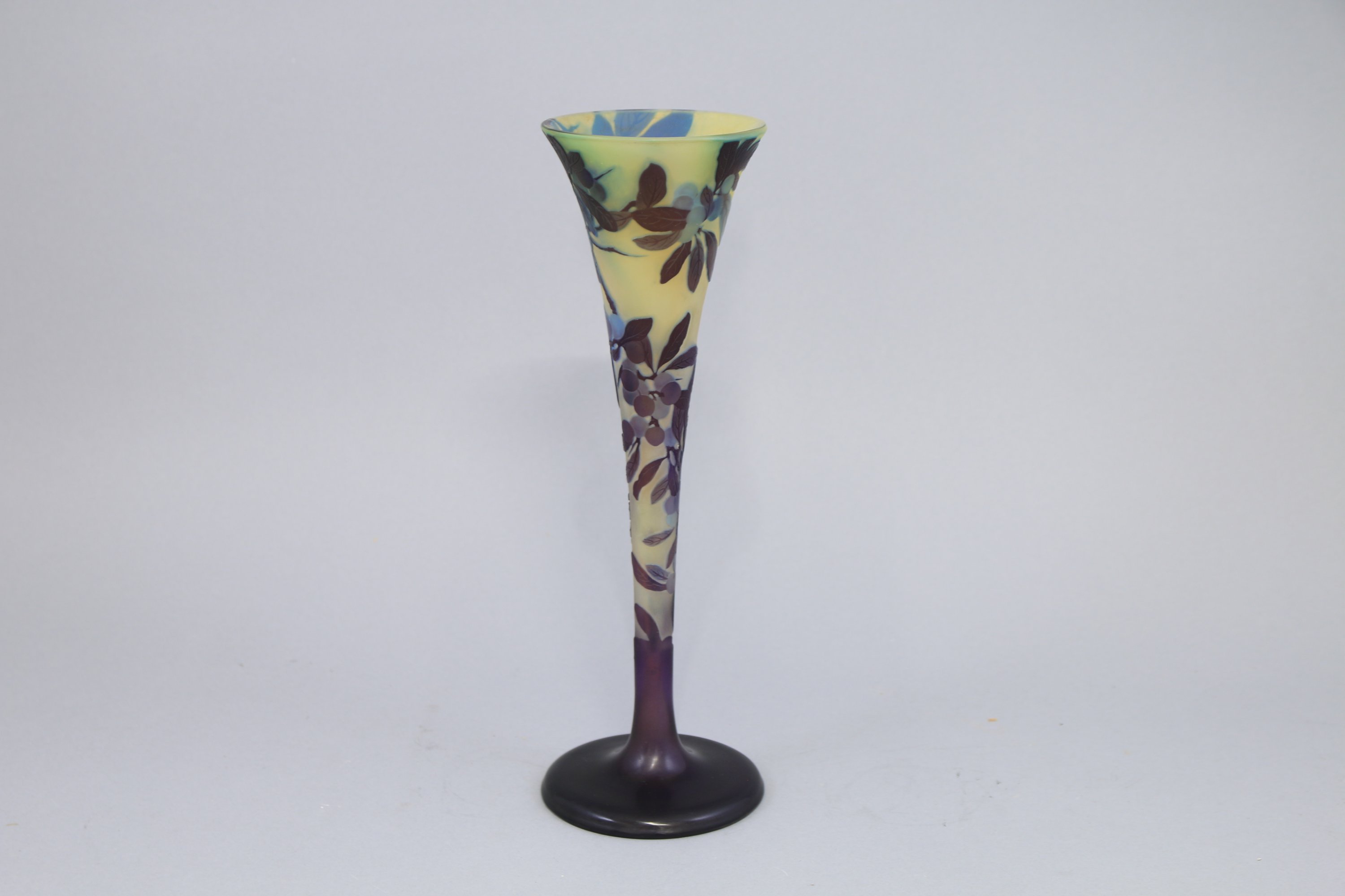 Verre multicouche à fond opalescent jaune et violet à décor de feuilles et boules de gui.