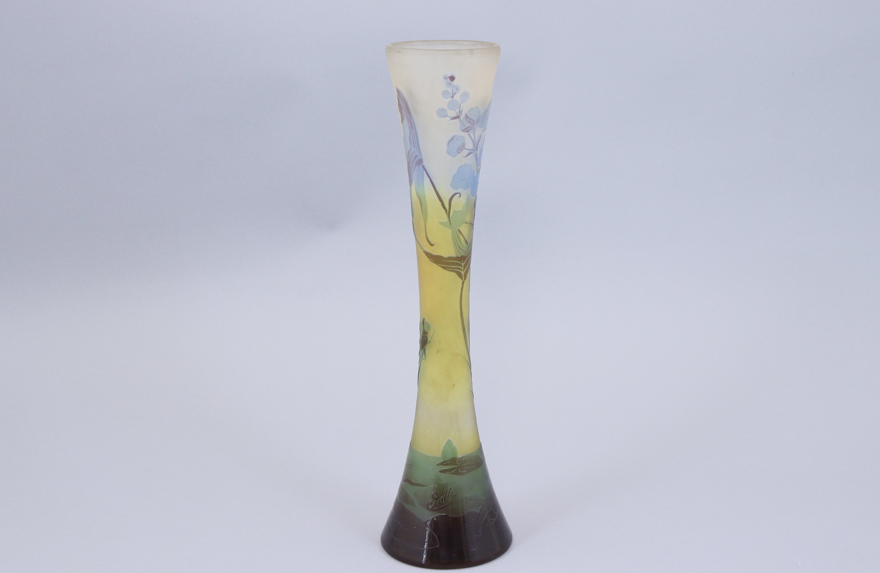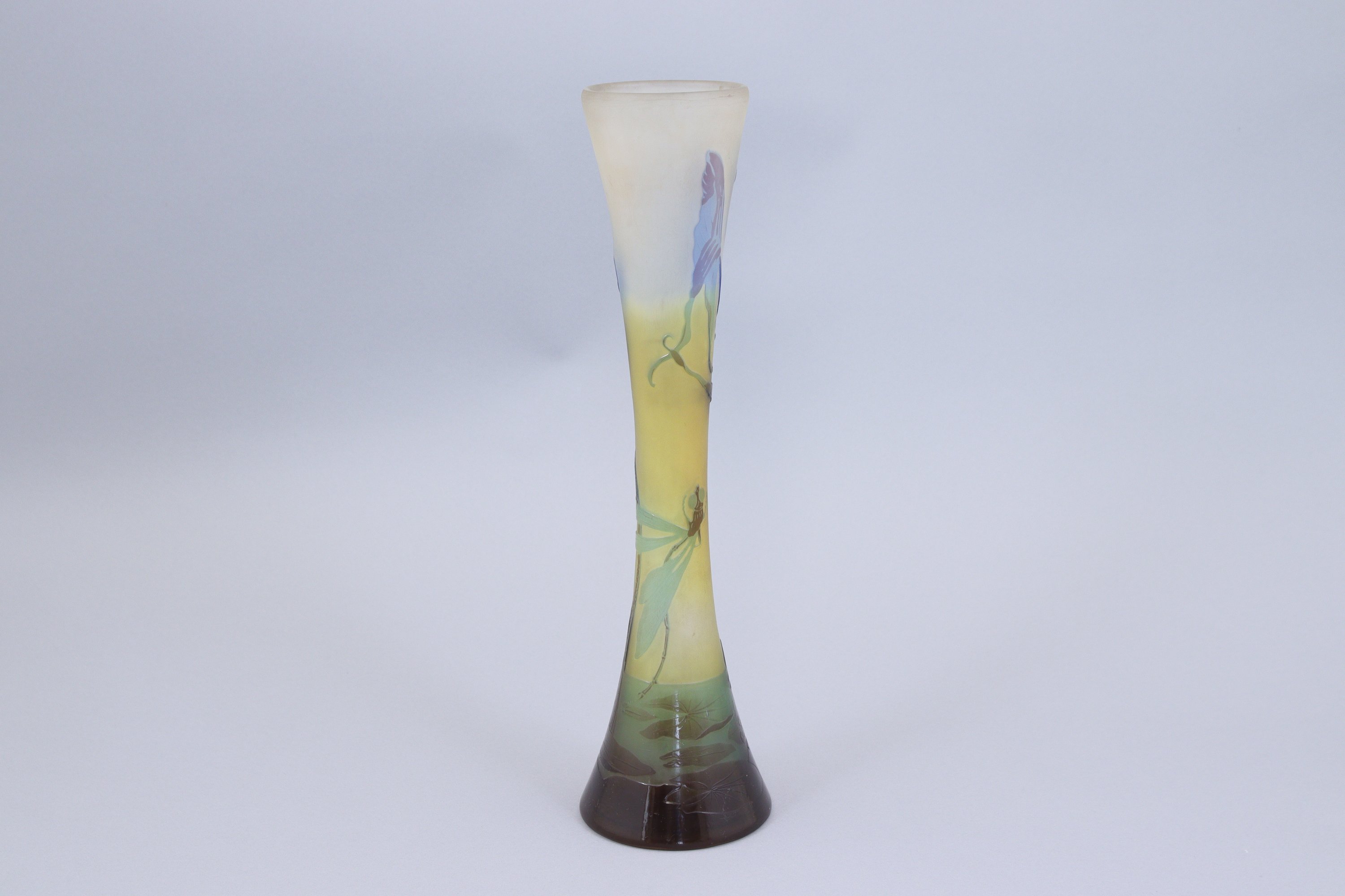 Verre multicouche à fond opalescent jaune, bleu et vert à décor de libellules et sagittaires sur des feuilles de nénuphar.