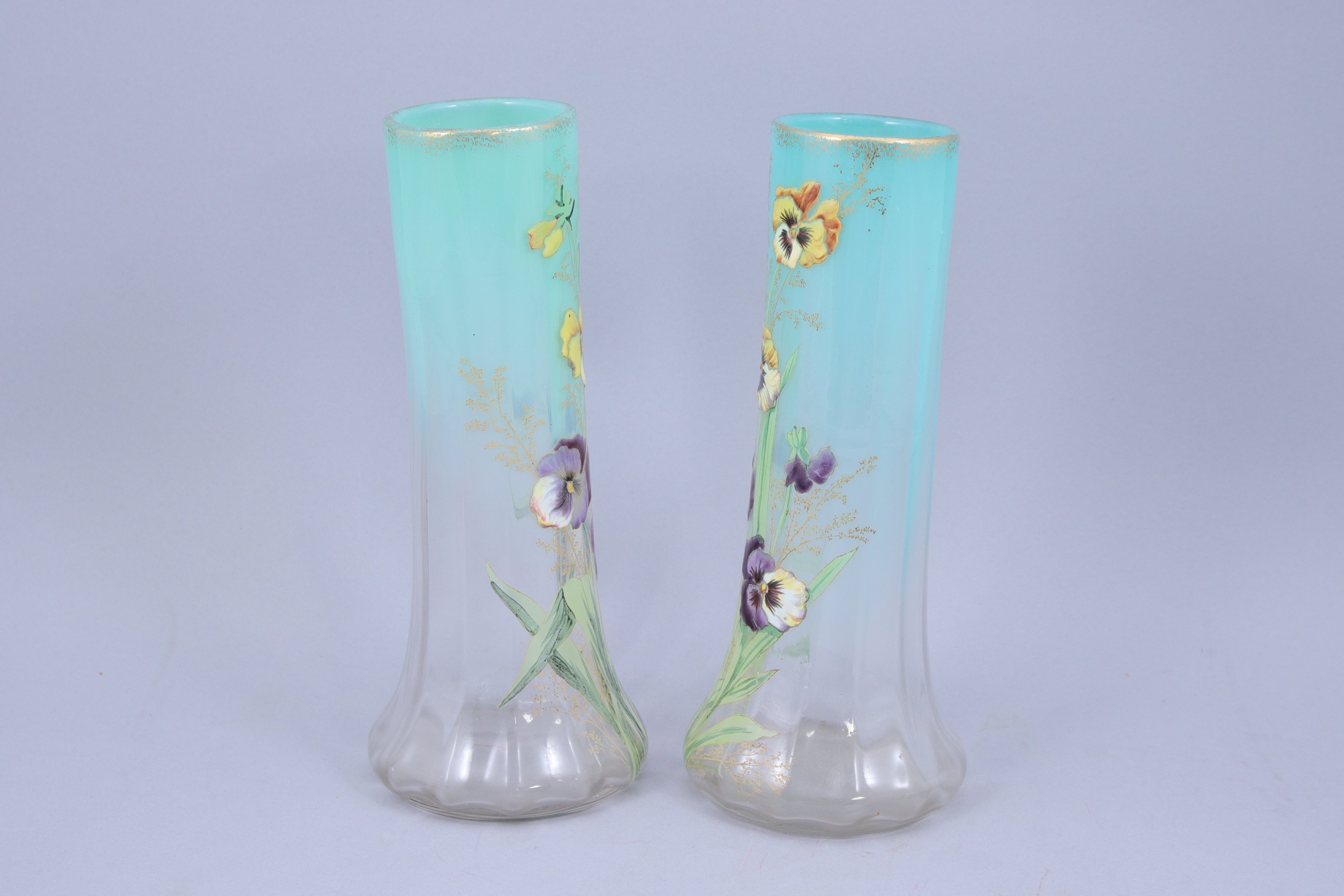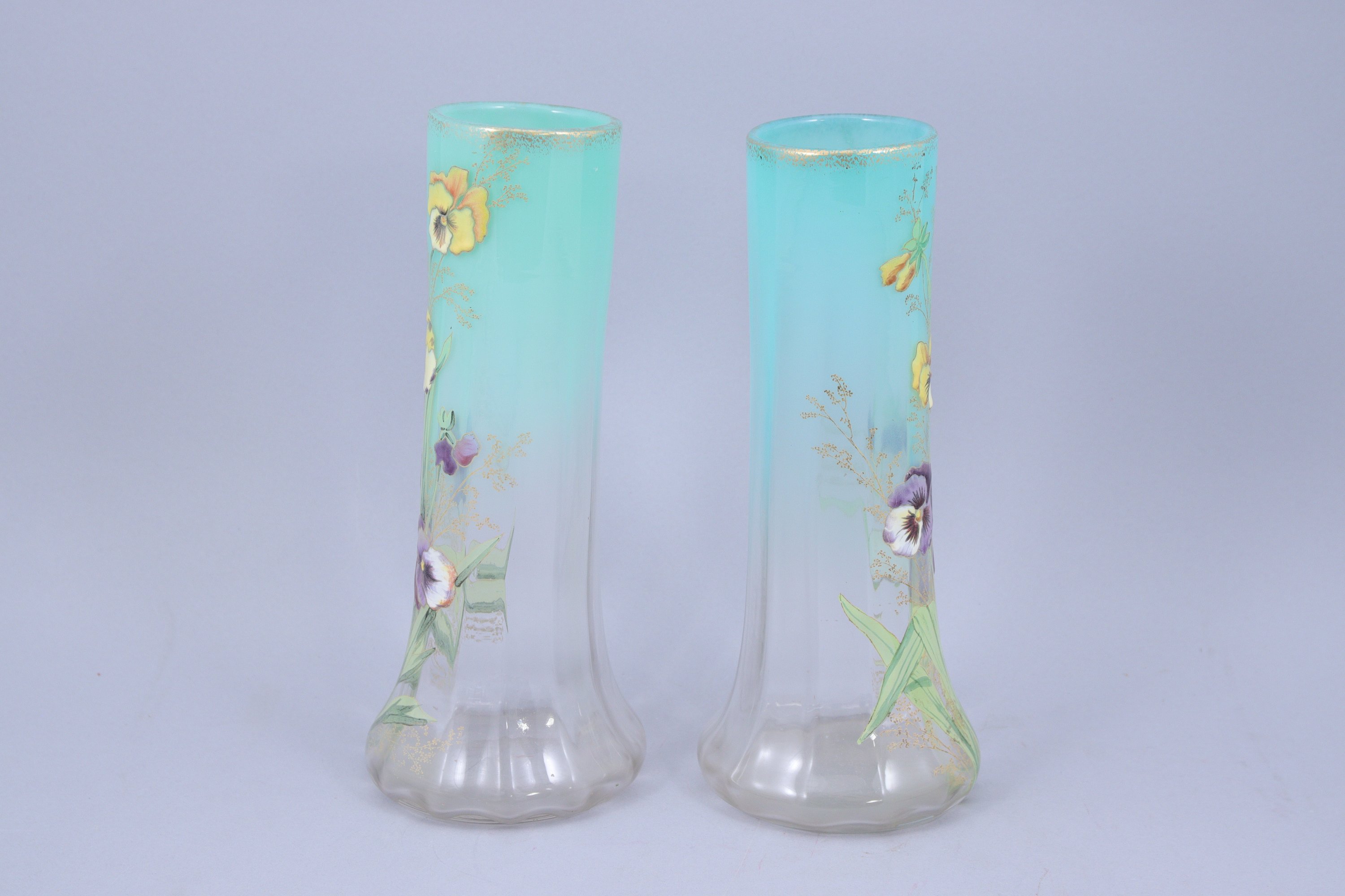 en verre émaillé et doré à long col, à décor de pensées. L'intérieur à pans coupés.