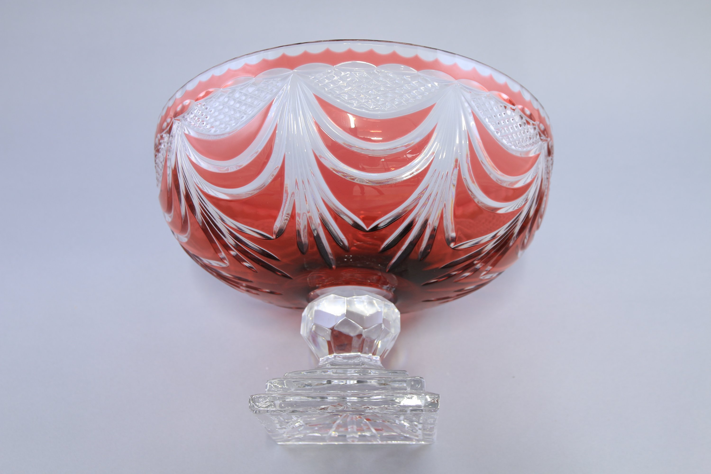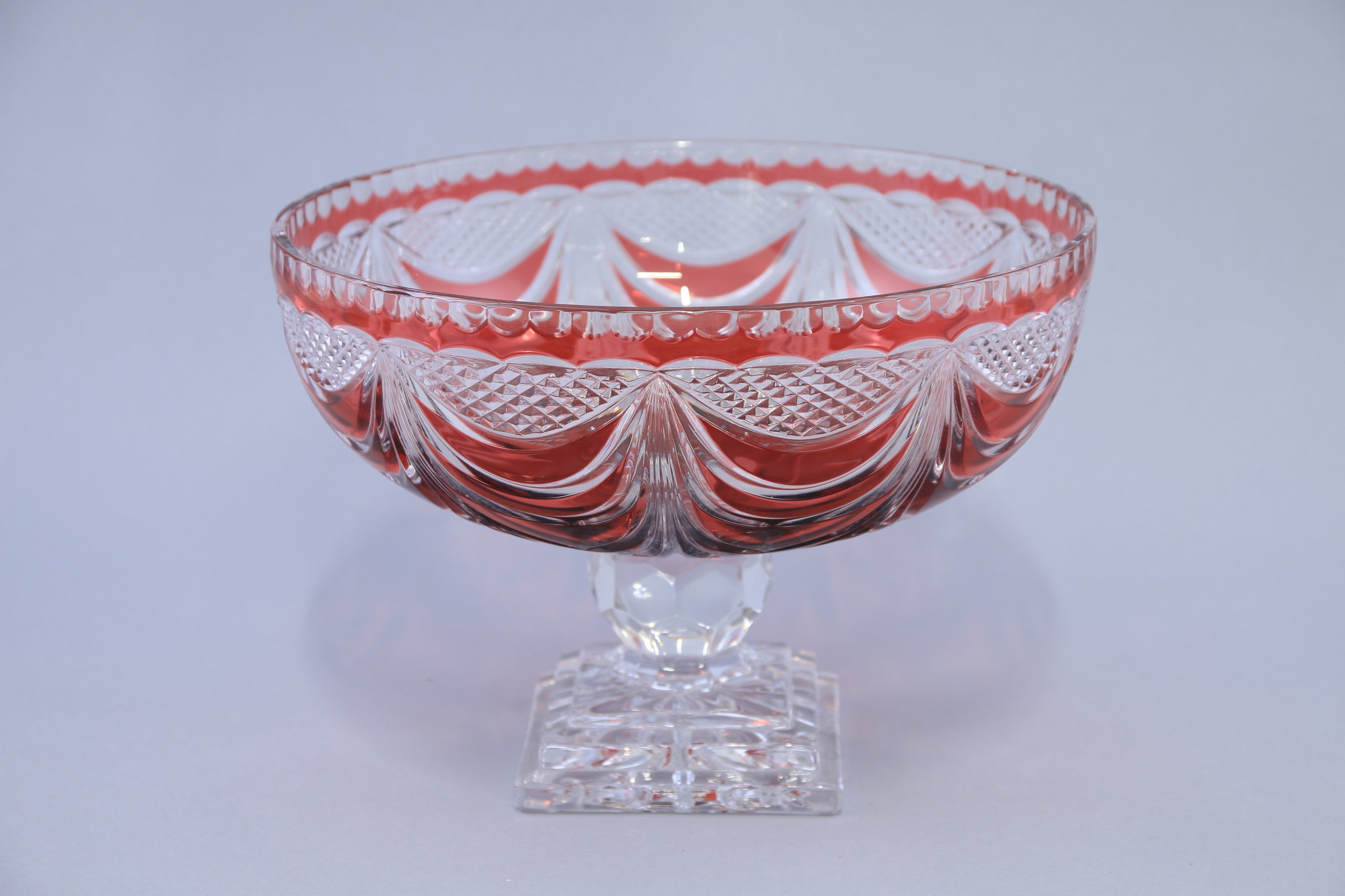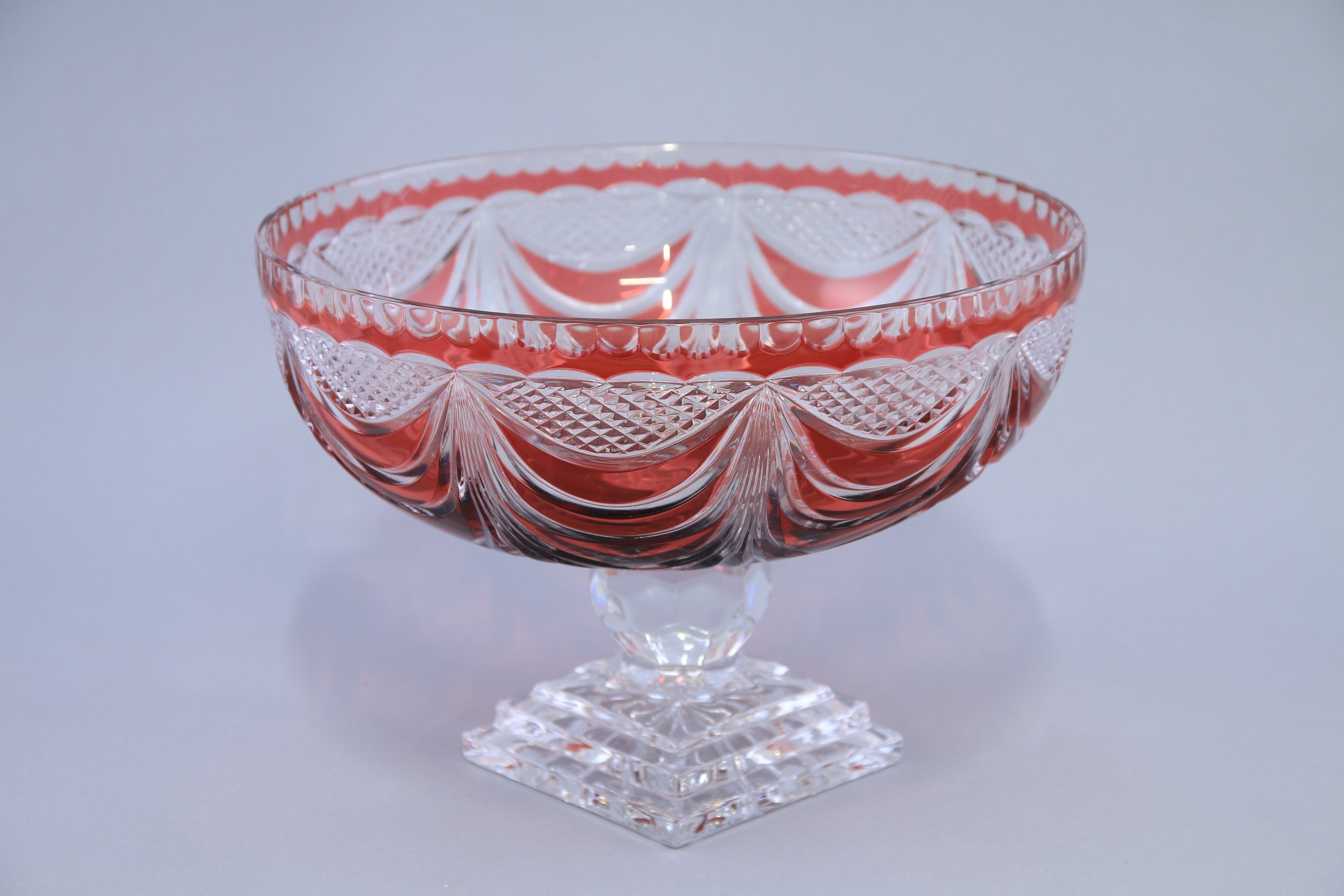 en cristal rose et blanc à décor de draperies en alternance de pointes de diamants. Elle repose sur un pied à facettes terminé par un socle carré à trois niveaux.