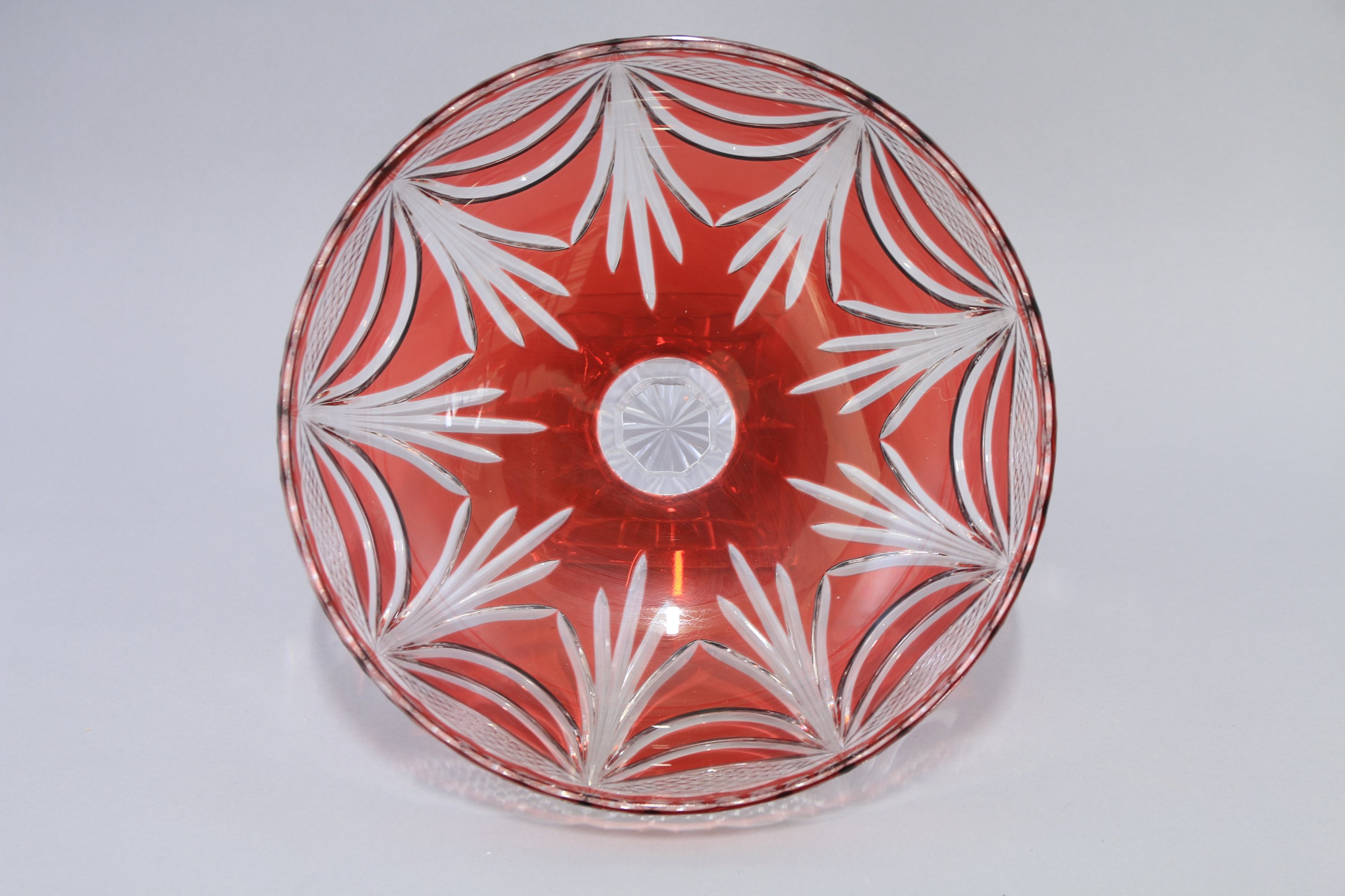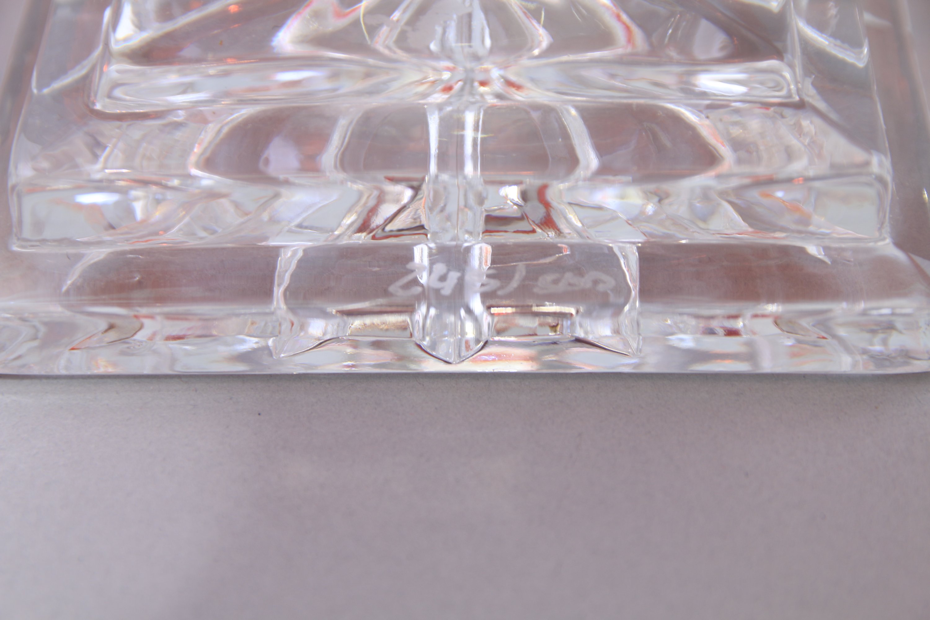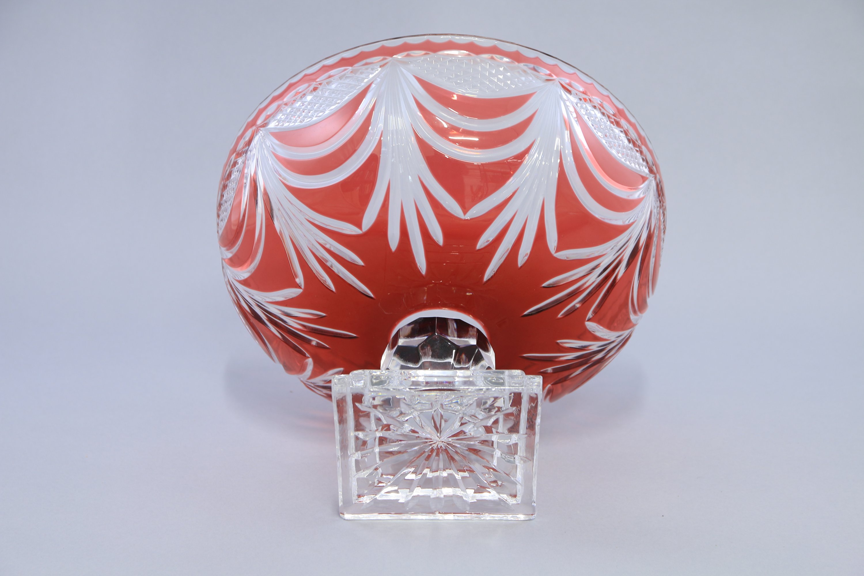 en cristal rose et blanc à décor de draperies en alternance de pointes de diamants. Elle repose sur un pied à facettes terminé par un socle carré à trois niveaux.
