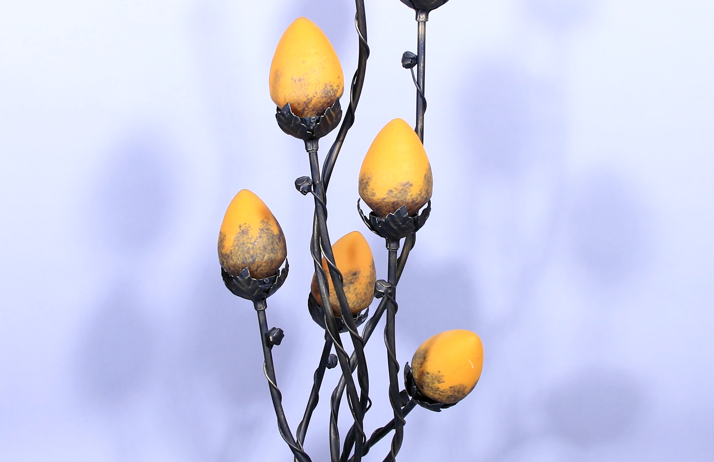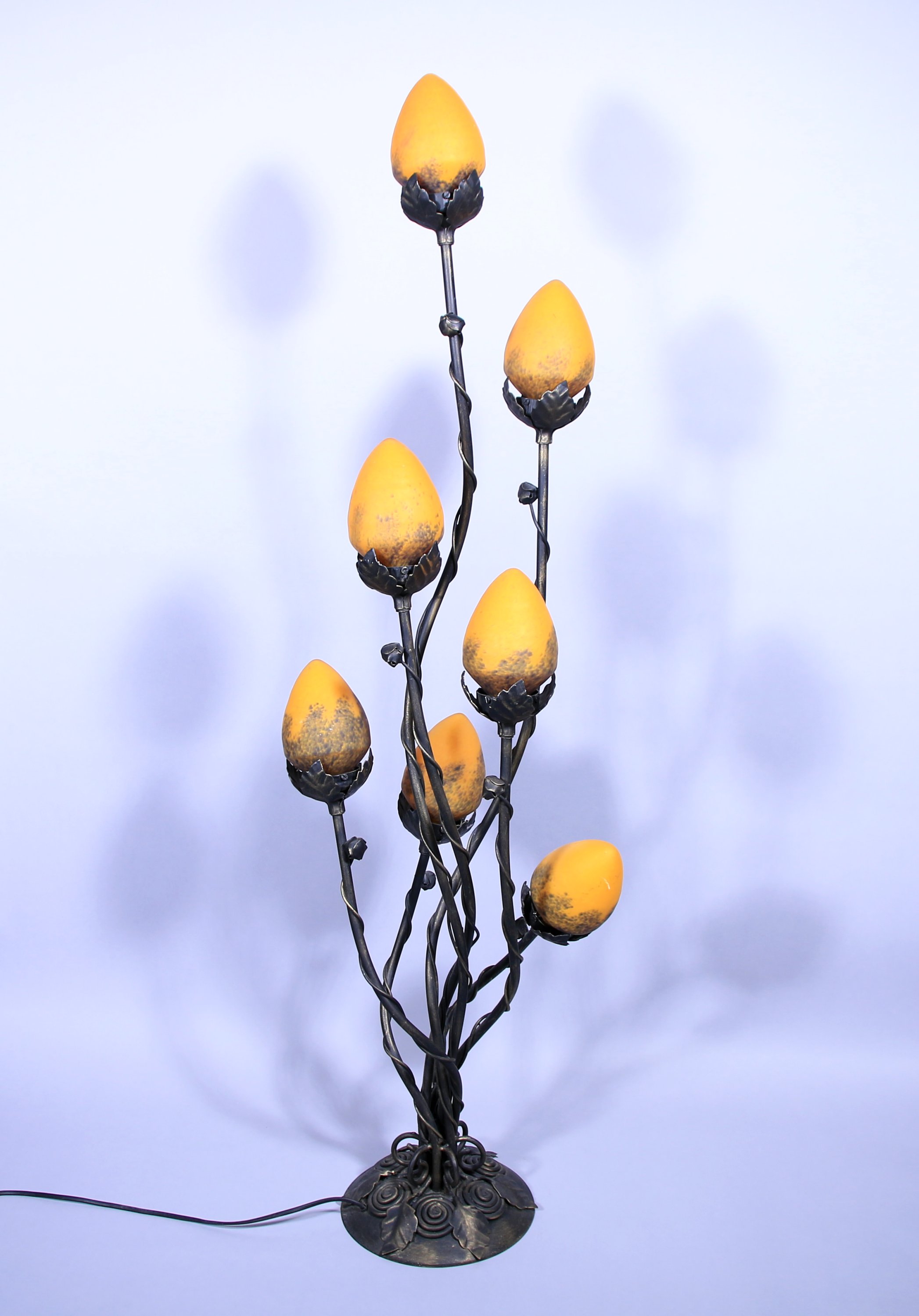en fer à sept lumières. Les bras entrecroisés en forme de branches terminés par des globes en verre orangés flammés reposent sur un socle à enroulements et motifs de feuille.