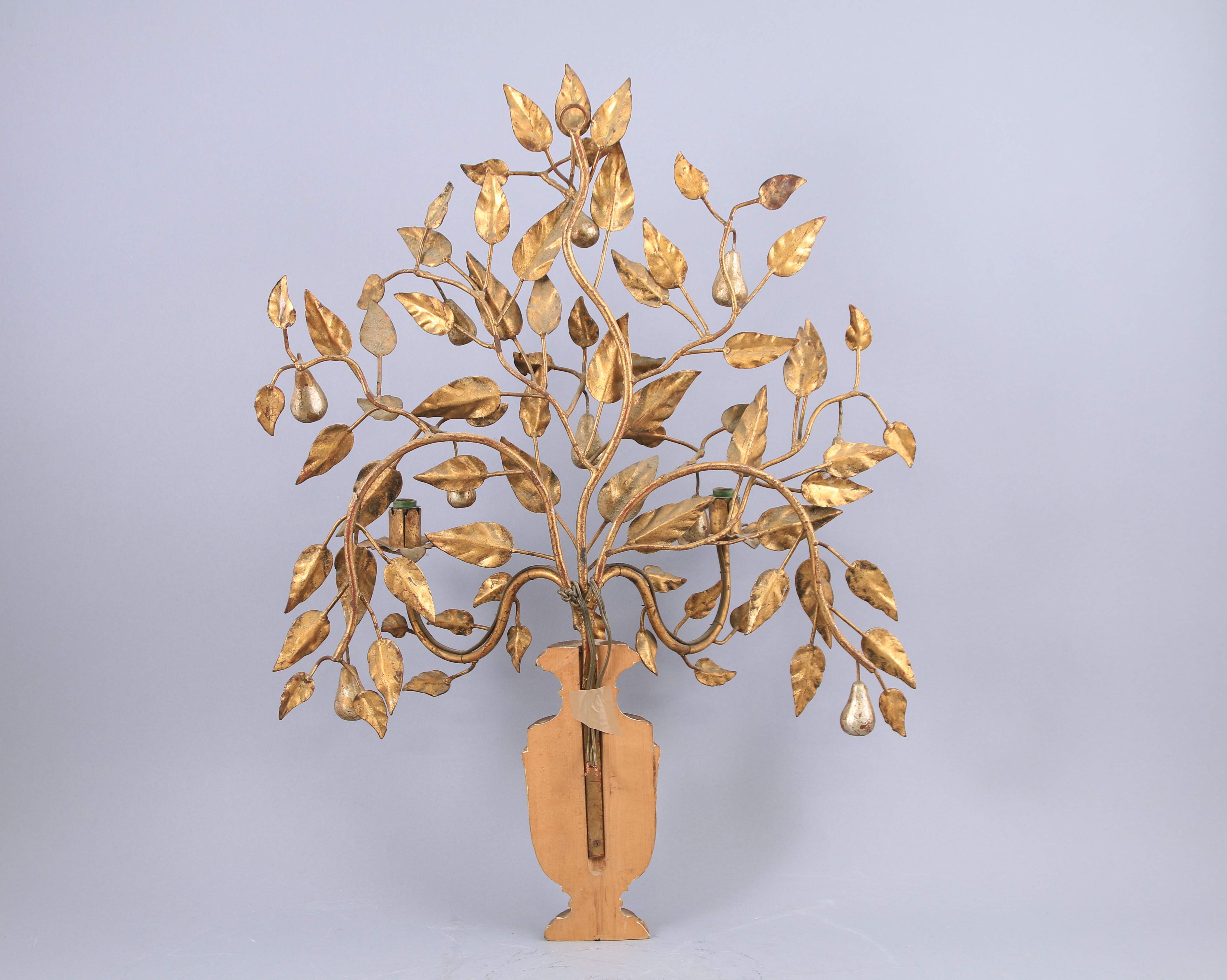 en bois et bronze doré. Deux bras de lumière sortent d'une cassolette dans un entourage de branches de poirier.