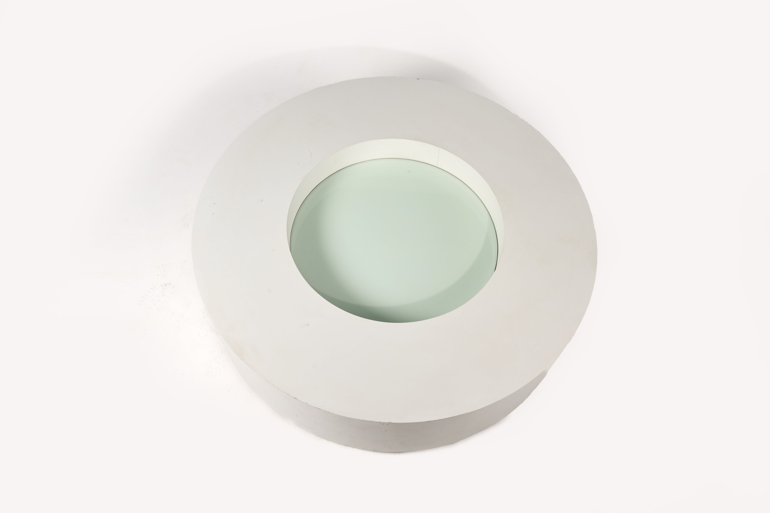 de forme circulaire en stratifié blanc et intérieur à plateau tournant en verre vert.