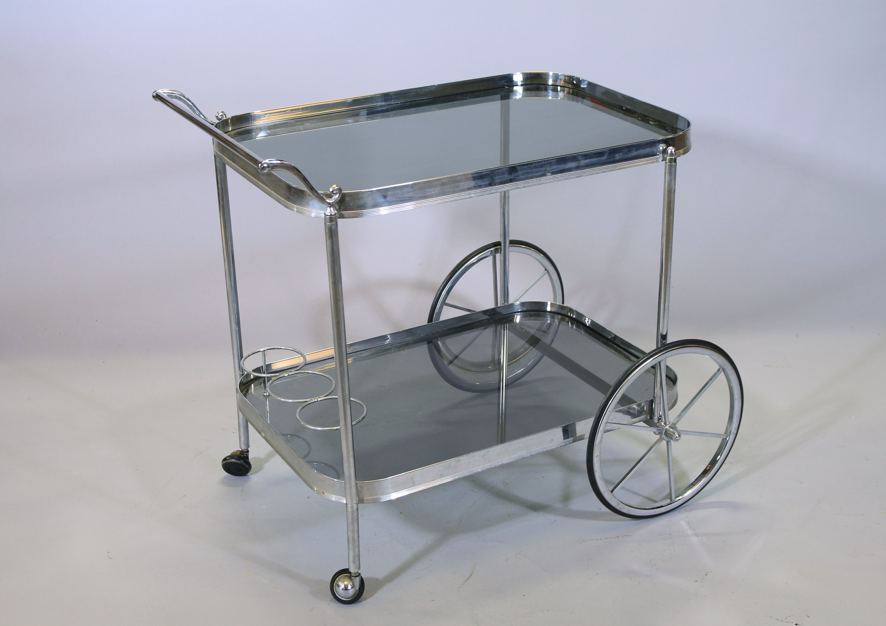 en métal chromé et verre à deux plateaux. Le niveau inférieur équipé d'un porte-bouteille à trois emplacements, montant antérieur terminé par des roues à rayon et postérieur par des roulettes.