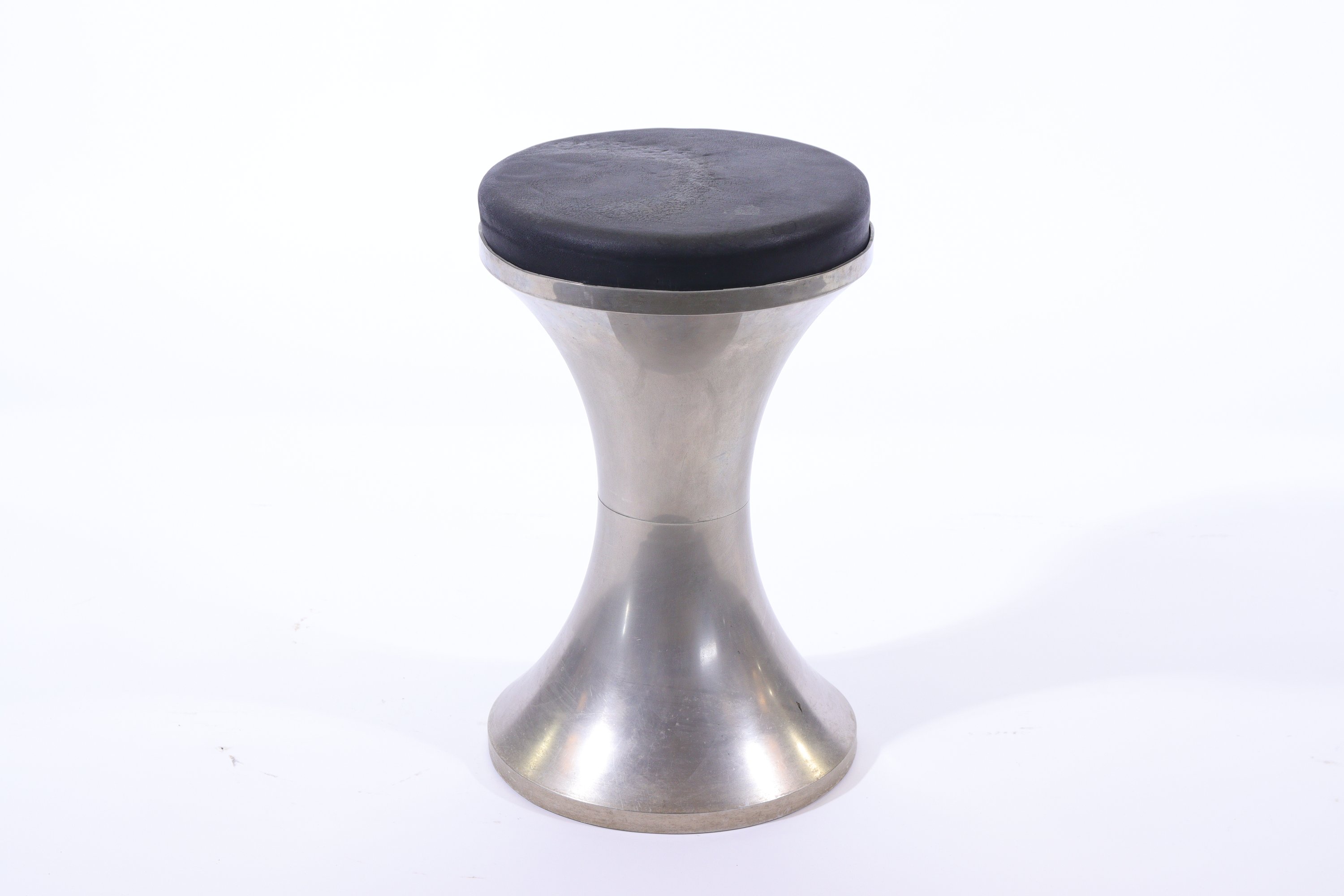 Joint : Henry Massonnet (Français, 1922-2005), Tabouret modèle "tam tam" c. 1968. Matière plastique à pellicule métallique. Assise en mousse recouverte de skaï noir. Haut. 48,5 Diam. 30 cm. (petits accidents). Oeuvres en rapport : n° 2009.6.213., Saint-Etienne, Musée d'art moderne et contemporain.
