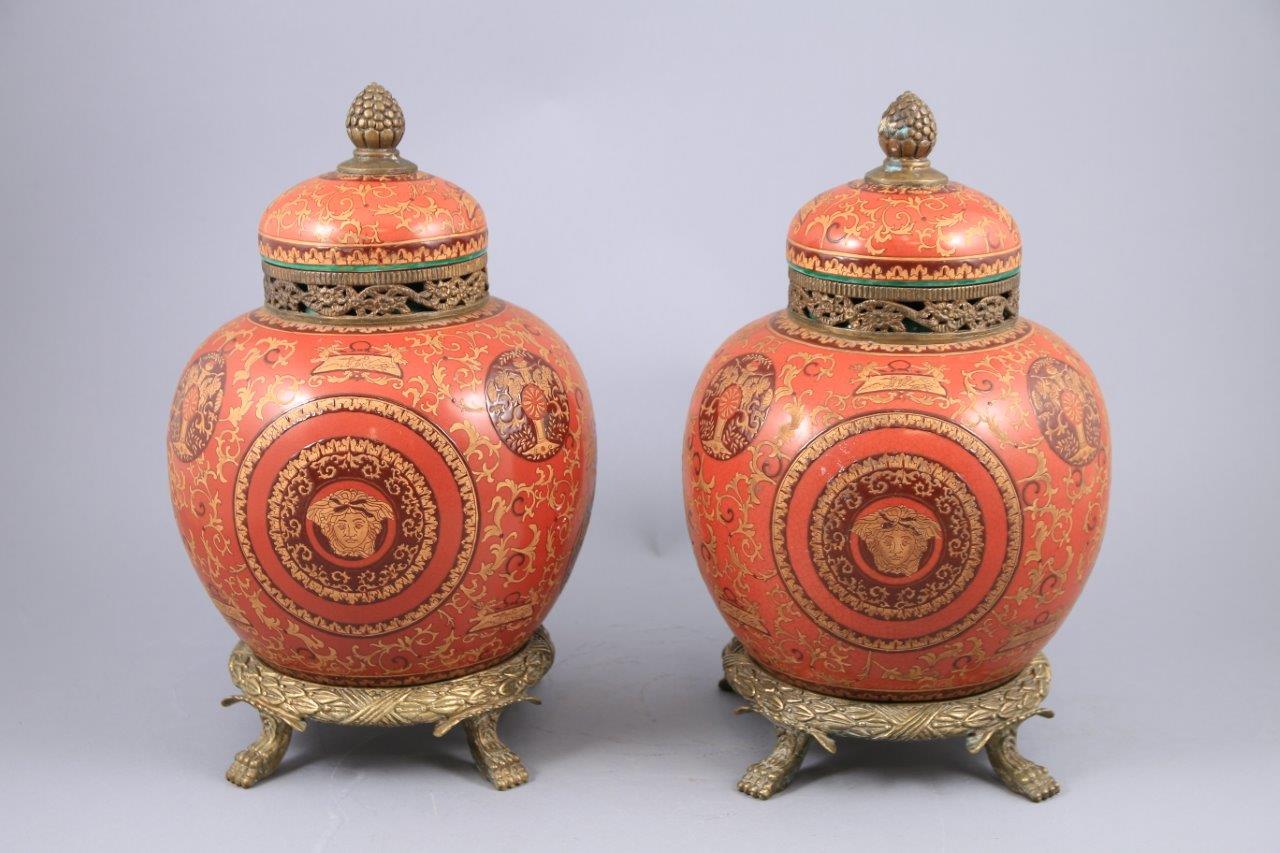 montés en bronze. Le dessus en forme de pomme de pin, les panses à décor de médaillon à la Méduse dans un entourage de rinceaux. Le piétement à décor de feuilles de laurier.