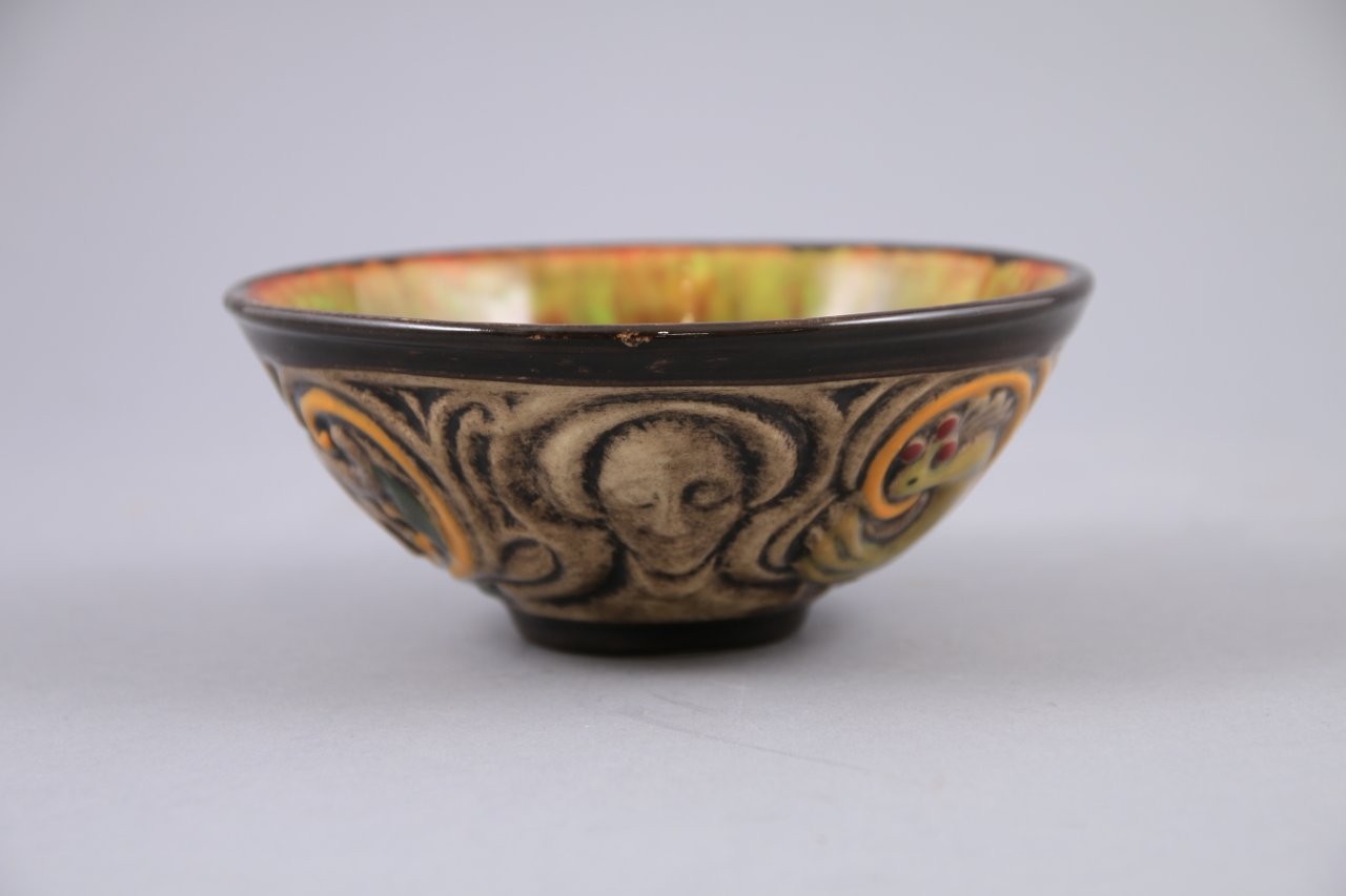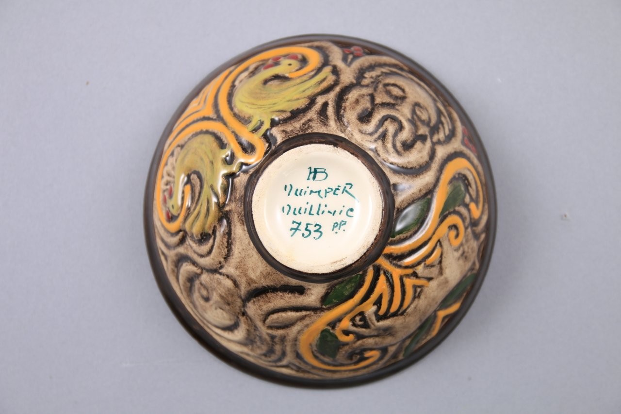 Joint : René Quillivic (Français, 1879-1969) chez Henriot à Quimper. Bol en faïence à décor en bas-relief sur la panse de tête d'homme, de femme, coqs et loup. L'intérieur flammé. Haut. 6 Diam. 15 cm.