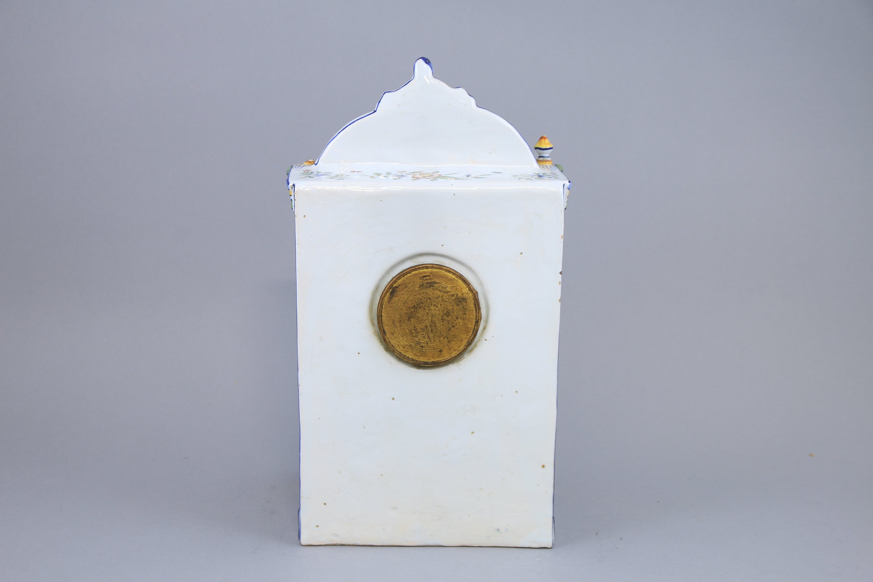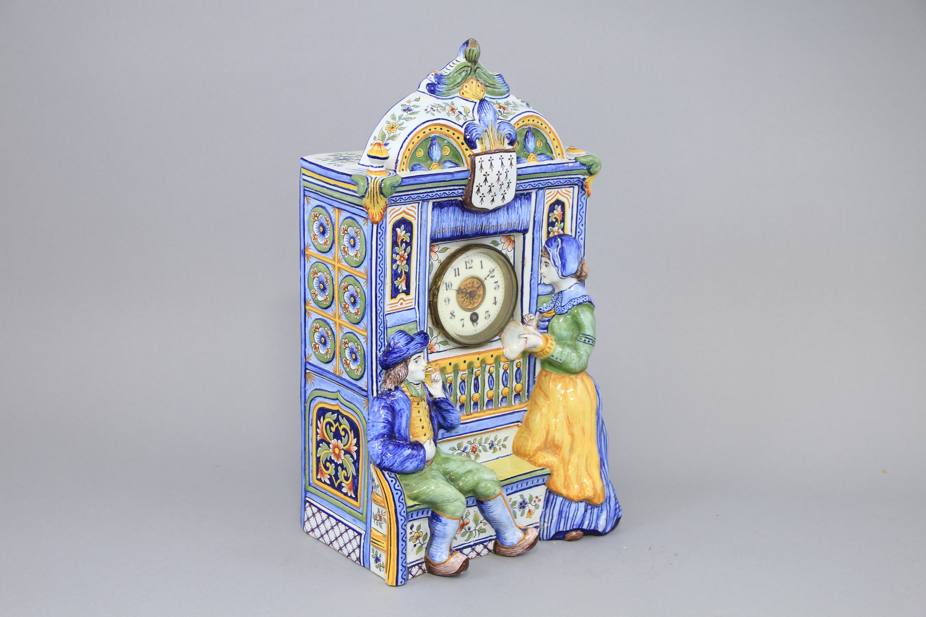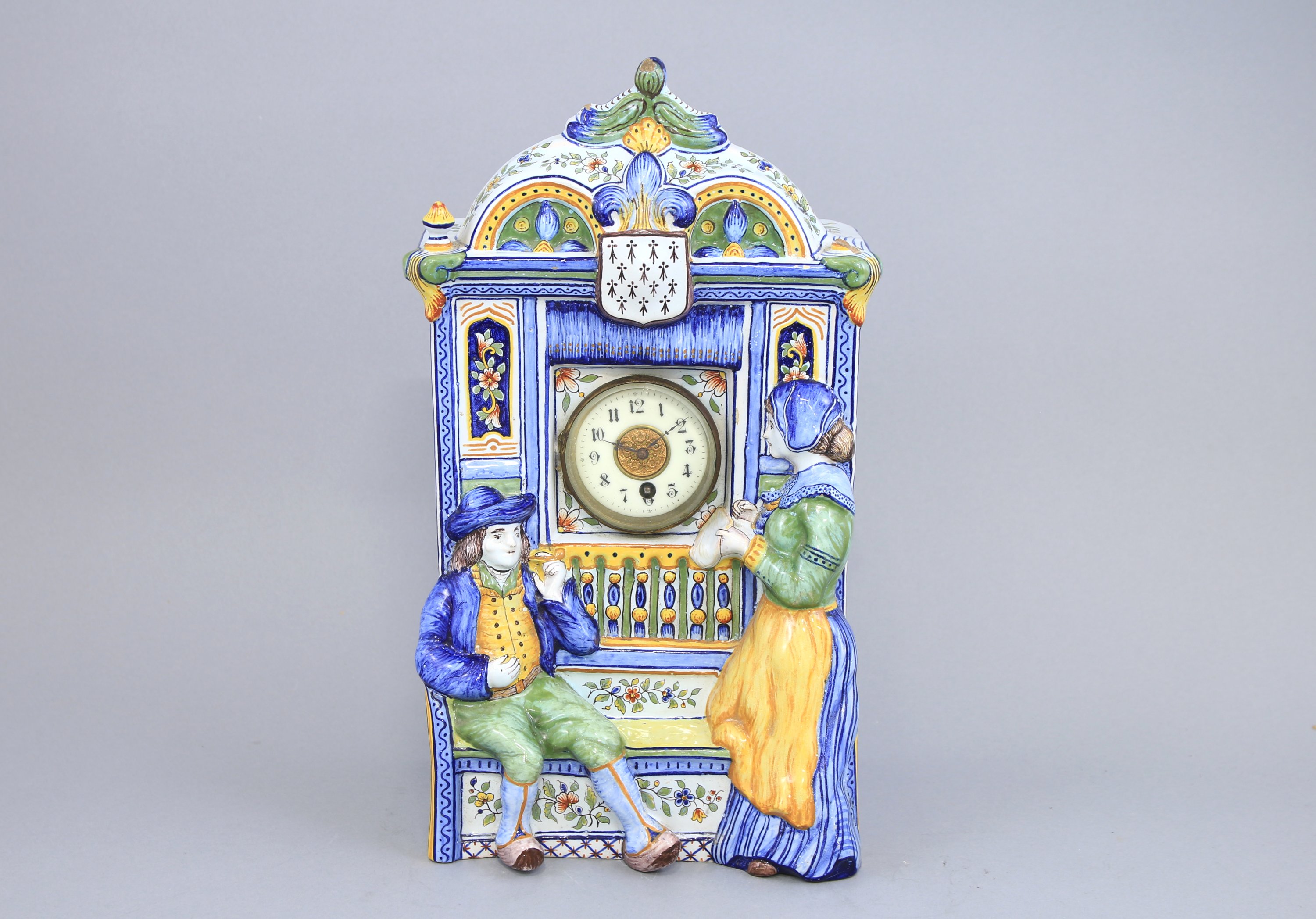 en faïence polychrome. Le cadran émaillé blanc indique les heures en chiffres arabes, les minutes par des bâtonnets. Il est surmonté d'un fronton décoré d'une fleur de lys et un écusson orné de motifs d'hermines et entouré d'un couple de Bretons, l'homme assis sur un banc et la femme cousant. Les côtés présentent une ornementation de caissons.