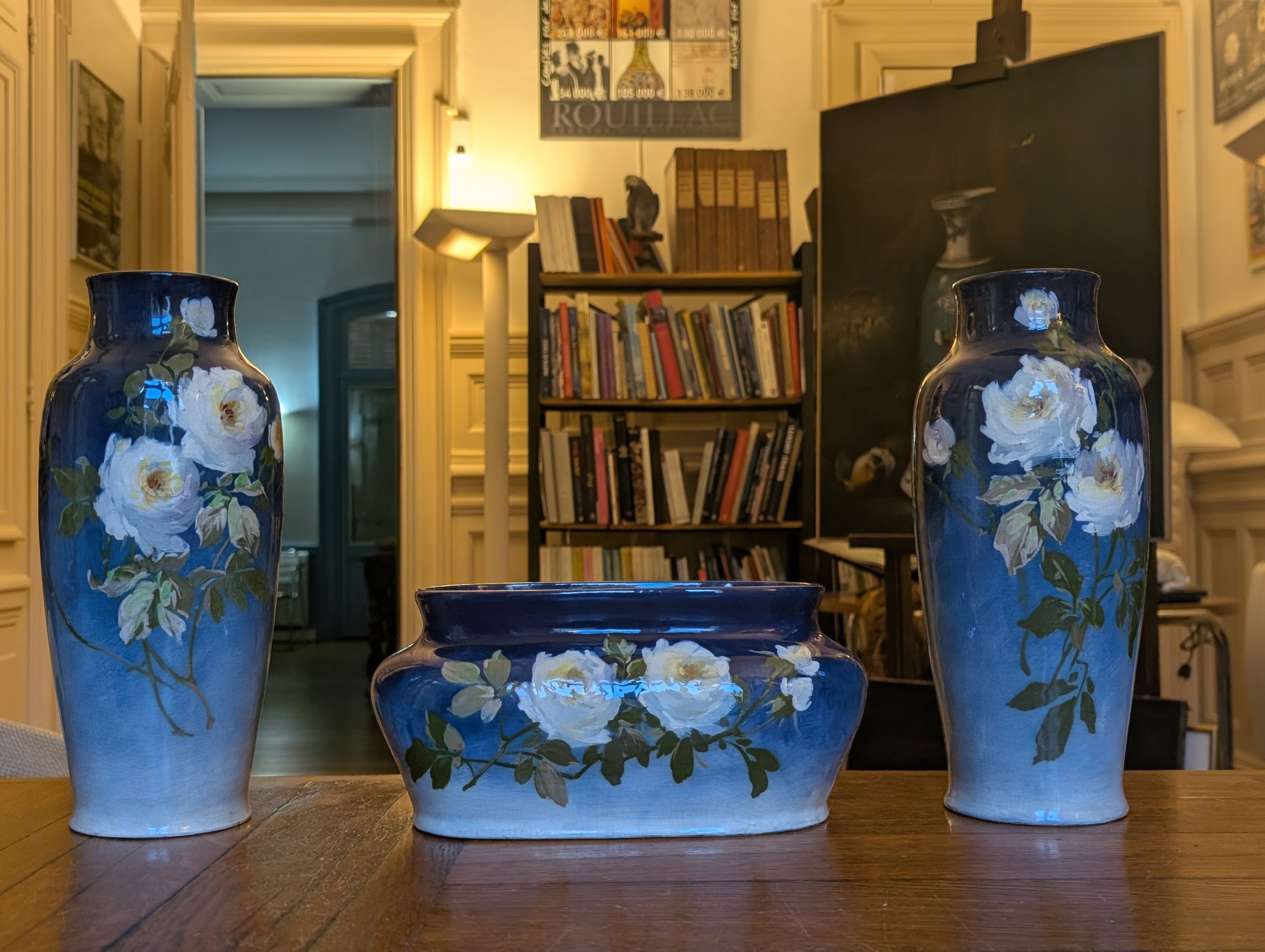 en barbotine impressionniste, à décor de jetée de roses sur un fond dégradé bleu.