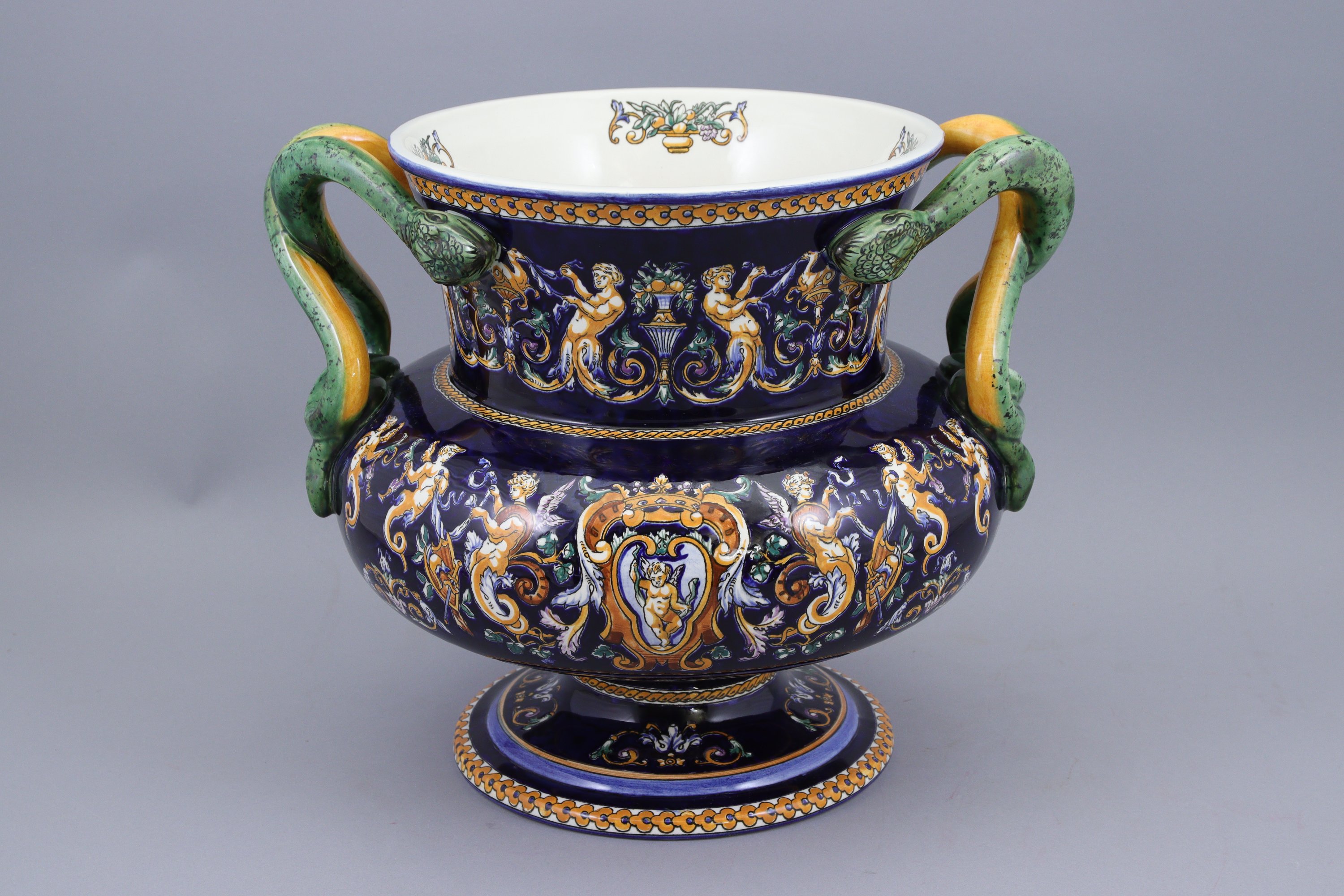 en faïence, à décor Renaissance sur fond bleu. L'intérieur est orné de paniers fleuris, le col de rinceaux et chimères. La panse est ornée d'un cuir au putto entouré de sphinges et rinceaux. Les deux anses en forme de serpents.