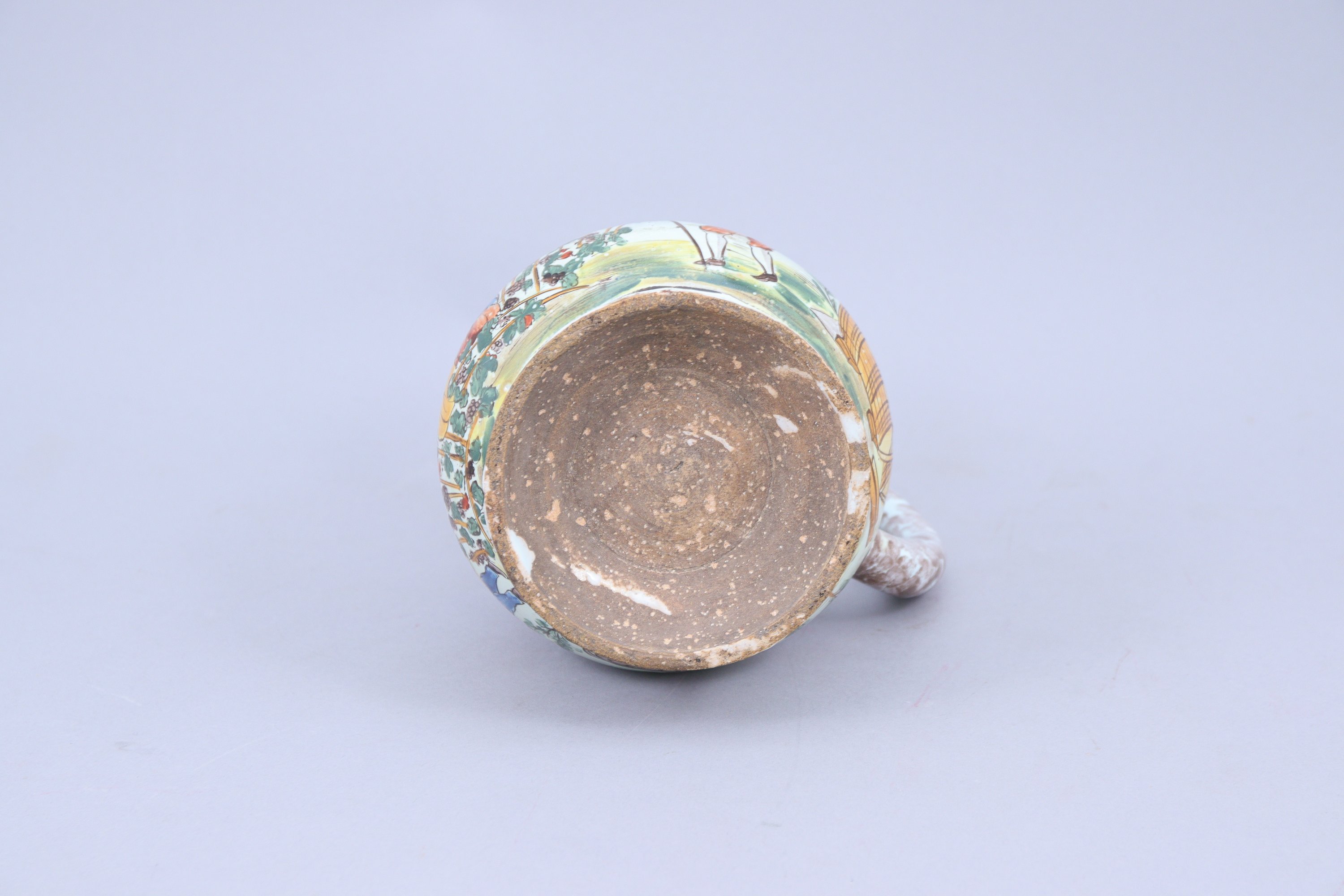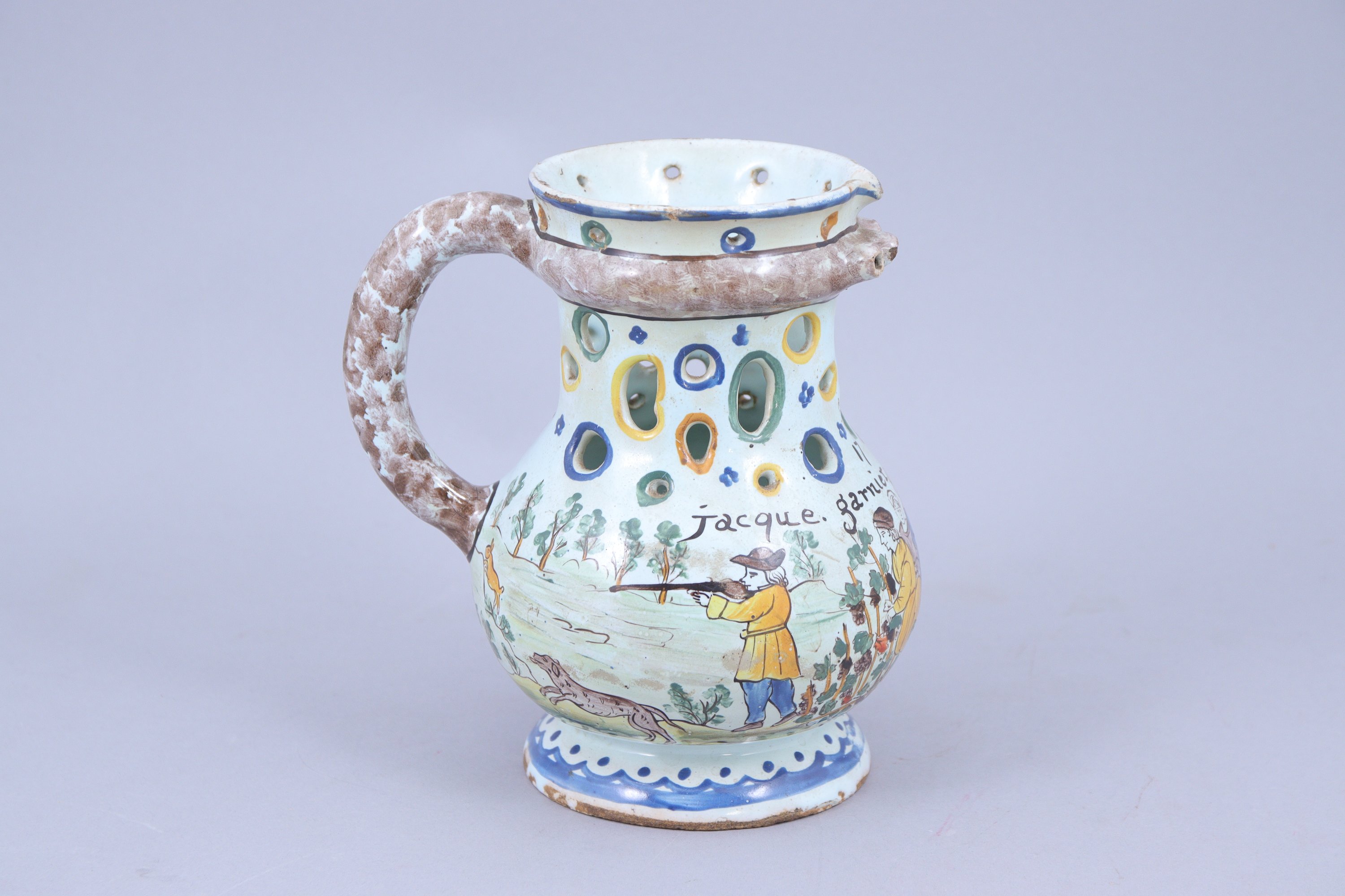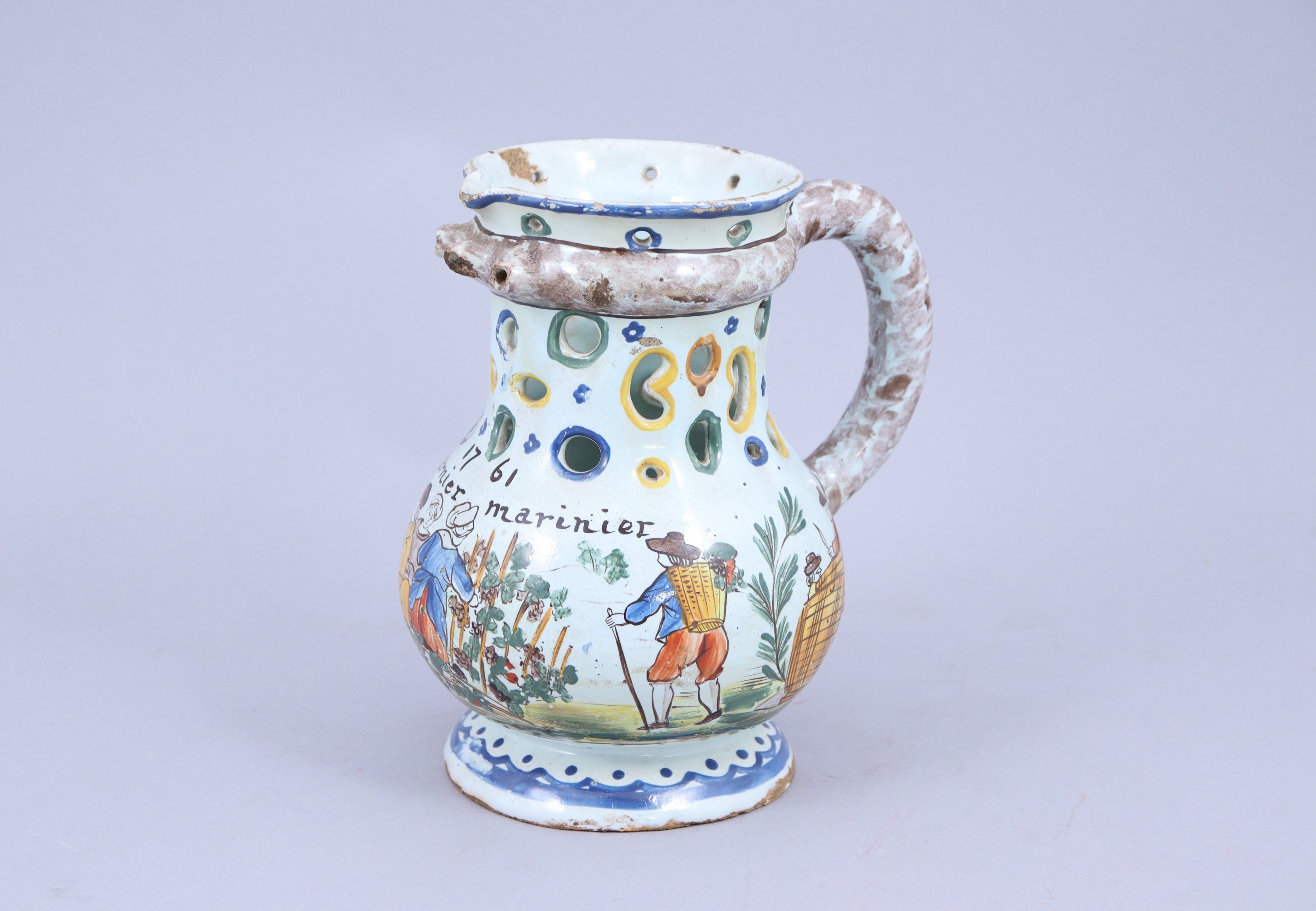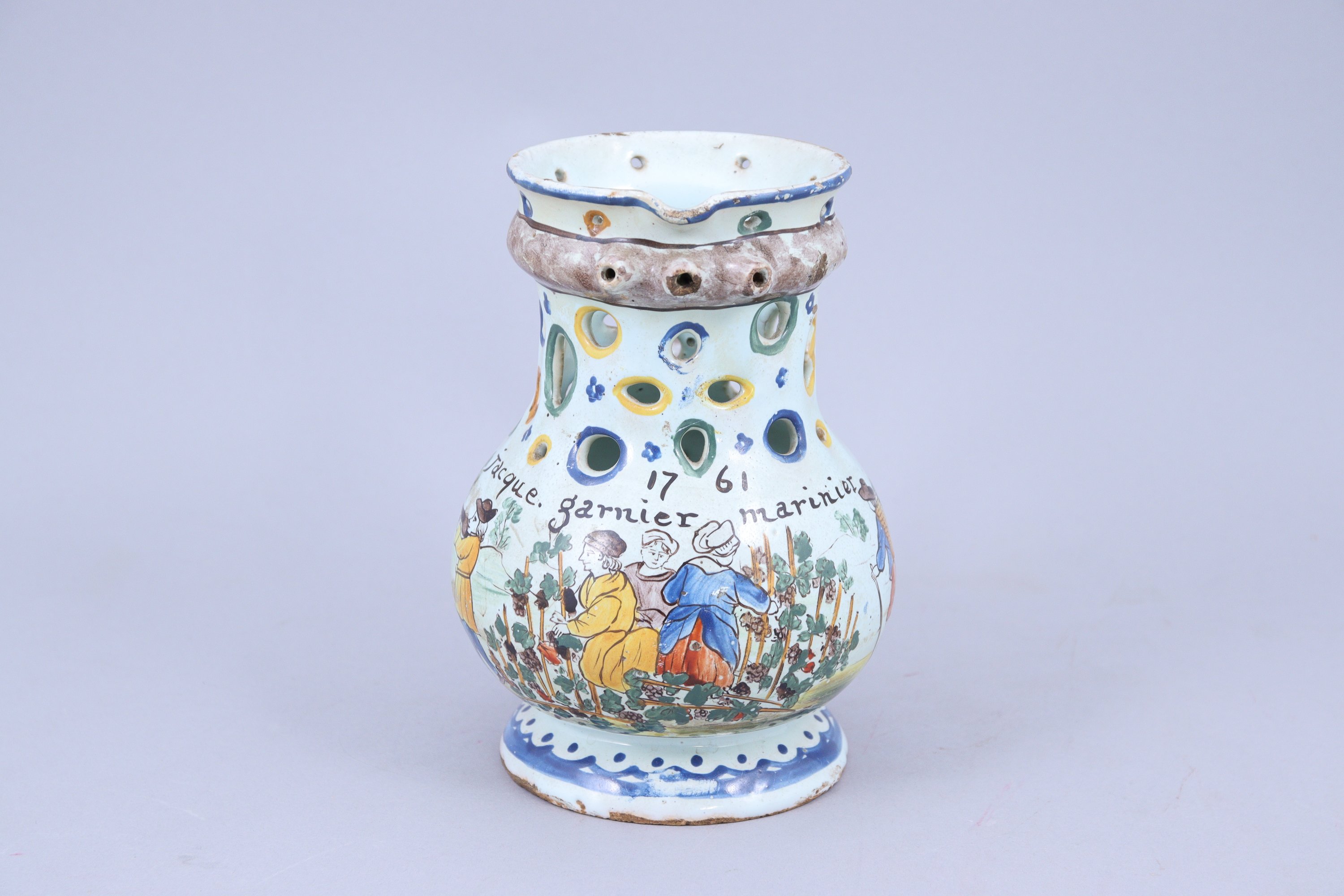 en faïence ajourée et émaillée. A décor polychrome d'une chasse au lapin et d'un groupe de vendangeurs. Porte une mention "Jacque Garnier Marinier 1761".