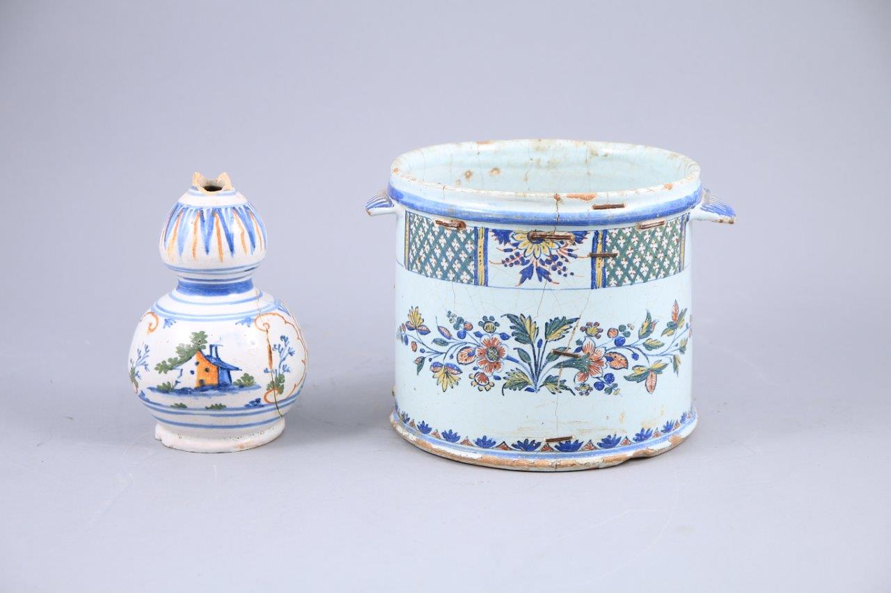 Joint : Vase double gourde en faïence à décor de maison. Haut. 17 cm (importants accidents et manques).