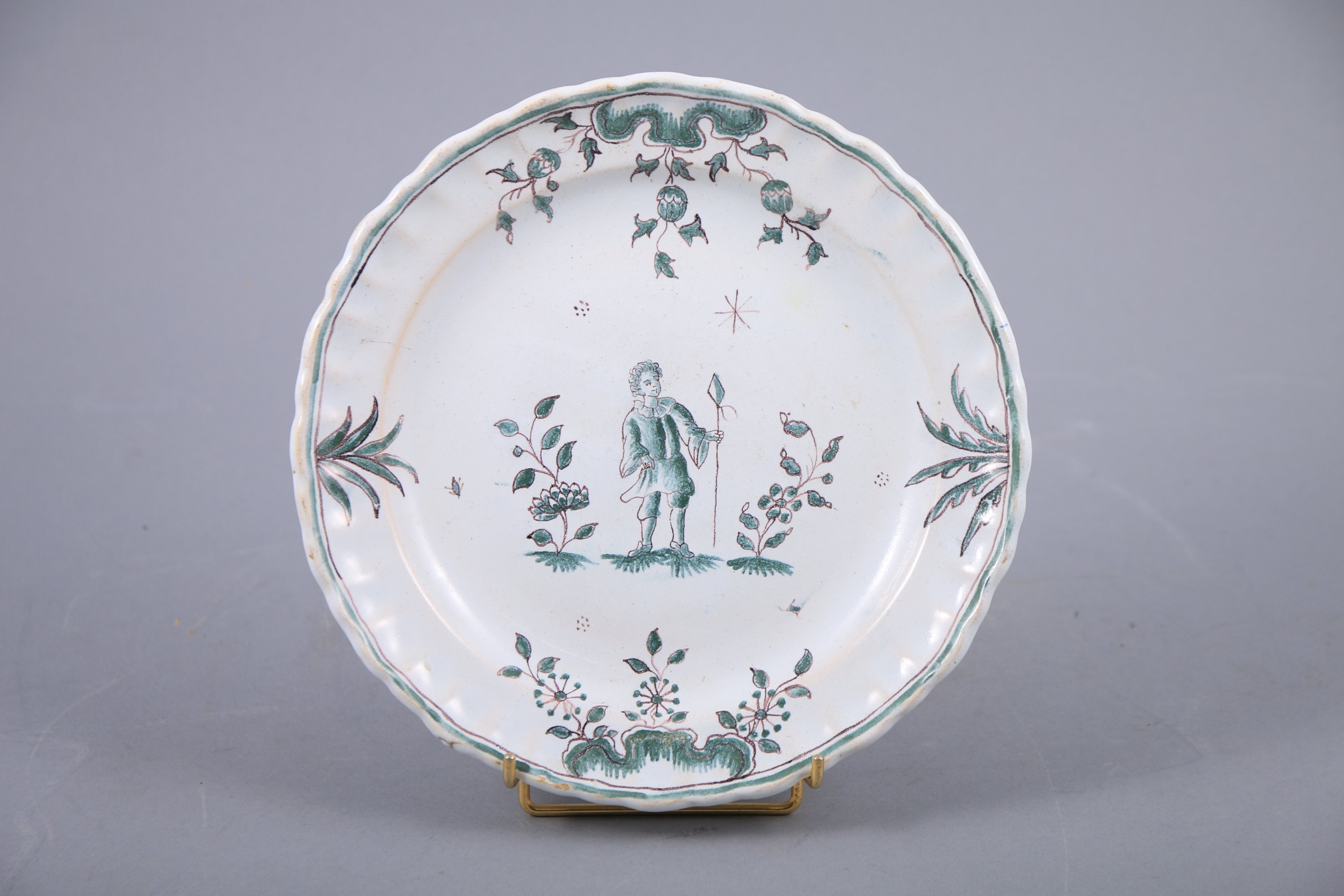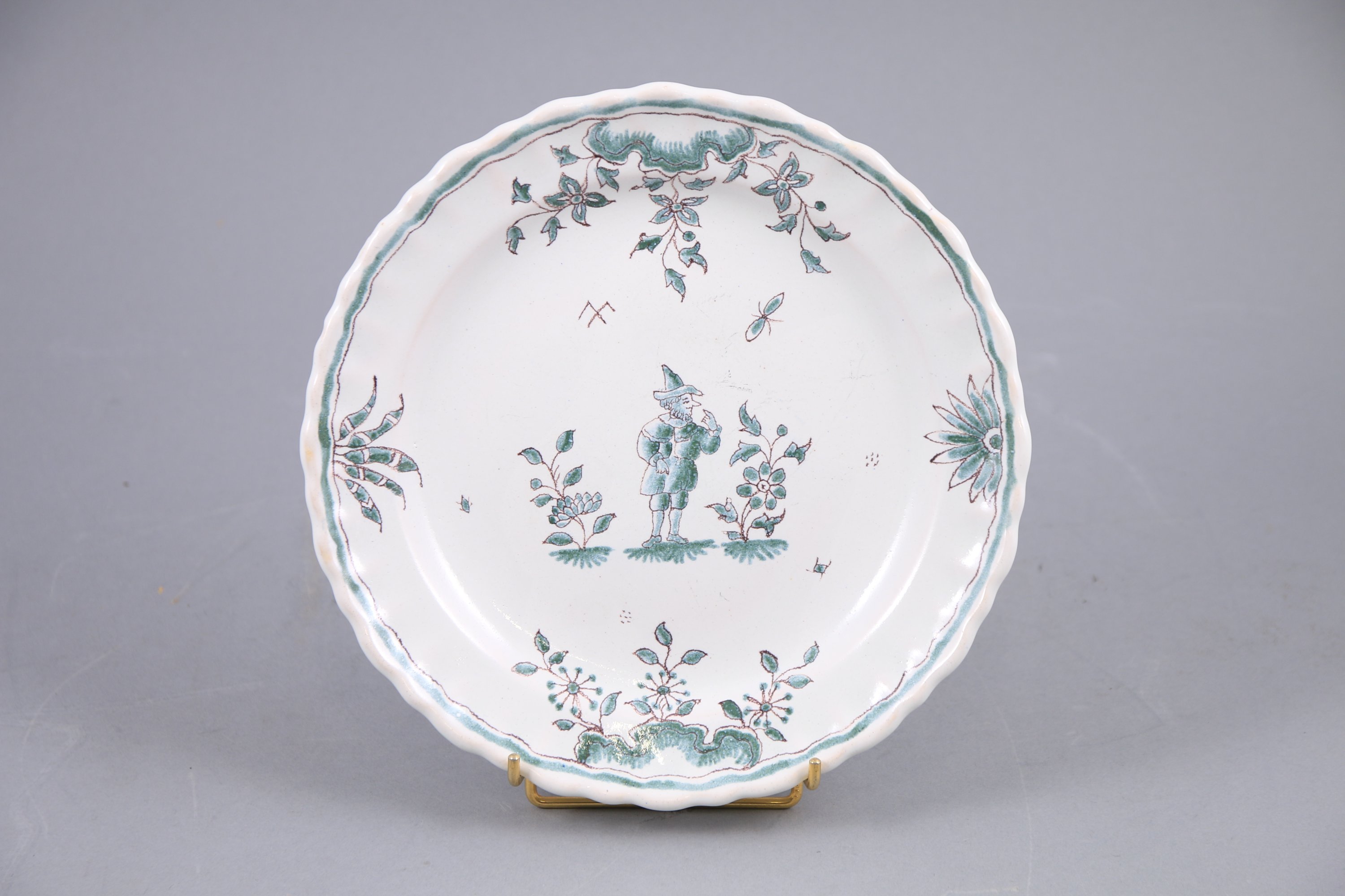 Joint : Lunéville, XVIIIe siècle. Assiette en faïence à décor central d'un chinois chassant des insectes assis sur trois rochers. Diam. 24,5 cm. (éclats).