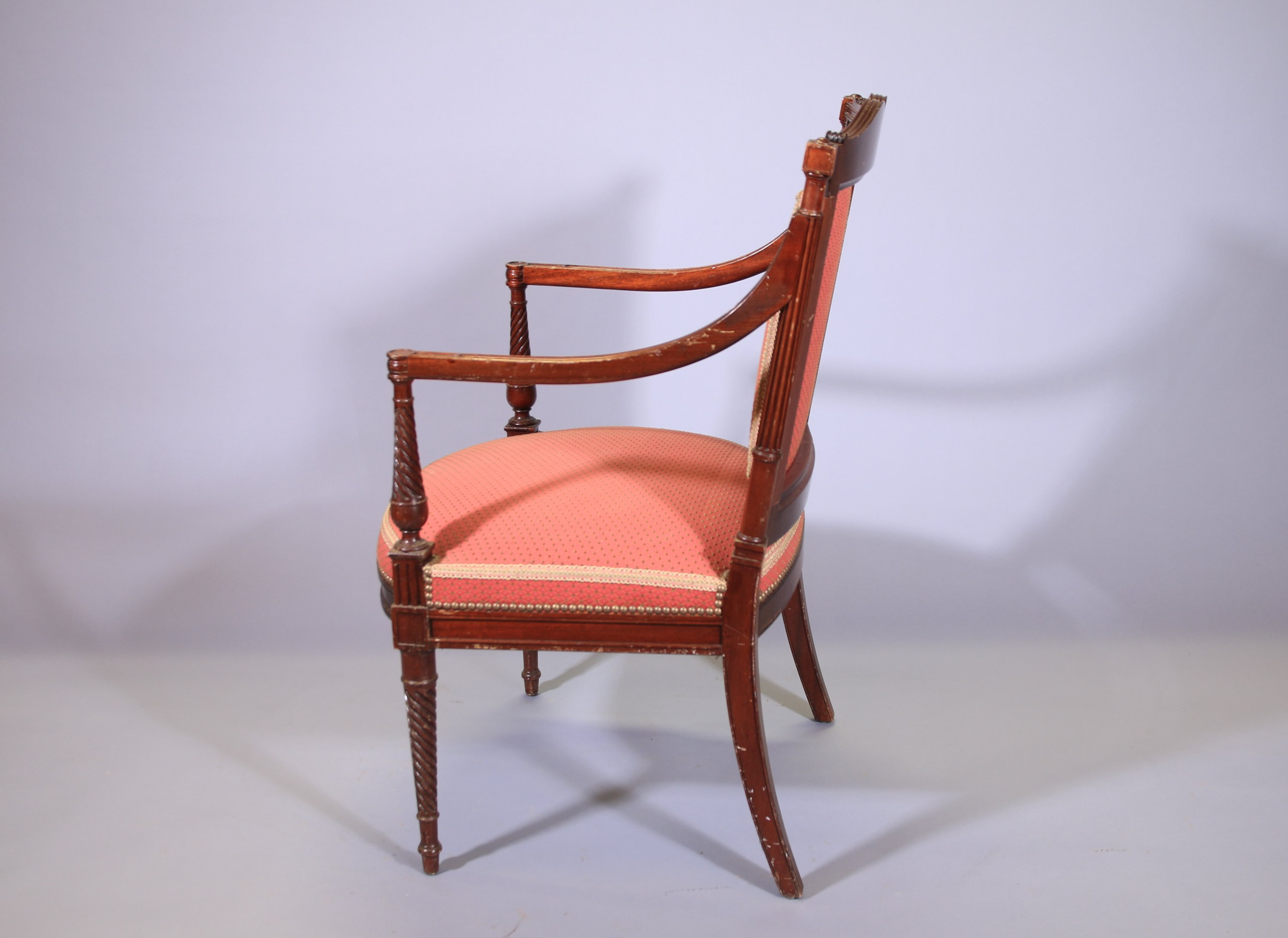 en acajou et placage d'acajou. Dossier ajouré surmonté de volutes, montants cannelés, accotoirs terminés par des colonnes torsadées et ceinture mouvementée. Il repose sur quatre pieds, les antérieurs fuselés et torsadés, les postérieurs en sabre.