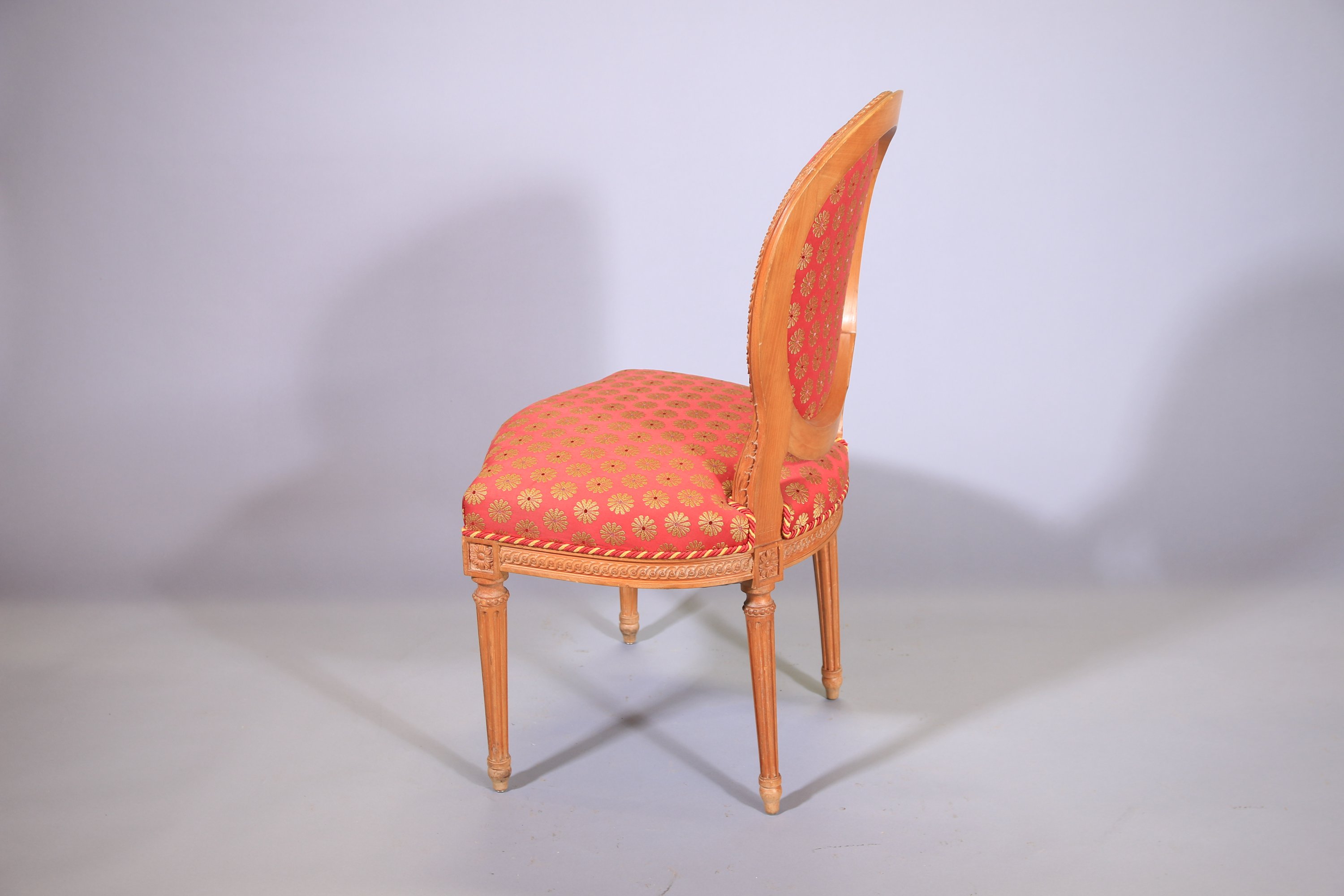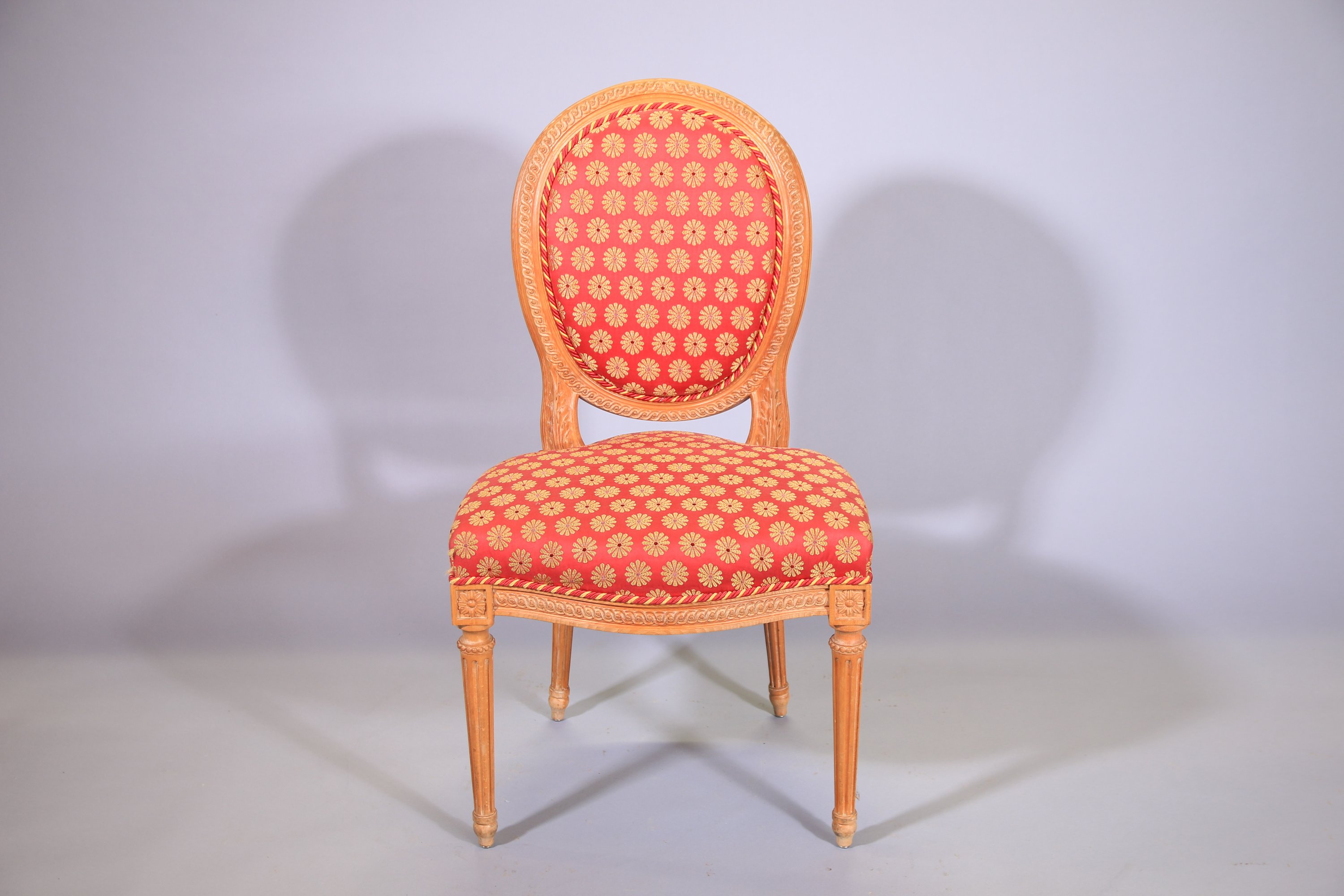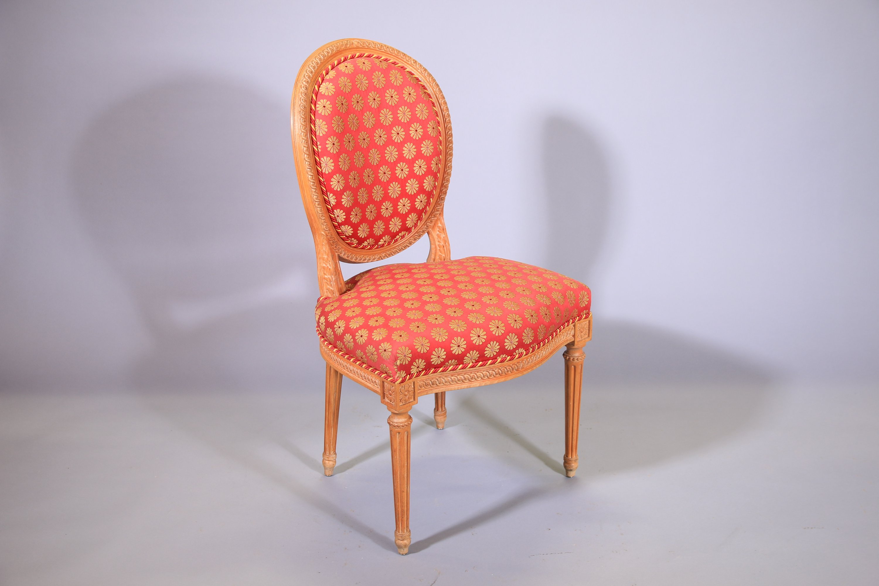 en hêtre. Dossier rond à décor chantourné d'une frise de piastres et végétaux et ceinture chantournée d'une frise de piastres, dés de raccordement décorés de fleurettes. Elle repose sur quatre pieds fuselés et cannelés cerclés d'une frise de perles au sommet.