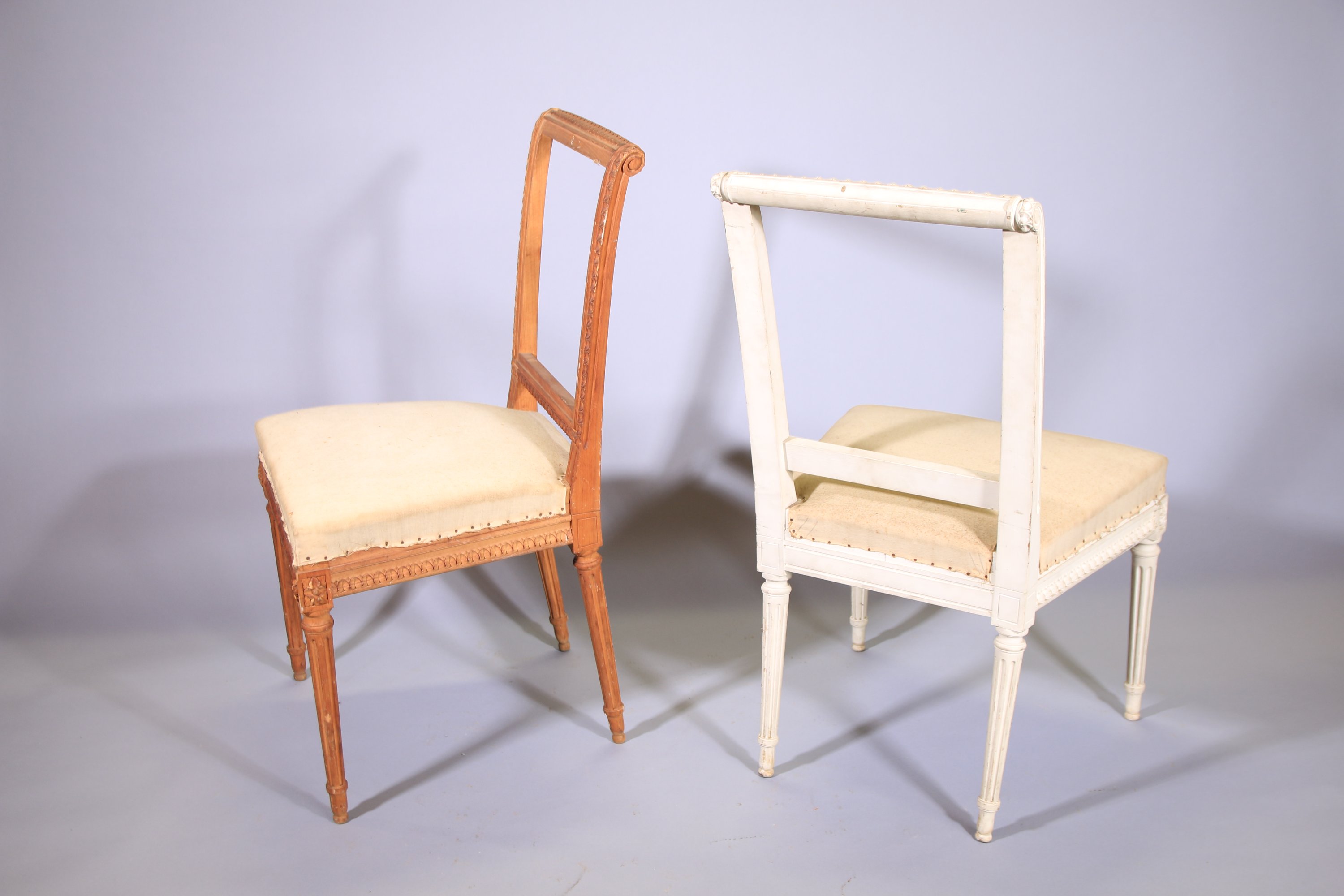 en hêtre, dont une laqué blanc. Dossier à enroulement et ceinture à décor d'une frise d'oves, dés de raccordement à décor de fleurs. Elles reposent sur quatre pieds fuselés et cannelés.