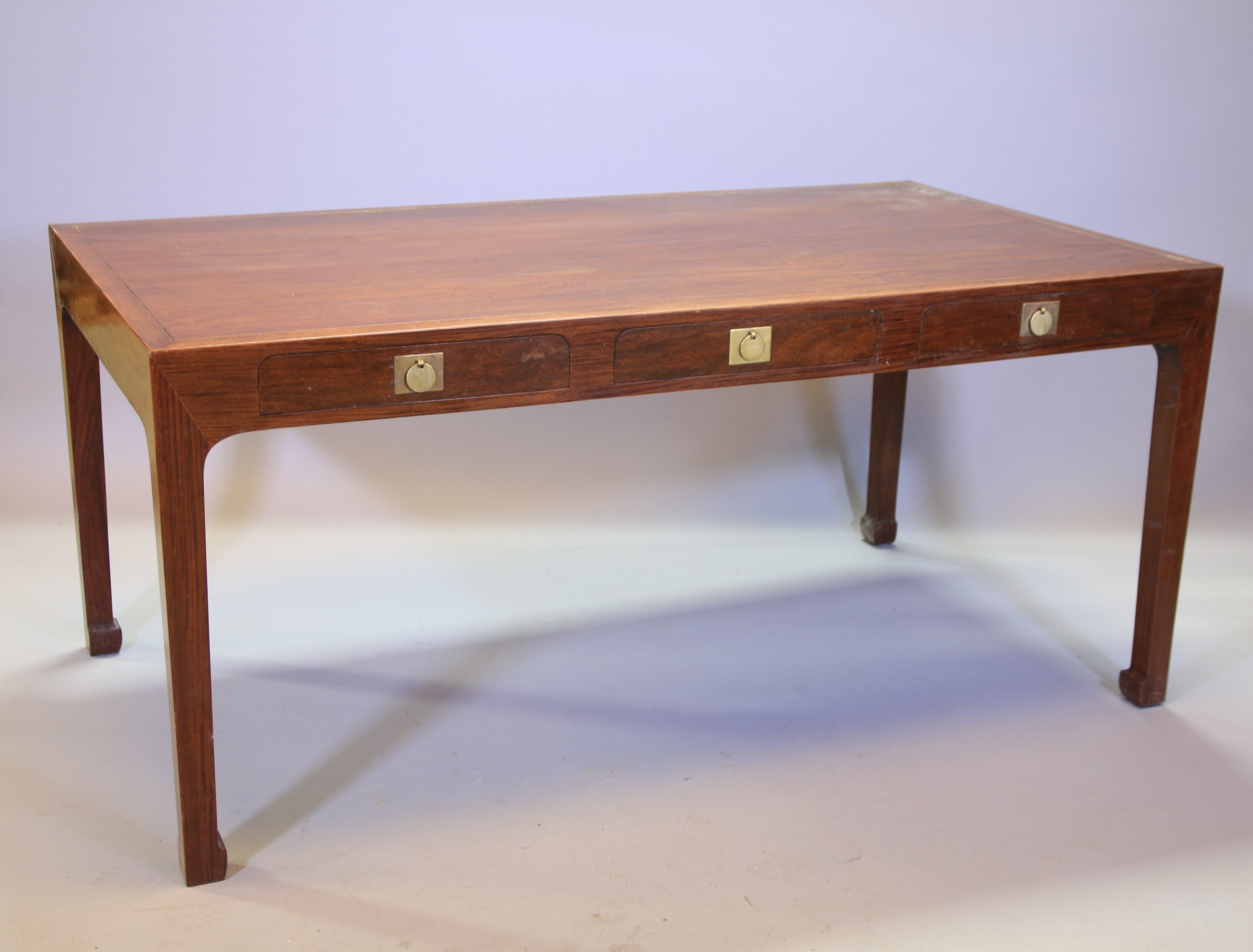 en palissandre et placage de palissandre. Il ouvre par trois tiroirs en ceinture et repose sur quatre pieds en gaine.