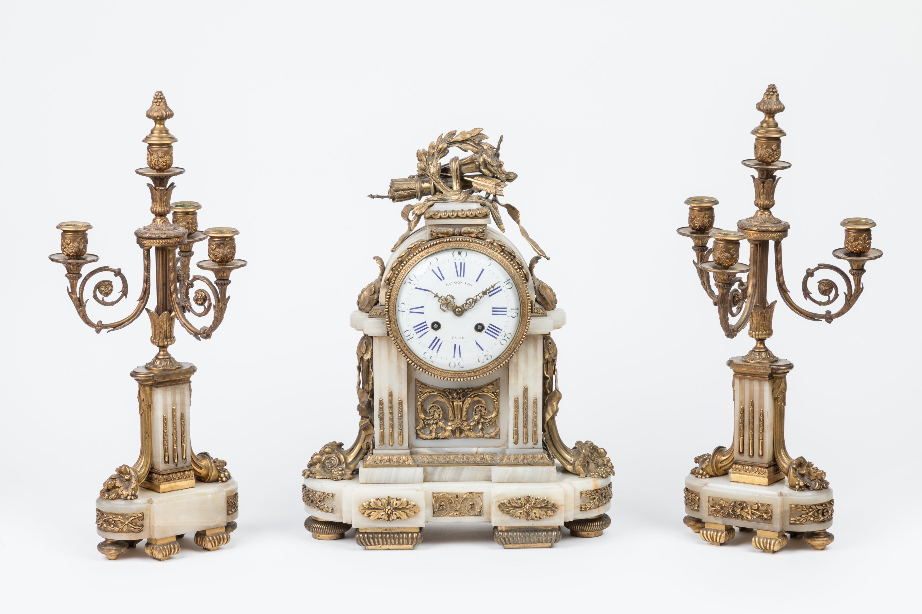 The Raingo Frères Company, Napoléon III Period. An onyx and ormolu mantel clock and matching pair of candelabras.