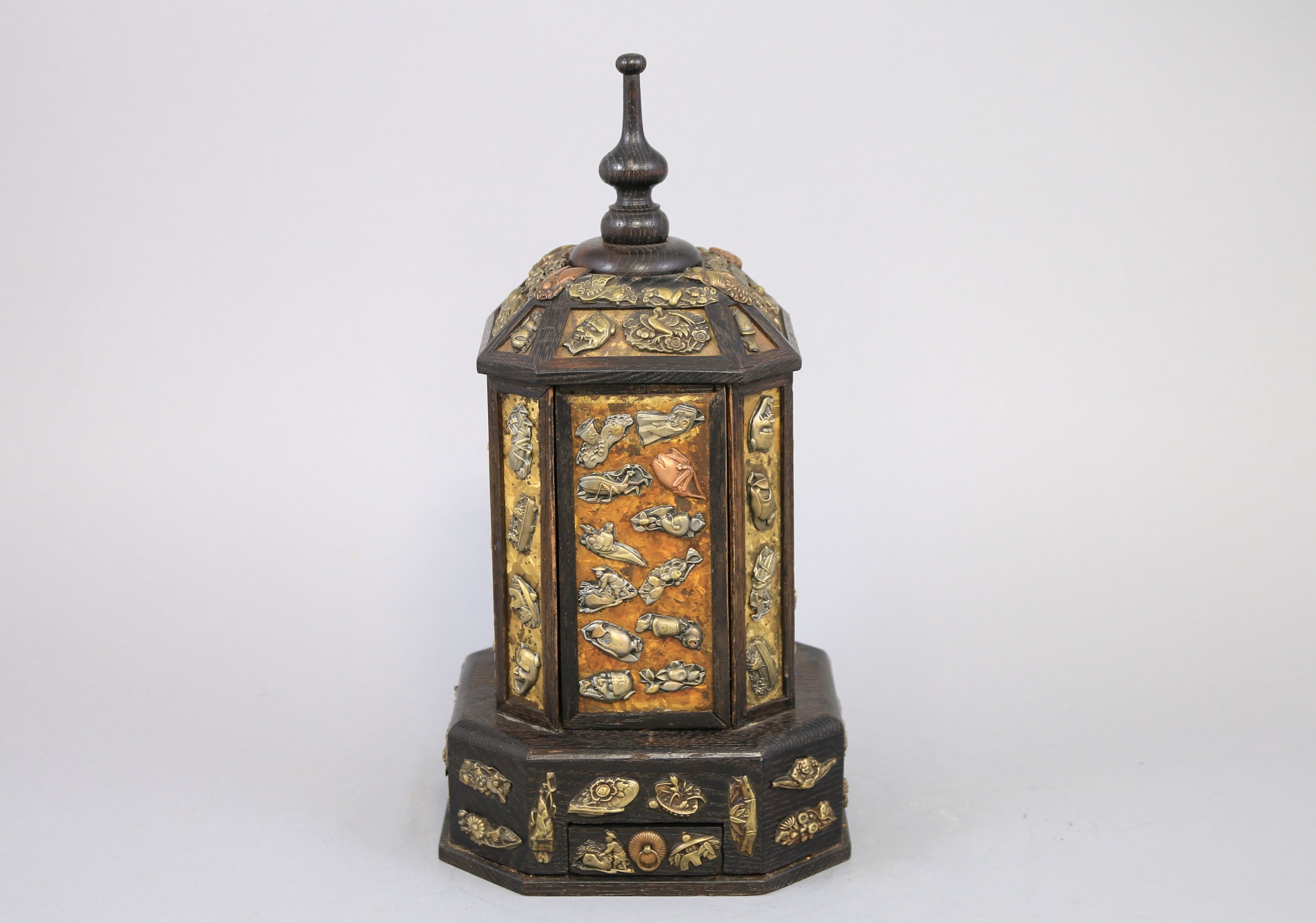 octogonale en bois laqué noire, sommée d'une poignée tournante en forme de toupie actionnant mécaniquement l'ouverture des quatre vantaux composés d'anneaux et tablettes. L'ensemble est décoré d'une centaine de menuki japonais en métal repoussé et autres boutons sur fond de cuivre. La base octogonale à pans coupés ouivre par un petit tiroir.