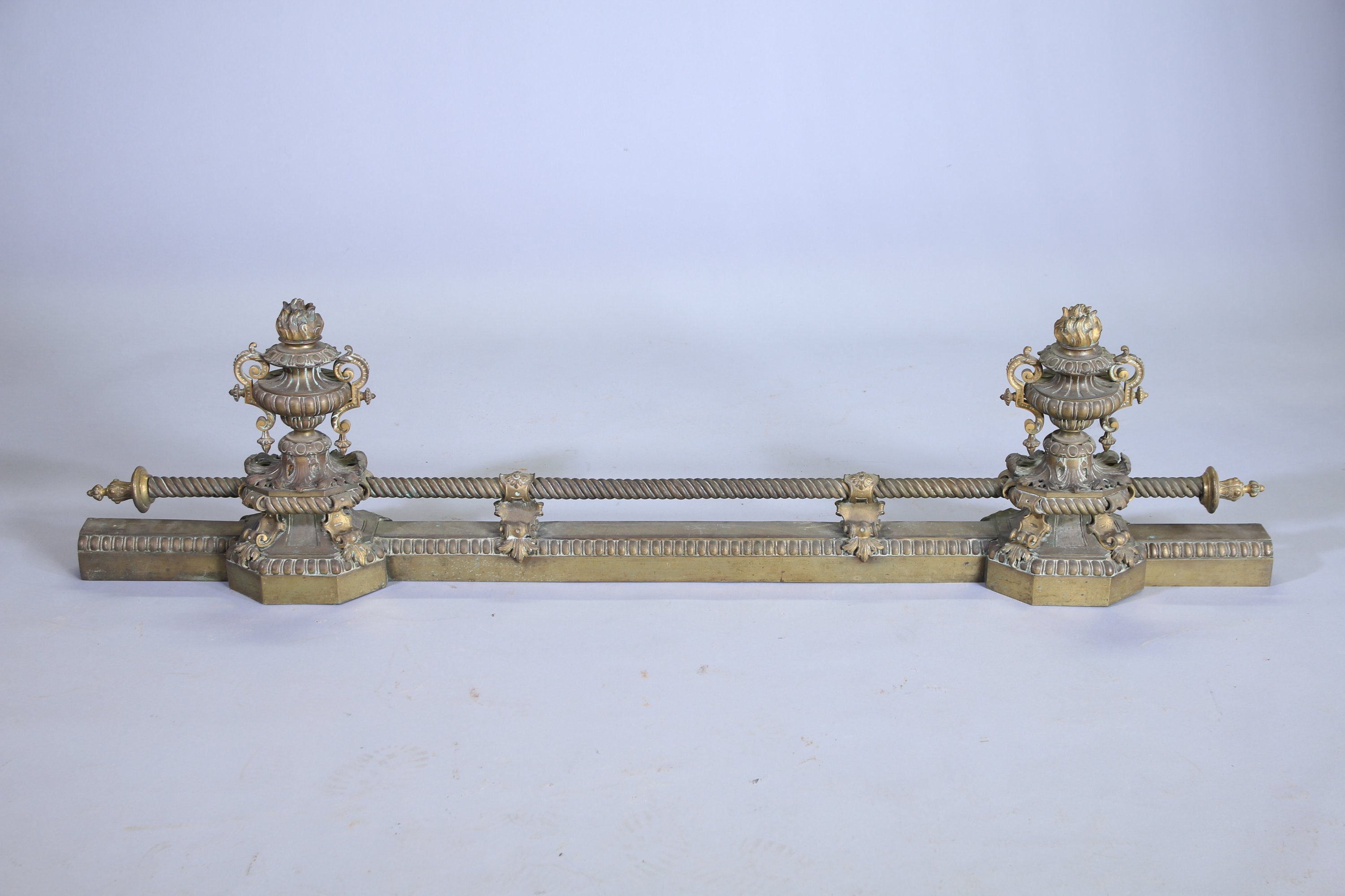 en bronze. Elle se compose de deux pots à feu à large décor de godrons reposant sur une terrasse végétale. Ils soutiennent une barre à torsadée soulignée de perles.
