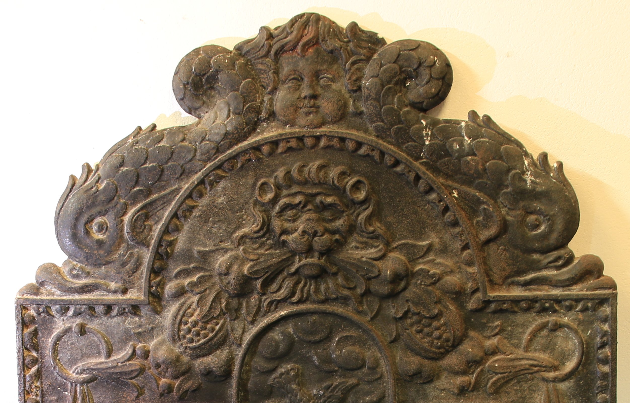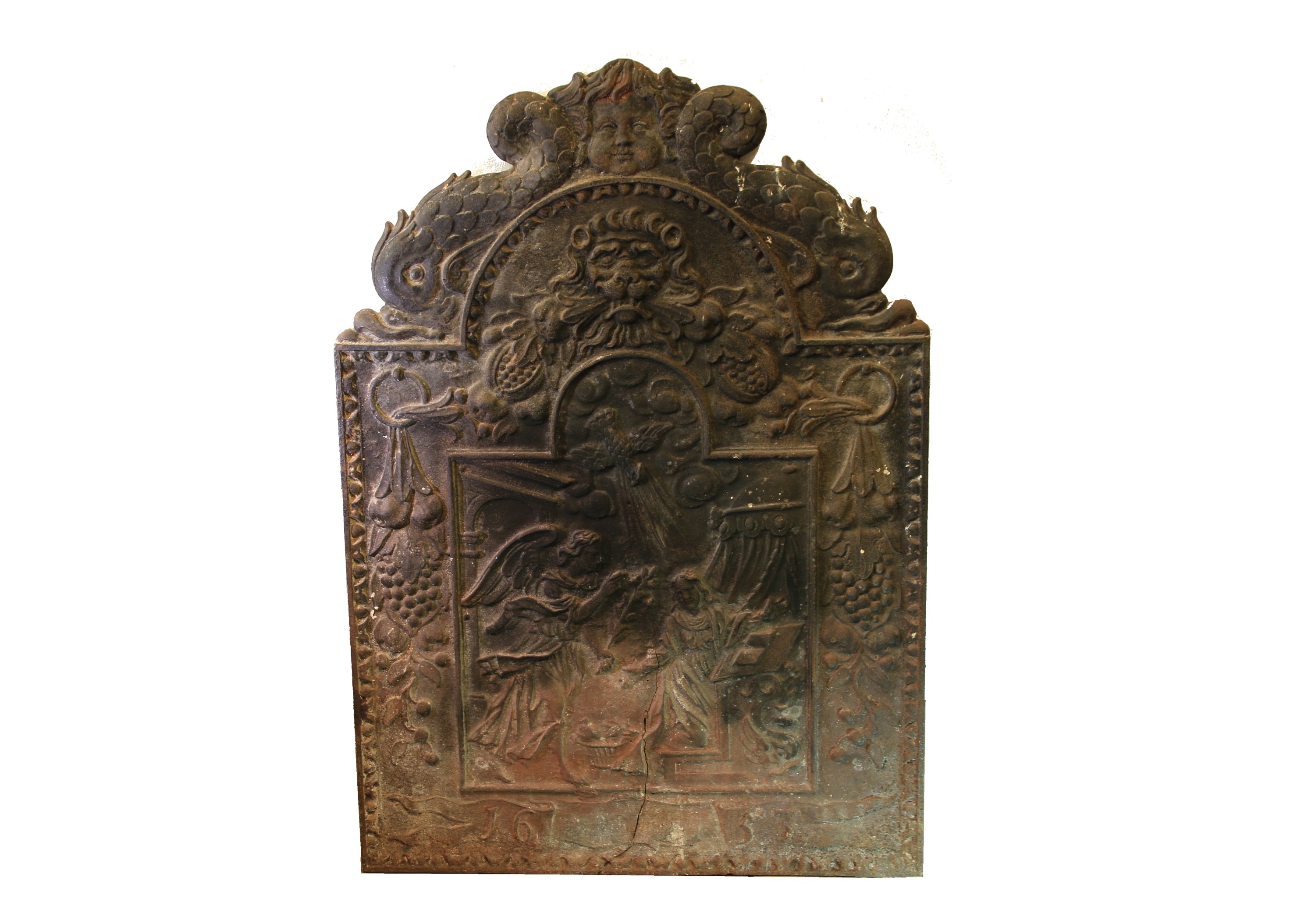 en fonte de fer à décor d'une Annonciation, fronton au mufle de lion surmonté de deux dauphins.
