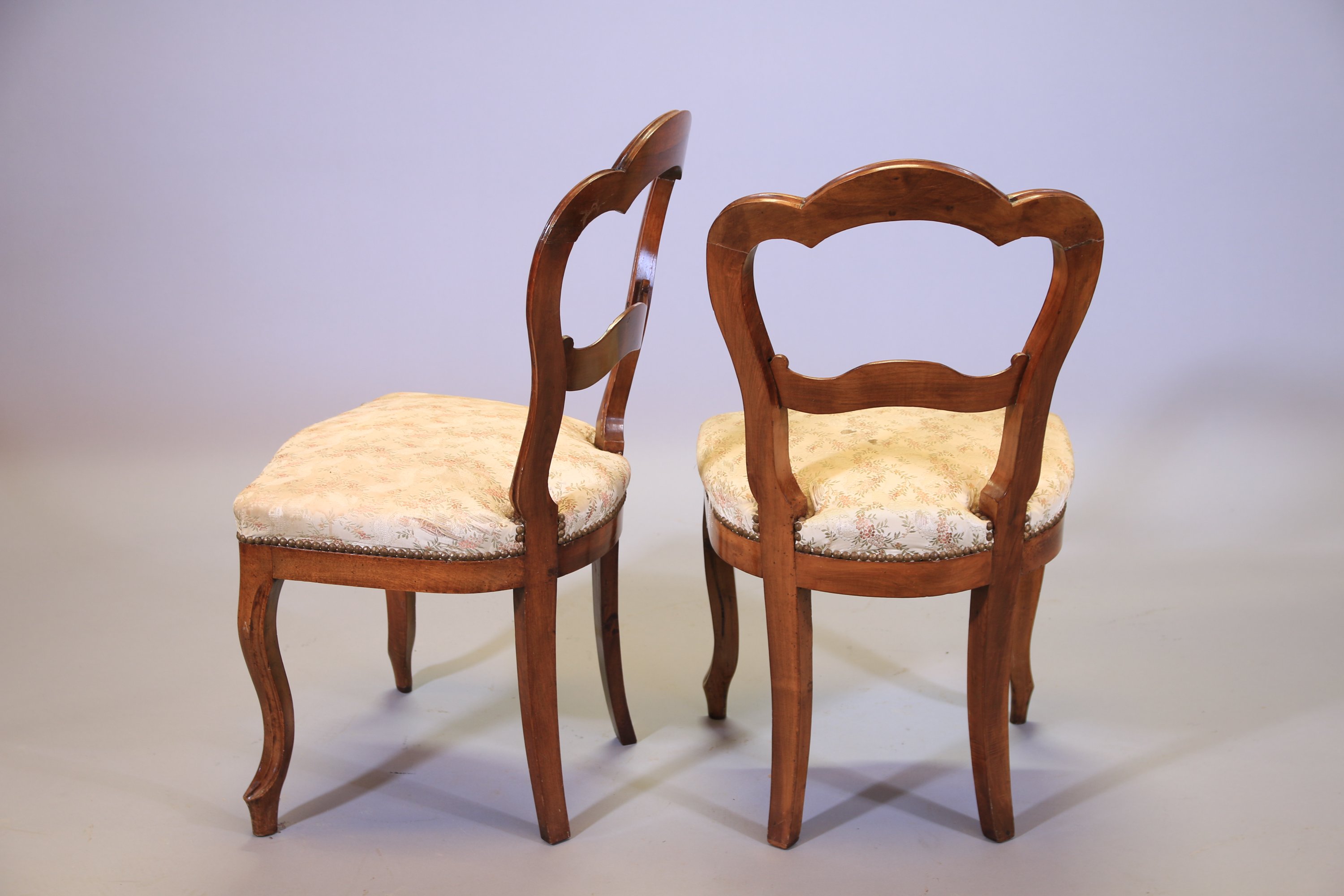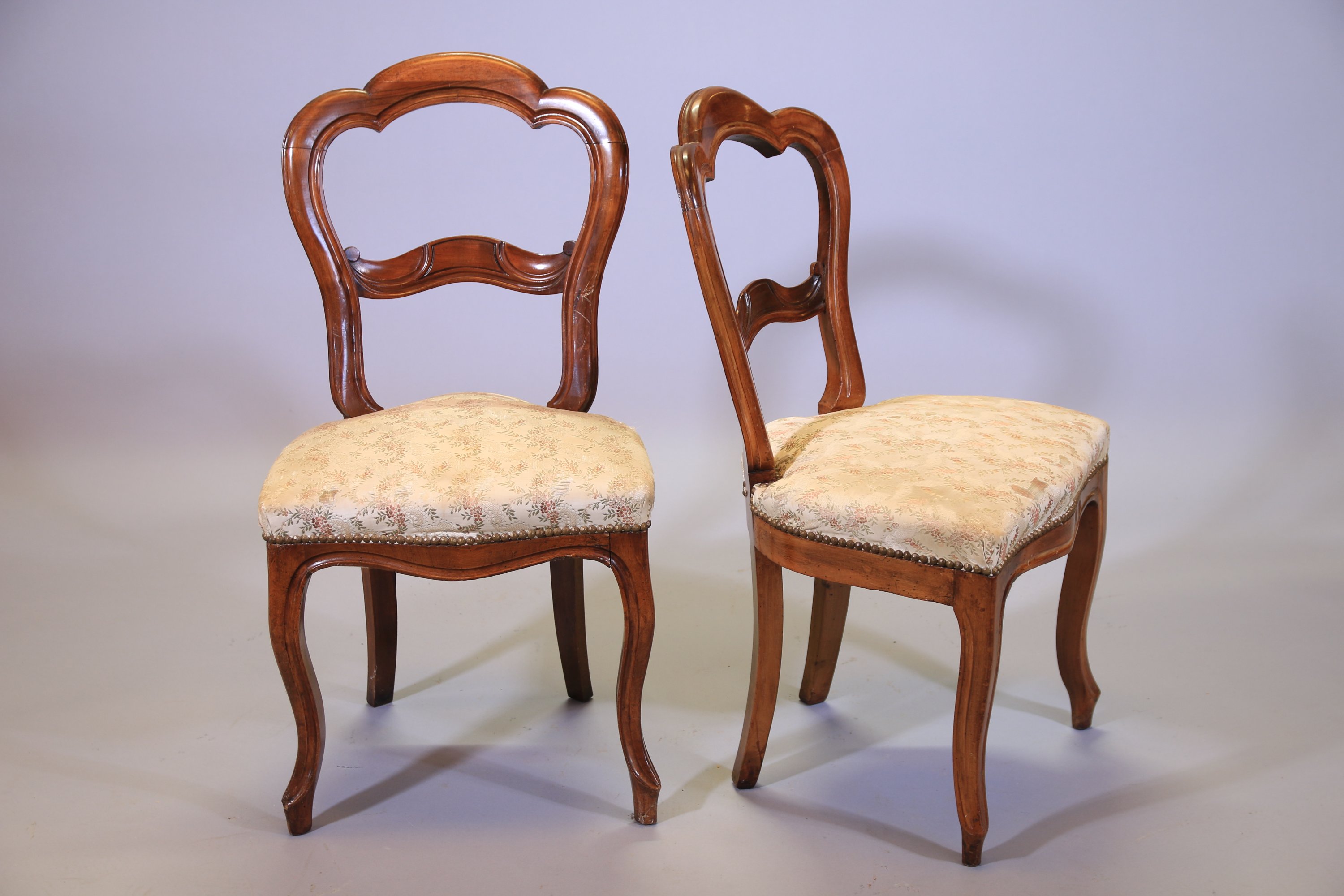 en noyer. Les dossiers ajourés et mouvementés se terminent en trilobe, les ceintures sont chantournées. Les pieds antérieurs sont galbés et les postérieurs en sabre.