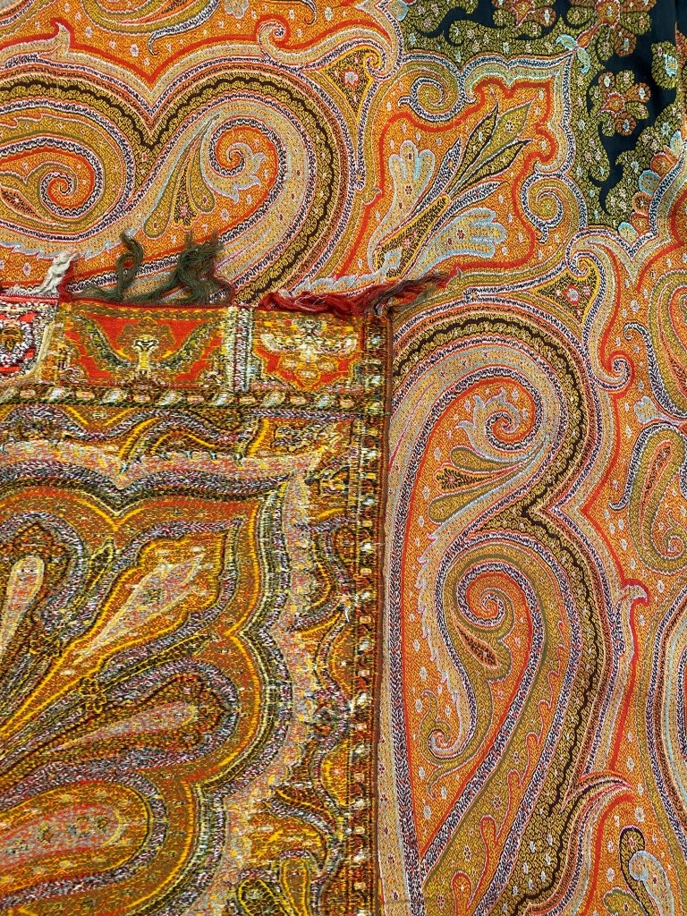 fond rouge, décor cachemire à cinq couleurs de palmes enroulées de part et d’autre d’une réserve étoilée noire.