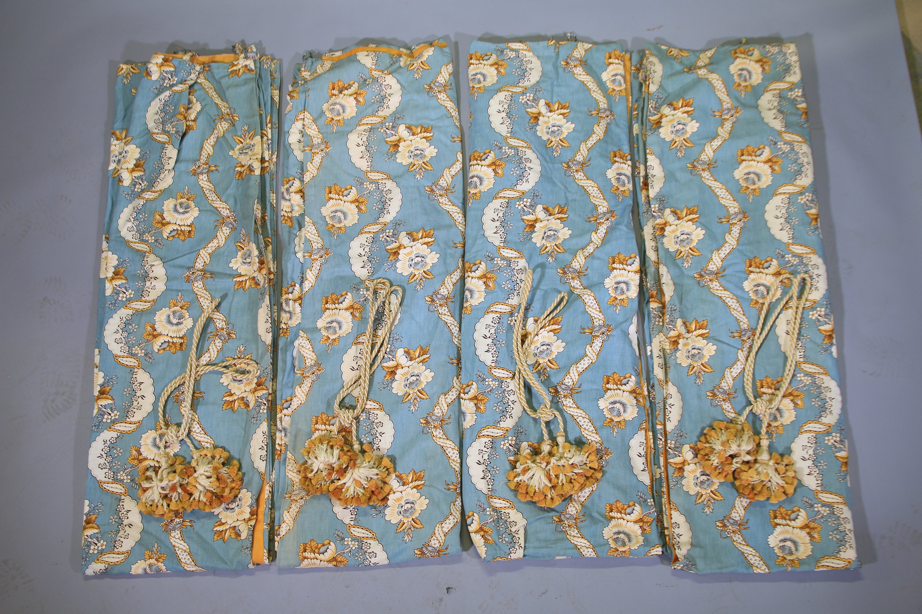 en coton, à décor de végétaux et de fleurs sur fond bleu ciel, doublure or, avec quatre embrasses à pompons.