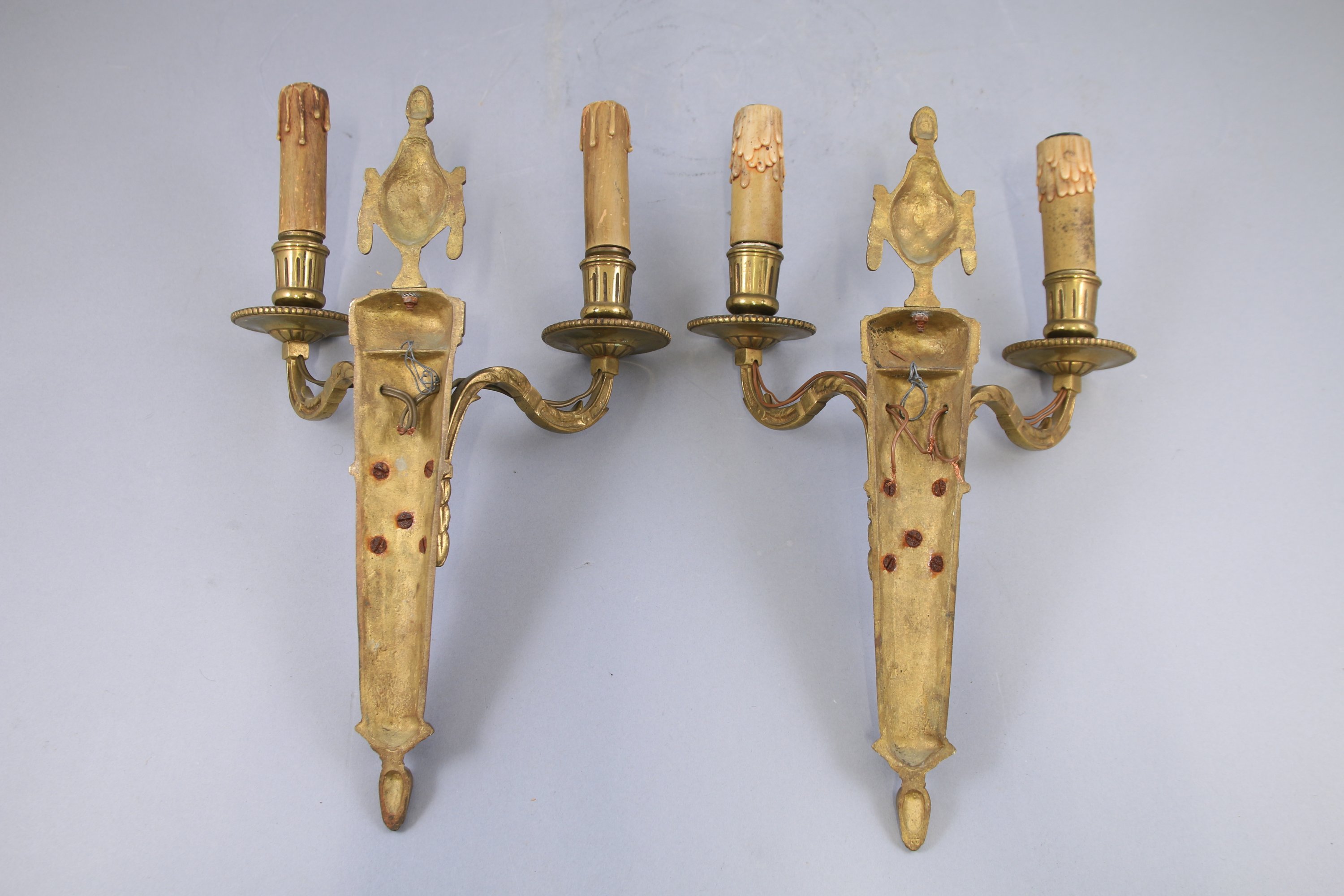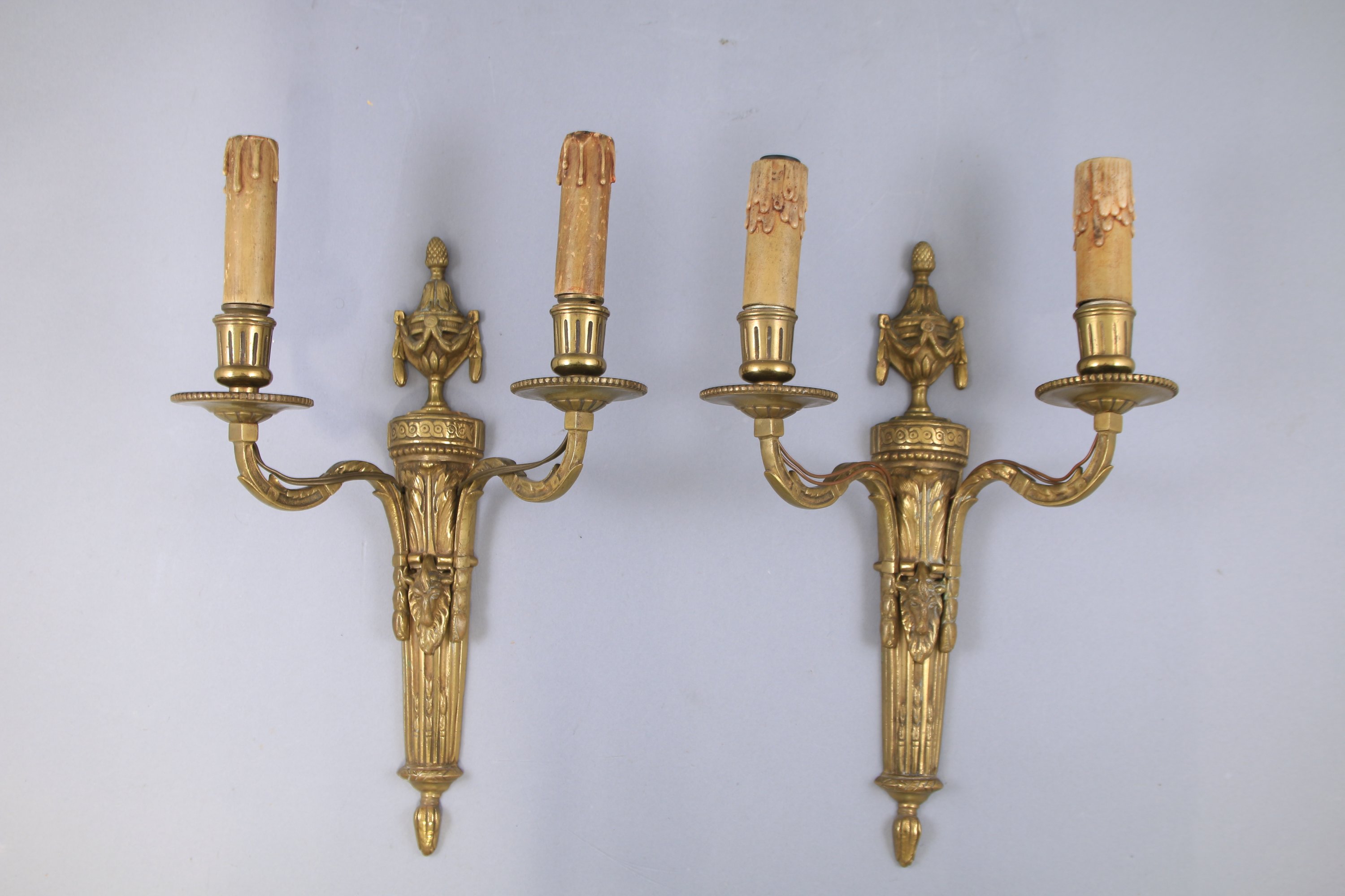 en bronze doré à deux bras de lumière. Le fût en forme de carquois cannelé à décor d'une tête de bélier et feuille d'acanthe et surmonté d'un vase couvert.