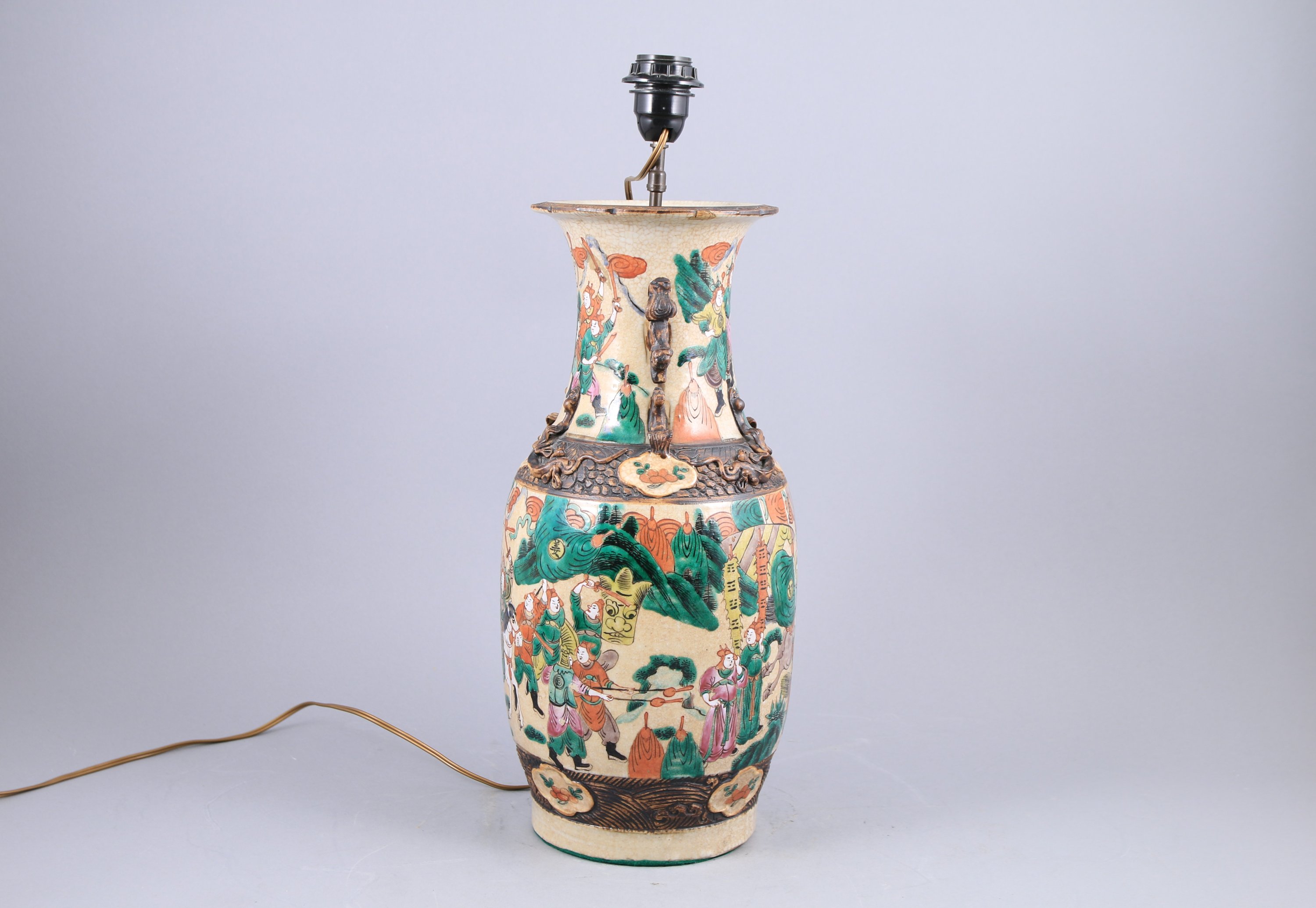 en porcelaine craquelée à décor polychrome d'une scène de bataille. Le col rehaussé de chiens de phô affrontés se prolongeant sur l'épaule de qilong. Le pied est orné de cartouche aux pêches.